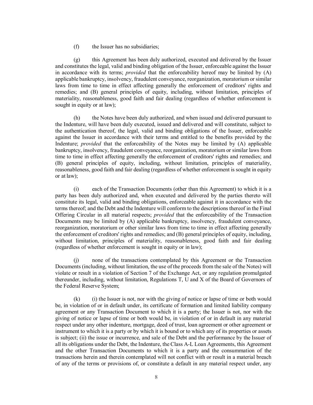 8 (f) the Issuer has no subsidiaries; (g) this Agreement has been duly authorized, executed and delivered by the Issuer and constitutes the legal, valid and binding obligation of the Issuer, enforceable against the Issuer in accordance with its terms; provided that the enforceability hereof may be limited by (A) applicable bankruptcy, insolvency, fraudulent conveyance, reorganization, moratorium or similar laws from time to time in effect affecting generally the enforcement of creditors' rights and remedies; and (B) general principles of equity, including, without limitation, principles of materiality, reasonableness, good faith and fair dealing (regardless of whether enforcement is sought in equity or at law); (h) the Notes have been duly authorized, and when issued and delivered pursuant to the Indenture, will have been duly executed, issued and delivered and will constitute, subject to the authentication thereof, the legal, valid and binding obligations of the Issuer, enforceable against the Issuer in accordance with their terms and entitled to the benefits provided by the Indenture; provided that the enforceability of the Notes may be limited by (A) applicable bankruptcy, insolvency, fraudulent conveyance, reorganization, moratorium or similar laws from time to time in effect affecting generally the enforcement of creditors' rights and remedies; and (B) general principles of equity, including, without limitation, principles of materiality, reasonableness, good faith and fair dealing (regardless of whether enforcement is sought in equity or at law); (i) each of the Transaction Documents (other than this Agreement) to which it is a party has been duly authorized and, when executed and delivered by the parties thereto will constitute its legal, valid and binding obligations, enforceable against it in accordance with the terms thereof; and the Debt and the Indenture will conform to the descriptions thereof in the Final Offering Circular in all material respects; provided that the enforceability of the Transaction Documents may be limited by (A) applicable bankruptcy, insolvency, fraudulent conveyance, reorganization, moratorium or other similar laws from time to time in effect affecting generally the enforcement of creditors' rights and remedies; and (B) general principles of equity, including, without limitation, principles of materiality, reasonableness, good faith and fair dealing (regardless of whether enforcement is sought in equity or in law); (j) none of the transactions contemplated by this Agreement or the Transaction Documents (including, without limitation, the use of the proceeds from the sale of the Notes) will violate or result in a violation of Section 7 of the Exchange Act, or any regulation promulgated thereunder, including, without limitation, Regulations T, U and X of the Board of Governors of the Federal Reserve System; (k) (i) the Issuer is not, nor with the giving of notice or lapse of time or both would be, in violation of or in default under, its certificate of formation and limited liability company agreement or any Transaction Document to which it is a party; the Issuer is not, nor with the giving of notice or lapse of time or both would be, in violation of or in default in any material respect under any other indenture, mortgage, deed of trust, loan agreement or other agreement or instrument to which it is a party or by which it is bound or to which any of its properties or assets is subject; (ii) the issue or incurrence, and sale of the Debt and the performance by the Issuer of all its obligations under the Debt, the Indenture, the Class A-L Loan Agreements, this Agreement and the other Transaction Documents to which it is a party and the consummation of the transactions herein and therein contemplated will not conflict with or result in a material breach of any of the terms or provisions of, or constitute a default in any material respect under, any