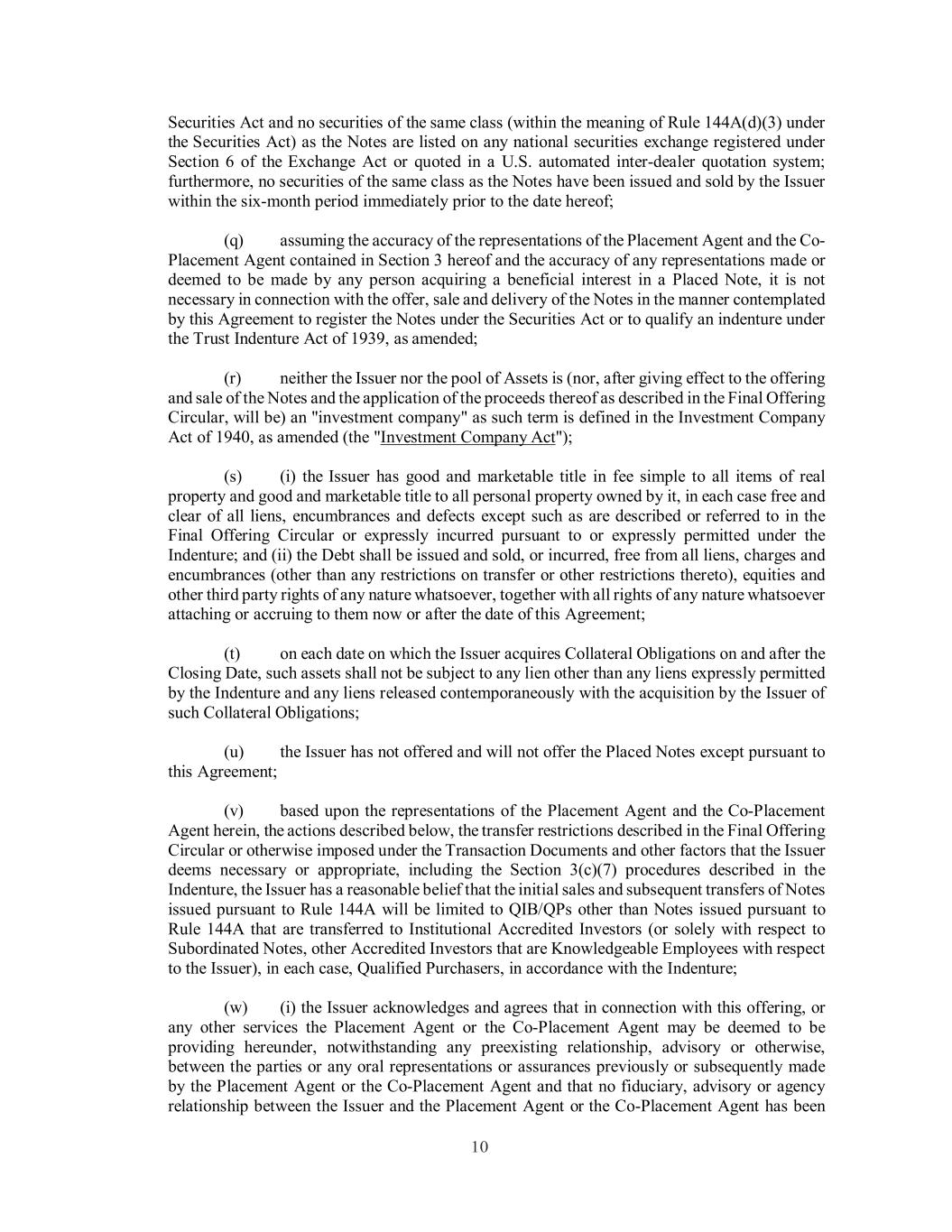 10 Securities Act and no securities of the same class (within the meaning of Rule 144A(d)(3) under the Securities Act) as the Notes are listed on any national securities exchange registered under Section 6 of the Exchange Act or quoted in a U.S. automated inter-dealer quotation system; furthermore, no securities of the same class as the Notes have been issued and sold by the Issuer within the six-month period immediately prior to the date hereof; (q) assuming the accuracy of the representations of the Placement Agent and the Co- Placement Agent contained in Section 3 hereof and the accuracy of any representations made or deemed to be made by any person acquiring a beneficial interest in a Placed Note, it is not necessary in connection with the offer, sale and delivery of the Notes in the manner contemplated by this Agreement to register the Notes under the Securities Act or to qualify an indenture under the Trust Indenture Act of 1939, as amended; (r) neither the Issuer nor the pool of Assets is (nor, after giving effect to the offering and sale of the Notes and the application of the proceeds thereof as described in the Final Offering Circular, will be) an "investment company" as such term is defined in the Investment Company Act of 1940, as amended (the "Investment Company Act"); (s) (i) the Issuer has good and marketable title in fee simple to all items of real property and good and marketable title to all personal property owned by it, in each case free and clear of all liens, encumbrances and defects except such as are described or referred to in the Final Offering Circular or expressly incurred pursuant to or expressly permitted under the Indenture; and (ii) the Debt shall be issued and sold, or incurred, free from all liens, charges and encumbrances (other than any restrictions on transfer or other restrictions thereto), equities and other third party rights of any nature whatsoever, together with all rights of any nature whatsoever attaching or accruing to them now or after the date of this Agreement; (t) on each date on which the Issuer acquires Collateral Obligations on and after the Closing Date, such assets shall not be subject to any lien other than any liens expressly permitted by the Indenture and any liens released contemporaneously with the acquisition by the Issuer of such Collateral Obligations; (u) the Issuer has not offered and will not offer the Placed Notes except pursuant to this Agreement; (v) based upon the representations of the Placement Agent and the Co-Placement Agent herein, the actions described below, the transfer restrictions described in the Final Offering Circular or otherwise imposed under the Transaction Documents and other factors that the Issuer deems necessary or appropriate, including the Section 3(c)(7) procedures described in the Indenture, the Issuer has a reasonable belief that the initial sales and subsequent transfers of Notes issued pursuant to Rule 144A will be limited to QIB/QPs other than Notes issued pursuant to Rule 144A that are transferred to Institutional Accredited Investors (or solely with respect to Subordinated Notes, other Accredited Investors that are Knowledgeable Employees with respect to the Issuer), in each case, Qualified Purchasers, in accordance with the Indenture; (w) (i) the Issuer acknowledges and agrees that in connection with this offering, or any other services the Placement Agent or the Co-Placement Agent may be deemed to be providing hereunder, notwithstanding any preexisting relationship, advisory or otherwise, between the parties or any oral representations or assurances previously or subsequently made by the Placement Agent or the Co-Placement Agent and that no fiduciary, advisory or agency relationship between the Issuer and the Placement Agent or the Co-Placement Agent has been