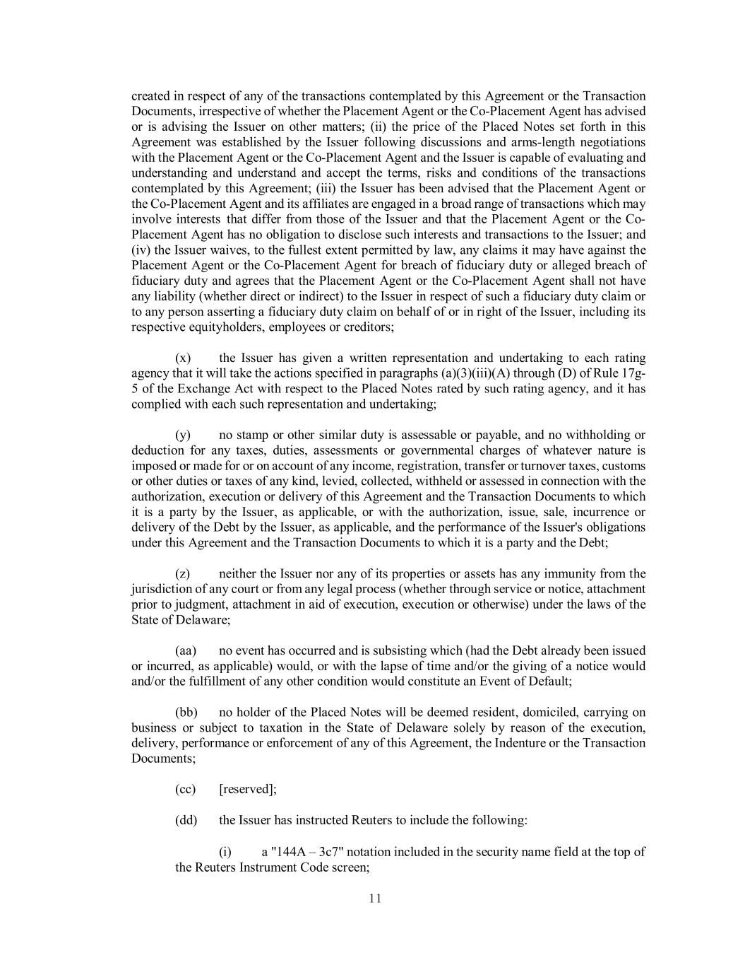 11 created in respect of any of the transactions contemplated by this Agreement or the Transaction Documents, irrespective of whether the Placement Agent or the Co-Placement Agent has advised or is advising the Issuer on other matters; (ii) the price of the Placed Notes set forth in this Agreement was established by the Issuer following discussions and arms-length negotiations with the Placement Agent or the Co-Placement Agent and the Issuer is capable of evaluating and understanding and understand and accept the terms, risks and conditions of the transactions contemplated by this Agreement; (iii) the Issuer has been advised that the Placement Agent or the Co-Placement Agent and its affiliates are engaged in a broad range of transactions which may involve interests that differ from those of the Issuer and that the Placement Agent or the Co- Placement Agent has no obligation to disclose such interests and transactions to the Issuer; and (iv) the Issuer waives, to the fullest extent permitted by law, any claims it may have against the Placement Agent or the Co-Placement Agent for breach of fiduciary duty or alleged breach of fiduciary duty and agrees that the Placement Agent or the Co-Placement Agent shall not have any liability (whether direct or indirect) to the Issuer in respect of such a fiduciary duty claim or to any person asserting a fiduciary duty claim on behalf of or in right of the Issuer, including its respective equityholders, employees or creditors; (x) the Issuer has given a written representation and undertaking to each rating agency that it will take the actions specified in paragraphs (a)(3)(iii)(A) through (D) of Rule 17g- 5 of the Exchange Act with respect to the Placed Notes rated by such rating agency, and it has complied with each such representation and undertaking; (y) no stamp or other similar duty is assessable or payable, and no withholding or deduction for any taxes, duties, assessments or governmental charges of whatever nature is imposed or made for or on account of any income, registration, transfer or turnover taxes, customs or other duties or taxes of any kind, levied, collected, withheld or assessed in connection with the authorization, execution or delivery of this Agreement and the Transaction Documents to which it is a party by the Issuer, as applicable, or with the authorization, issue, sale, incurrence or delivery of the Debt by the Issuer, as applicable, and the performance of the Issuer's obligations under this Agreement and the Transaction Documents to which it is a party and the Debt; (z) neither the Issuer nor any of its properties or assets has any immunity from the jurisdiction of any court or from any legal process (whether through service or notice, attachment prior to judgment, attachment in aid of execution, execution or otherwise) under the laws of the State of Delaware; (aa) no event has occurred and is subsisting which (had the Debt already been issued or incurred, as applicable) would, or with the lapse of time and/or the giving of a notice would and/or the fulfillment of any other condition would constitute an Event of Default; (bb) no holder of the Placed Notes will be deemed resident, domiciled, carrying on business or subject to taxation in the State of Delaware solely by reason of the execution, delivery, performance or enforcement of any of this Agreement, the Indenture or the Transaction Documents; (cc) [reserved]; (dd) the Issuer has instructed Reuters to include the following: (i) a "144A – 3c7" notation included in the security name field at the top of the Reuters Instrument Code screen;