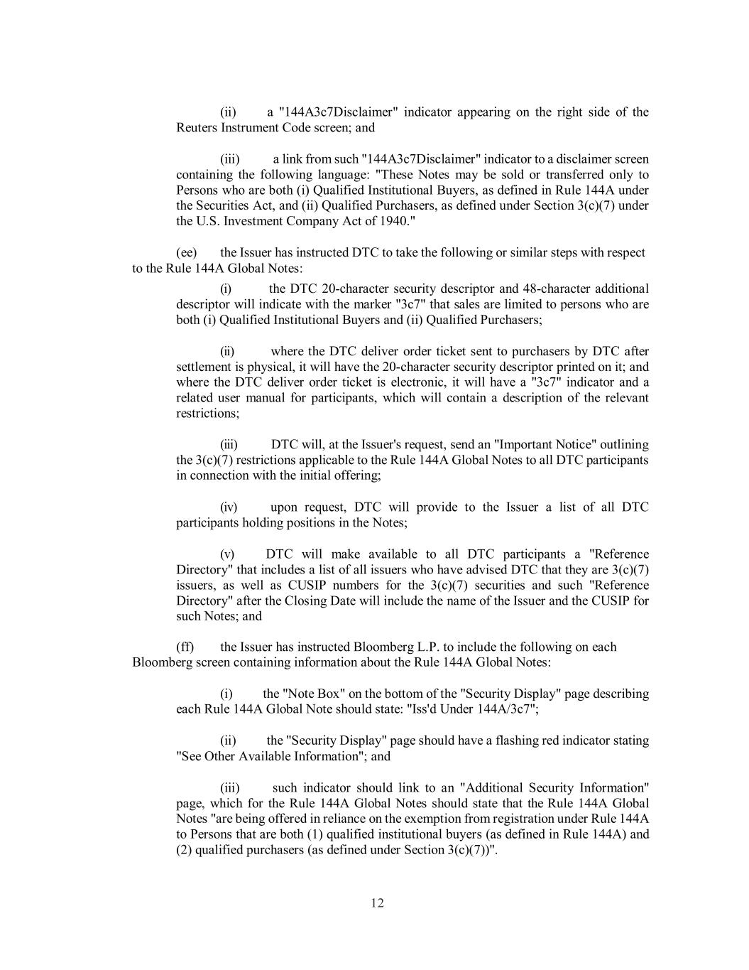 12 (ii) a "144A3c7Disclaimer" indicator appearing on the right side of the Reuters Instrument Code screen; and (iii) a link from such "144A3c7Disclaimer" indicator to a disclaimer screen containing the following language: "These Notes may be sold or transferred only to Persons who are both (i) Qualified Institutional Buyers, as defined in Rule 144A under the Securities Act, and (ii) Qualified Purchasers, as defined under Section 3(c)(7) under the U.S. Investment Company Act of 1940." (ee) the Issuer has instructed DTC to take the following or similar steps with respect to the Rule 144A Global Notes: (i) the DTC 20-character security descriptor and 48-character additional descriptor will indicate with the marker "3c7" that sales are limited to persons who are both (i) Qualified Institutional Buyers and (ii) Qualified Purchasers; (ii) where the DTC deliver order ticket sent to purchasers by DTC after settlement is physical, it will have the 20-character security descriptor printed on it; and where the DTC deliver order ticket is electronic, it will have a "3c7" indicator and a related user manual for participants, which will contain a description of the relevant restrictions; (iii) DTC will, at the Issuer's request, send an "Important Notice" outlining the 3(c)(7) restrictions applicable to the Rule 144A Global Notes to all DTC participants in connection with the initial offering; (iv) upon request, DTC will provide to the Issuer a list of all DTC participants holding positions in the Notes; (v) DTC will make available to all DTC participants a "Reference Directory" that includes a list of all issuers who have advised DTC that they are 3(c)(7) issuers, as well as CUSIP numbers for the 3(c)(7) securities and such "Reference Directory" after the Closing Date will include the name of the Issuer and the CUSIP for such Notes; and (ff) the Issuer has instructed Bloomberg L.P. to include the following on each Bloomberg screen containing information about the Rule 144A Global Notes: (i) the "Note Box" on the bottom of the "Security Display" page describing each Rule 144A Global Note should state: "Iss'd Under 144A/3c7"; (ii) the "Security Display" page should have a flashing red indicator stating "See Other Available Information"; and (iii) such indicator should link to an "Additional Security Information" page, which for the Rule 144A Global Notes should state that the Rule 144A Global Notes "are being offered in reliance on the exemption from registration under Rule 144A to Persons that are both (1) qualified institutional buyers (as defined in Rule 144A) and (2) qualified purchasers (as defined under Section 3(c)(7))".