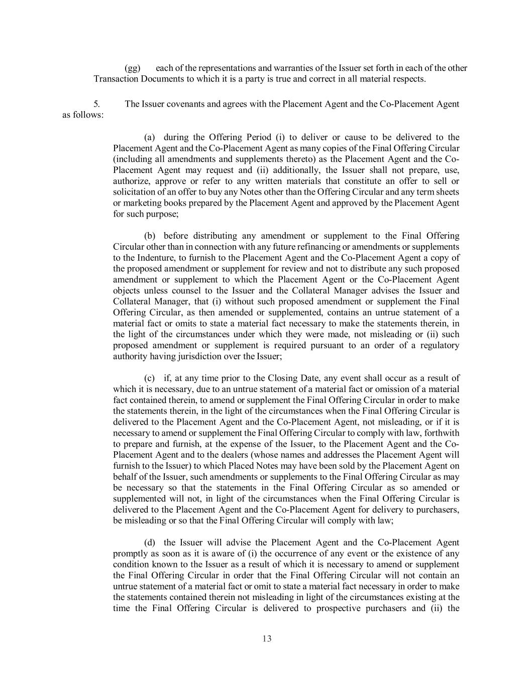 13 (gg) each of the representations and warranties of the Issuer set forth in each of the other Transaction Documents to which it is a party is true and correct in all material respects. 5. The Issuer covenants and agrees with the Placement Agent and the Co-Placement Agent as follows: (a) during the Offering Period (i) to deliver or cause to be delivered to the Placement Agent and the Co-Placement Agent as many copies of the Final Offering Circular (including all amendments and supplements thereto) as the Placement Agent and the Co- Placement Agent may request and (ii) additionally, the Issuer shall not prepare, use, authorize, approve or refer to any written materials that constitute an offer to sell or solicitation of an offer to buy any Notes other than the Offering Circular and any term sheets or marketing books prepared by the Placement Agent and approved by the Placement Agent for such purpose; (b) before distributing any amendment or supplement to the Final Offering Circular other than in connection with any future refinancing or amendments or supplements to the Indenture, to furnish to the Placement Agent and the Co-Placement Agent a copy of the proposed amendment or supplement for review and not to distribute any such proposed amendment or supplement to which the Placement Agent or the Co-Placement Agent objects unless counsel to the Issuer and the Collateral Manager advises the Issuer and Collateral Manager, that (i) without such proposed amendment or supplement the Final Offering Circular, as then amended or supplemented, contains an untrue statement of a material fact or omits to state a material fact necessary to make the statements therein, in the light of the circumstances under which they were made, not misleading or (ii) such proposed amendment or supplement is required pursuant to an order of a regulatory authority having jurisdiction over the Issuer; (c) if, at any time prior to the Closing Date, any event shall occur as a result of which it is necessary, due to an untrue statement of a material fact or omission of a material fact contained therein, to amend or supplement the Final Offering Circular in order to make the statements therein, in the light of the circumstances when the Final Offering Circular is delivered to the Placement Agent and the Co-Placement Agent, not misleading, or if it is necessary to amend or supplement the Final Offering Circular to comply with law, forthwith to prepare and furnish, at the expense of the Issuer, to the Placement Agent and the Co- Placement Agent and to the dealers (whose names and addresses the Placement Agent will furnish to the Issuer) to which Placed Notes may have been sold by the Placement Agent on behalf of the Issuer, such amendments or supplements to the Final Offering Circular as may be necessary so that the statements in the Final Offering Circular as so amended or supplemented will not, in light of the circumstances when the Final Offering Circular is delivered to the Placement Agent and the Co-Placement Agent for delivery to purchasers, be misleading or so that the Final Offering Circular will comply with law; (d) the Issuer will advise the Placement Agent and the Co-Placement Agent promptly as soon as it is aware of (i) the occurrence of any event or the existence of any condition known to the Issuer as a result of which it is necessary to amend or supplement the Final Offering Circular in order that the Final Offering Circular will not contain an untrue statement of a material fact or omit to state a material fact necessary in order to make the statements contained therein not misleading in light of the circumstances existing at the time the Final Offering Circular is delivered to prospective purchasers and (ii) the