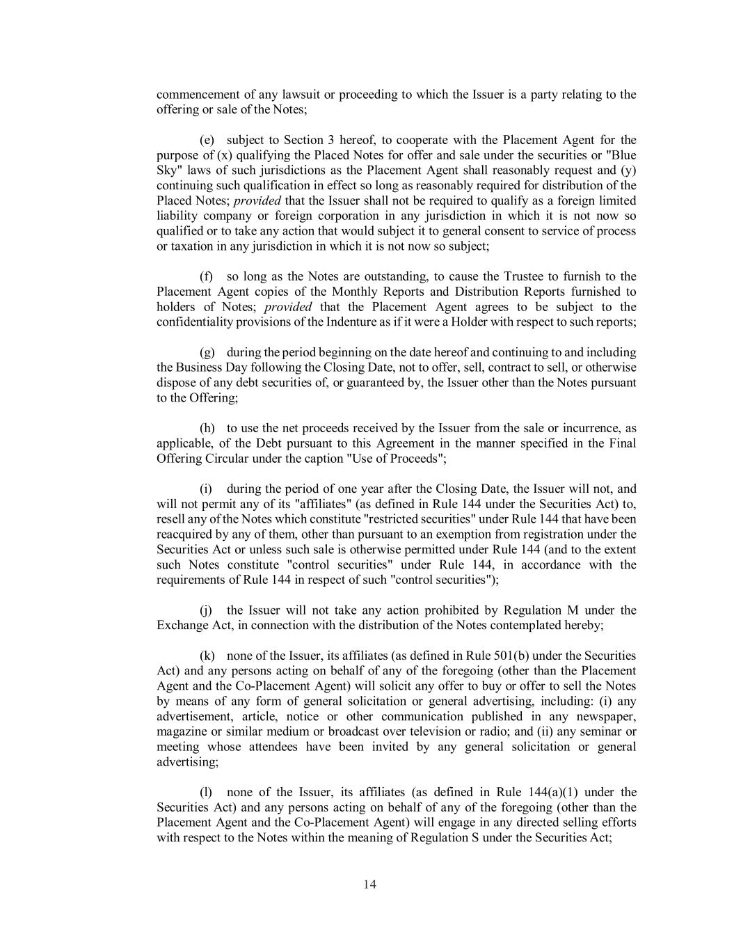 14 commencement of any lawsuit or proceeding to which the Issuer is a party relating to the offering or sale of the Notes; (e) subject to Section 3 hereof, to cooperate with the Placement Agent for the purpose of (x) qualifying the Placed Notes for offer and sale under the securities or "Blue Sky" laws of such jurisdictions as the Placement Agent shall reasonably request and (y) continuing such qualification in effect so long as reasonably required for distribution of the Placed Notes; provided that the Issuer shall not be required to qualify as a foreign limited liability company or foreign corporation in any jurisdiction in which it is not now so qualified or to take any action that would subject it to general consent to service of process or taxation in any jurisdiction in which it is not now so subject; (f) so long as the Notes are outstanding, to cause the Trustee to furnish to the Placement Agent copies of the Monthly Reports and Distribution Reports furnished to holders of Notes; provided that the Placement Agent agrees to be subject to the confidentiality provisions of the Indenture as if it were a Holder with respect to such reports; (g) during the period beginning on the date hereof and continuing to and including the Business Day following the Closing Date, not to offer, sell, contract to sell, or otherwise dispose of any debt securities of, or guaranteed by, the Issuer other than the Notes pursuant to the Offering; (h) to use the net proceeds received by the Issuer from the sale or incurrence, as applicable, of the Debt pursuant to this Agreement in the manner specified in the Final Offering Circular under the caption "Use of Proceeds"; (i) during the period of one year after the Closing Date, the Issuer will not, and will not permit any of its "affiliates" (as defined in Rule 144 under the Securities Act) to, resell any of the Notes which constitute "restricted securities" under Rule 144 that have been reacquired by any of them, other than pursuant to an exemption from registration under the Securities Act or unless such sale is otherwise permitted under Rule 144 (and to the extent such Notes constitute "control securities" under Rule 144, in accordance with the requirements of Rule 144 in respect of such "control securities"); (j) the Issuer will not take any action prohibited by Regulation M under the Exchange Act, in connection with the distribution of the Notes contemplated hereby; (k) none of the Issuer, its affiliates (as defined in Rule 501(b) under the Securities Act) and any persons acting on behalf of any of the foregoing (other than the Placement Agent and the Co-Placement Agent) will solicit any offer to buy or offer to sell the Notes by means of any form of general solicitation or general advertising, including: (i) any advertisement, article, notice or other communication published in any newspaper, magazine or similar medium or broadcast over television or radio; and (ii) any seminar or meeting whose attendees have been invited by any general solicitation or general advertising; (l) none of the Issuer, its affiliates (as defined in Rule 144(a)(1) under the Securities Act) and any persons acting on behalf of any of the foregoing (other than the Placement Agent and the Co-Placement Agent) will engage in any directed selling efforts with respect to the Notes within the meaning of Regulation S under the Securities Act;