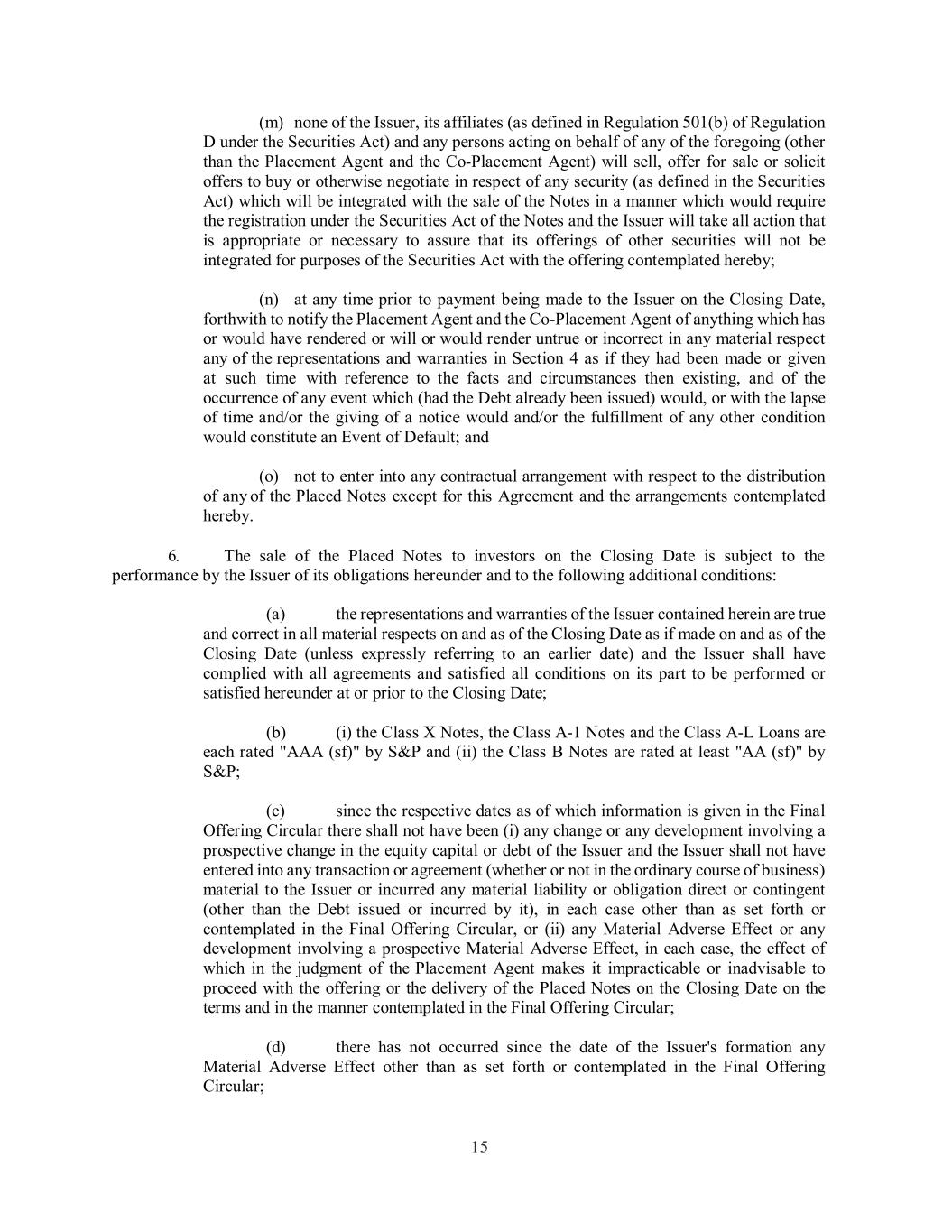 15 (m) none of the Issuer, its affiliates (as defined in Regulation 501(b) of Regulation D under the Securities Act) and any persons acting on behalf of any of the foregoing (other than the Placement Agent and the Co-Placement Agent) will sell, offer for sale or solicit offers to buy or otherwise negotiate in respect of any security (as defined in the Securities Act) which will be integrated with the sale of the Notes in a manner which would require the registration under the Securities Act of the Notes and the Issuer will take all action that is appropriate or necessary to assure that its offerings of other securities will not be integrated for purposes of the Securities Act with the offering contemplated hereby; (n) at any time prior to payment being made to the Issuer on the Closing Date, forthwith to notify the Placement Agent and the Co-Placement Agent of anything which has or would have rendered or will or would render untrue or incorrect in any material respect any of the representations and warranties in Section 4 as if they had been made or given at such time with reference to the facts and circumstances then existing, and of the occurrence of any event which (had the Debt already been issued) would, or with the lapse of time and/or the giving of a notice would and/or the fulfillment of any other condition would constitute an Event of Default; and (o) not to enter into any contractual arrangement with respect to the distribution of any of the Placed Notes except for this Agreement and the arrangements contemplated hereby. 6. The sale of the Placed Notes to investors on the Closing Date is subject to the performance by the Issuer of its obligations hereunder and to the following additional conditions: (a) the representations and warranties of the Issuer contained herein are true and correct in all material respects on and as of the Closing Date as if made on and as of the Closing Date (unless expressly referring to an earlier date) and the Issuer shall have complied with all agreements and satisfied all conditions on its part to be performed or satisfied hereunder at or prior to the Closing Date; (b) (i) the Class X Notes, the Class A-1 Notes and the Class A-L Loans are each rated "AAA (sf)" by S&P and (ii) the Class B Notes are rated at least "AA (sf)" by S&P; (c) since the respective dates as of which information is given in the Final Offering Circular there shall not have been (i) any change or any development involving a prospective change in the equity capital or debt of the Issuer and the Issuer shall not have entered into any transaction or agreement (whether or not in the ordinary course of business) material to the Issuer or incurred any material liability or obligation direct or contingent (other than the Debt issued or incurred by it), in each case other than as set forth or contemplated in the Final Offering Circular, or (ii) any Material Adverse Effect or any development involving a prospective Material Adverse Effect, in each case, the effect of which in the judgment of the Placement Agent makes it impracticable or inadvisable to proceed with the offering or the delivery of the Placed Notes on the Closing Date on the terms and in the manner contemplated in the Final Offering Circular; (d) there has not occurred since the date of the Issuer's formation any Material Adverse Effect other than as set forth or contemplated in the Final Offering Circular;