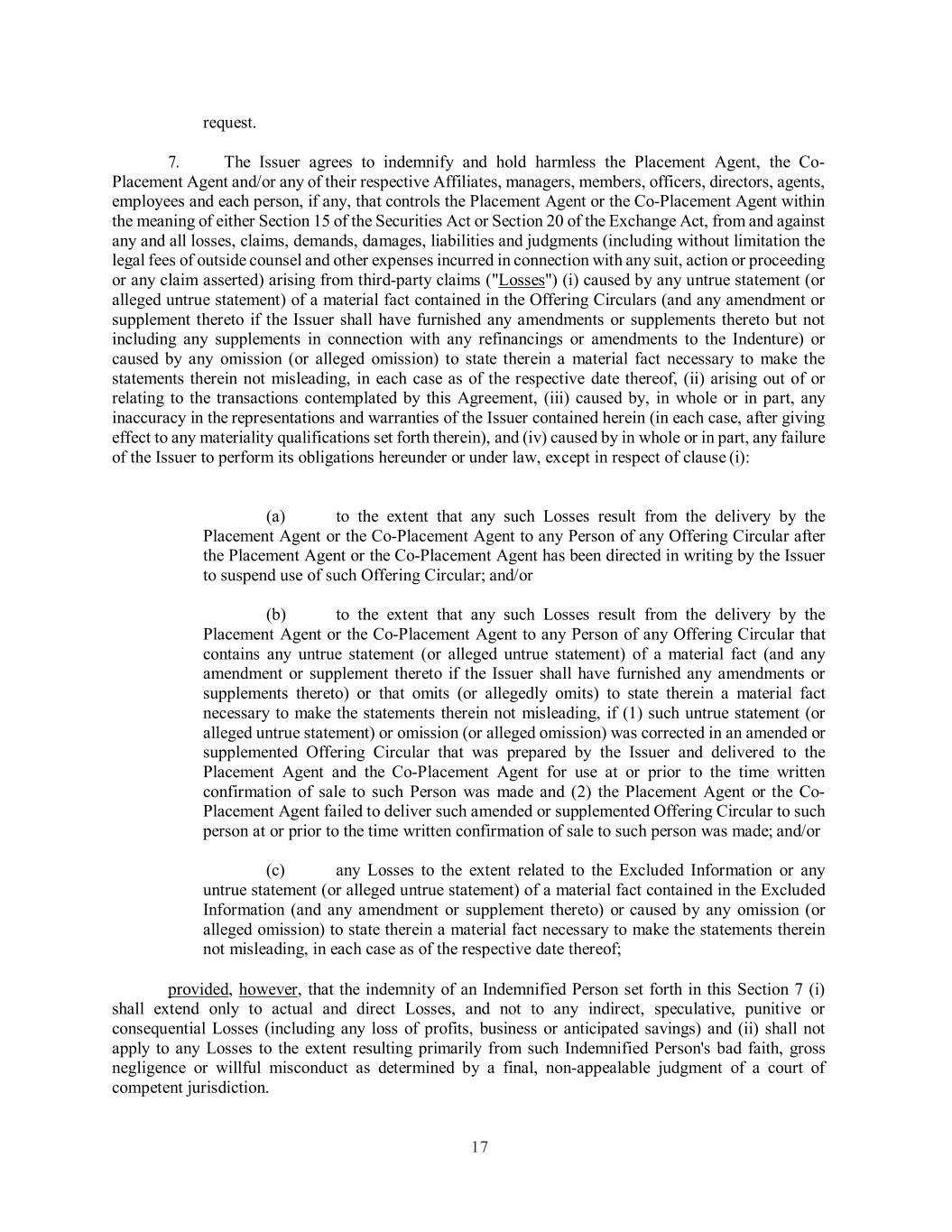17 request. 7. The Issuer agrees to indemnify and hold harmless the Placement Agent, the Co- Placement Agent and/or any of their respective Affiliates, managers, members, officers, directors, agents, employees and each person, if any, that controls the Placement Agent or the Co-Placement Agent within the meaning of either Section 15 of the Securities Act or Section 20 of the Exchange Act, from and against any and all losses, claims, demands, damages, liabilities and judgments (including without limitation the legal fees of outside counsel and other expenses incurred in connection with any suit, action or proceeding or any claim asserted) arising from third-party claims ("Losses") (i) caused by any untrue statement (or alleged untrue statement) of a material fact contained in the Offering Circulars (and any amendment or supplement thereto if the Issuer shall have furnished any amendments or supplements thereto but not including any supplements in connection with any refinancings or amendments to the Indenture) or caused by any omission (or alleged omission) to state therein a material fact necessary to make the statements therein not misleading, in each case as of the respective date thereof, (ii) arising out of or relating to the transactions contemplated by this Agreement, (iii) caused by, in whole or in part, any inaccuracy in the representations and warranties of the Issuer contained herein (in each case, after giving effect to any materiality qualifications set forth therein), and (iv) caused by in whole or in part, any failure of the Issuer to perform its obligations hereunder or under law, except in respect of clause (i): (a) to the extent that any such Losses result from the delivery by the Placement Agent or the Co-Placement Agent to any Person of any Offering Circular after the Placement Agent or the Co-Placement Agent has been directed in writing by the Issuer to suspend use of such Offering Circular; and/or (b) to the extent that any such Losses result from the delivery by the Placement Agent or the Co-Placement Agent to any Person of any Offering Circular that contains any untrue statement (or alleged untrue statement) of a material fact (and any amendment or supplement thereto if the Issuer shall have furnished any amendments or supplements thereto) or that omits (or allegedly omits) to state therein a material fact necessary to make the statements therein not misleading, if (1) such untrue statement (or alleged untrue statement) or omission (or alleged omission) was corrected in an amended or supplemented Offering Circular that was prepared by the Issuer and delivered to the Placement Agent and the Co-Placement Agent for use at or prior to the time written confirmation of sale to such Person was made and (2) the Placement Agent or the Co- Placement Agent failed to deliver such amended or supplemented Offering Circular to such person at or prior to the time written confirmation of sale to such person was made; and/or (c) any Losses to the extent related to the Excluded Information or any untrue statement (or alleged untrue statement) of a material fact contained in the Excluded Information (and any amendment or supplement thereto) or caused by any omission (or alleged omission) to state therein a material fact necessary to make the statements therein not misleading, in each case as of the respective date thereof; provided, however, that the indemnity of an Indemnified Person set forth in this Section 7 (i) shall extend only to actual and direct Losses, and not to any indirect, speculative, punitive or consequential Losses (including any loss of profits, business or anticipated savings) and (ii) shall not apply to any Losses to the extent resulting primarily from such Indemnified Person's bad faith, gross negligence or willful misconduct as determined by a final, non-appealable judgment of a court of competent jurisdiction.
