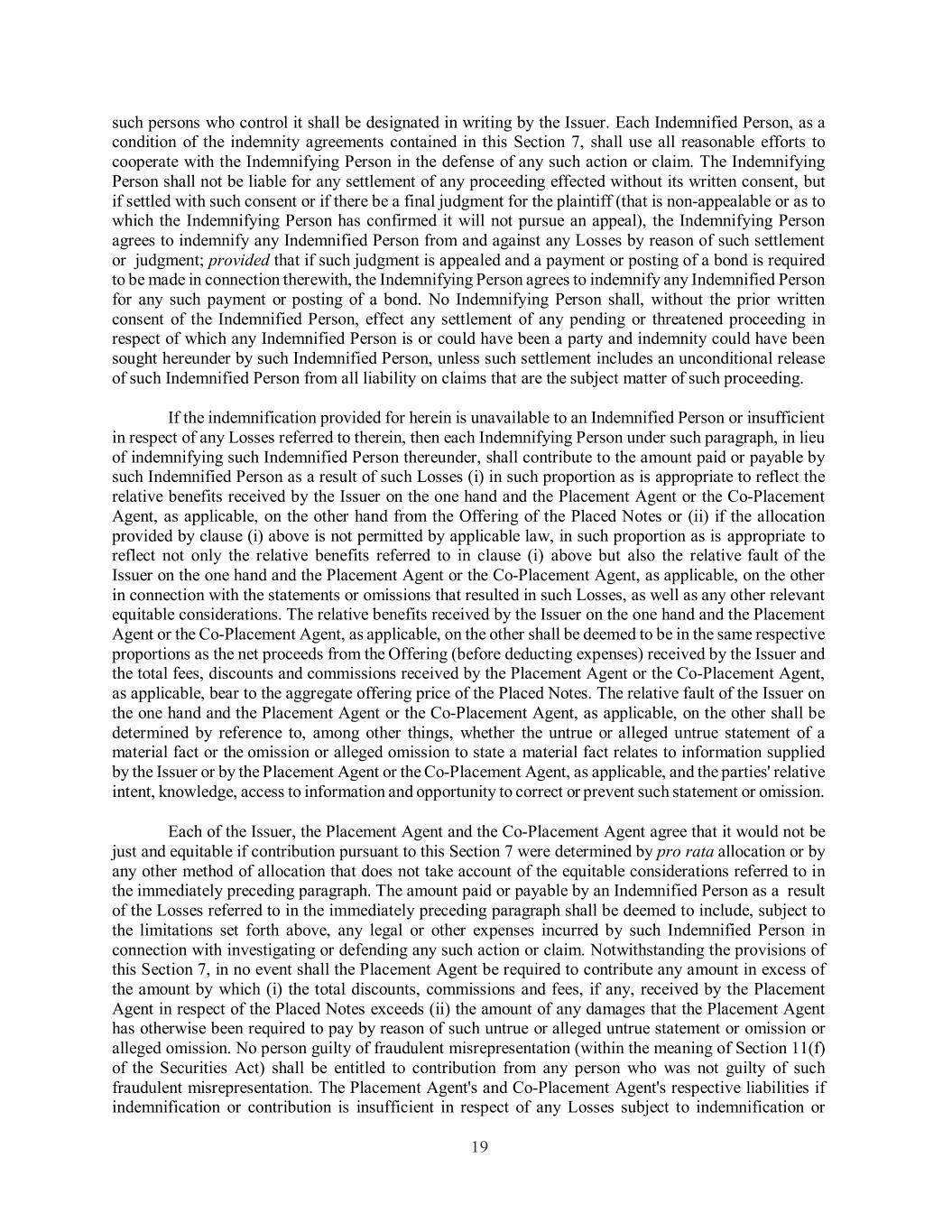 19 such persons who control it shall be designated in writing by the Issuer. Each Indemnified Person, as a condition of the indemnity agreements contained in this Section 7, shall use all reasonable efforts to cooperate with the Indemnifying Person in the defense of any such action or claim. The Indemnifying Person shall not be liable for any settlement of any proceeding effected without its written consent, but if settled with such consent or if there be a final judgment for the plaintiff (that is non-appealable or as to which the Indemnifying Person has confirmed it will not pursue an appeal), the Indemnifying Person agrees to indemnify any Indemnified Person from and against any Losses by reason of such settlement or judgment; provided that if such judgment is appealed and a payment or posting of a bond is required to be made in connection therewith, the Indemnifying Person agrees to indemnify any Indemnified Person for any such payment or posting of a bond. No Indemnifying Person shall, without the prior written consent of the Indemnified Person, effect any settlement of any pending or threatened proceeding in respect of which any Indemnified Person is or could have been a party and indemnity could have been sought hereunder by such Indemnified Person, unless such settlement includes an unconditional release of such Indemnified Person from all liability on claims that are the subject matter of such proceeding. If the indemnification provided for herein is unavailable to an Indemnified Person or insufficient in respect of any Losses referred to therein, then each Indemnifying Person under such paragraph, in lieu of indemnifying such Indemnified Person thereunder, shall contribute to the amount paid or payable by such Indemnified Person as a result of such Losses (i) in such proportion as is appropriate to reflect the relative benefits received by the Issuer on the one hand and the Placement Agent or the Co-Placement Agent, as applicable, on the other hand from the Offering of the Placed Notes or (ii) if the allocation provided by clause (i) above is not permitted by applicable law, in such proportion as is appropriate to reflect not only the relative benefits referred to in clause (i) above but also the relative fault of the Issuer on the one hand and the Placement Agent or the Co-Placement Agent, as applicable, on the other in connection with the statements or omissions that resulted in such Losses, as well as any other relevant equitable considerations. The relative benefits received by the Issuer on the one hand and the Placement Agent or the Co-Placement Agent, as applicable, on the other shall be deemed to be in the same respective proportions as the net proceeds from the Offering (before deducting expenses) received by the Issuer and the total fees, discounts and commissions received by the Placement Agent or the Co-Placement Agent, as applicable, bear to the aggregate offering price of the Placed Notes. The relative fault of the Issuer on the one hand and the Placement Agent or the Co-Placement Agent, as applicable, on the other shall be determined by reference to, among other things, whether the untrue or alleged untrue statement of a material fact or the omission or alleged omission to state a material fact relates to information supplied by the Issuer or by the Placement Agent or the Co-Placement Agent, as applicable, and the parties' relative intent, knowledge, access to information and opportunity to correct or prevent such statement or omission. Each of the Issuer, the Placement Agent and the Co-Placement Agent agree that it would not be just and equitable if contribution pursuant to this Section 7 were determined by pro rata allocation or by any other method of allocation that does not take account of the equitable considerations referred to in the immediately preceding paragraph. The amount paid or payable by an Indemnified Person as a result of the Losses referred to in the immediately preceding paragraph shall be deemed to include, subject to the limitations set forth above, any legal or other expenses incurred by such Indemnified Person in connection with investigating or defending any such action or claim. Notwithstanding the provisions of this Section 7, in no event shall the Placement Agent be required to contribute any amount in excess of the amount by which (i) the total discounts, commissions and fees, if any, received by the Placement Agent in respect of the Placed Notes exceeds (ii) the amount of any damages that the Placement Agent has otherwise been required to pay by reason of such untrue or alleged untrue statement or omission or alleged omission. No person guilty of fraudulent misrepresentation (within the meaning of Section 11(f) of the Securities Act) shall be entitled to contribution from any person who was not guilty of such fraudulent misrepresentation. The Placement Agent's and Co-Placement Agent's respective liabilities if indemnification or contribution is insufficient in respect of any Losses subject to indemnification or