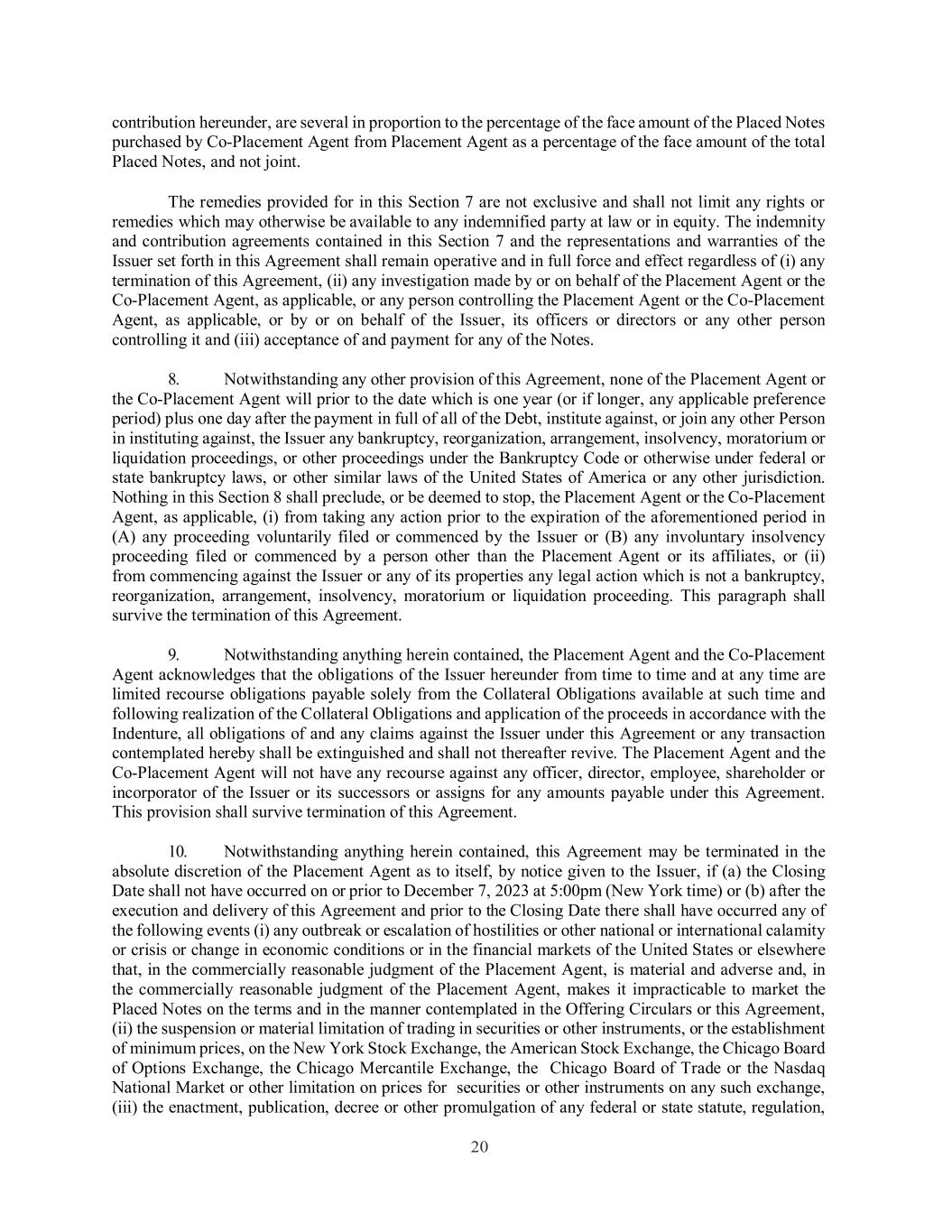 20 contribution hereunder, are several in proportion to the percentage of the face amount of the Placed Notes purchased by Co-Placement Agent from Placement Agent as a percentage of the face amount of the total Placed Notes, and not joint. The remedies provided for in this Section 7 are not exclusive and shall not limit any rights or remedies which may otherwise be available to any indemnified party at law or in equity. The indemnity and contribution agreements contained in this Section 7 and the representations and warranties of the Issuer set forth in this Agreement shall remain operative and in full force and effect regardless of (i) any termination of this Agreement, (ii) any investigation made by or on behalf of the Placement Agent or the Co-Placement Agent, as applicable, or any person controlling the Placement Agent or the Co-Placement Agent, as applicable, or by or on behalf of the Issuer, its officers or directors or any other person controlling it and (iii) acceptance of and payment for any of the Notes. 8. Notwithstanding any other provision of this Agreement, none of the Placement Agent or the Co-Placement Agent will prior to the date which is one year (or if longer, any applicable preference period) plus one day after the payment in full of all of the Debt, institute against, or join any other Person in instituting against, the Issuer any bankruptcy, reorganization, arrangement, insolvency, moratorium or liquidation proceedings, or other proceedings under the Bankruptcy Code or otherwise under federal or state bankruptcy laws, or other similar laws of the United States of America or any other jurisdiction. Nothing in this Section 8 shall preclude, or be deemed to stop, the Placement Agent or the Co-Placement Agent, as applicable, (i) from taking any action prior to the expiration of the aforementioned period in (A) any proceeding voluntarily filed or commenced by the Issuer or (B) any involuntary insolvency proceeding filed or commenced by a person other than the Placement Agent or its affiliates, or (ii) from commencing against the Issuer or any of its properties any legal action which is not a bankruptcy, reorganization, arrangement, insolvency, moratorium or liquidation proceeding. This paragraph shall survive the termination of this Agreement. 9. Notwithstanding anything herein contained, the Placement Agent and the Co-Placement Agent acknowledges that the obligations of the Issuer hereunder from time to time and at any time are limited recourse obligations payable solely from the Collateral Obligations available at such time and following realization of the Collateral Obligations and application of the proceeds in accordance with the Indenture, all obligations of and any claims against the Issuer under this Agreement or any transaction contemplated hereby shall be extinguished and shall not thereafter revive. The Placement Agent and the Co-Placement Agent will not have any recourse against any officer, director, employee, shareholder or incorporator of the Issuer or its successors or assigns for any amounts payable under this Agreement. This provision shall survive termination of this Agreement. 10. Notwithstanding anything herein contained, this Agreement may be terminated in the absolute discretion of the Placement Agent as to itself, by notice given to the Issuer, if (a) the Closing Date shall not have occurred on or prior to December 7, 2023 at 5:00pm (New York time) or (b) after the execution and delivery of this Agreement and prior to the Closing Date there shall have occurred any of the following events (i) any outbreak or escalation of hostilities or other national or international calamity or crisis or change in economic conditions or in the financial markets of the United States or elsewhere that, in the commercially reasonable judgment of the Placement Agent, is material and adverse and, in the commercially reasonable judgment of the Placement Agent, makes it impracticable to market the Placed Notes on the terms and in the manner contemplated in the Offering Circulars or this Agreement, (ii) the suspension or material limitation of trading in securities or other instruments, or the establishment of minimum prices, on the New York Stock Exchange, the American Stock Exchange, the Chicago Board of Options Exchange, the Chicago Mercantile Exchange, the Chicago Board of Trade or the Nasdaq National Market or other limitation on prices for securities or other instruments on any such exchange, (iii) the enactment, publication, decree or other promulgation of any federal or state statute, regulation,