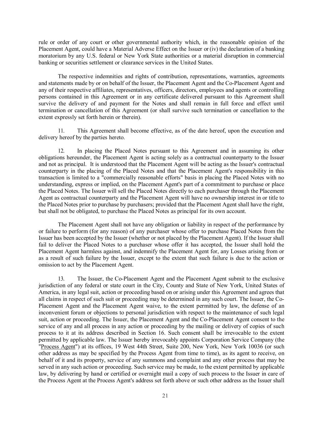 21 rule or order of any court or other governmental authority which, in the reasonable opinion of the Placement Agent, could have a Material Adverse Effect on the Issuer or (iv) the declaration of a banking moratorium by any U.S. federal or New York State authorities or a material disruption in commercial banking or securities settlement or clearance services in the United States. The respective indemnities and rights of contribution, representations, warranties, agreements and statements made by or on behalf of the Issuer, the Placement Agent and the Co-Placement Agent and any of their respective affiliates, representatives, officers, directors, employees and agents or controlling persons contained in this Agreement or in any certificate delivered pursuant to this Agreement shall survive the delivery of and payment for the Notes and shall remain in full force and effect until termination or cancellation of this Agreement (or shall survive such termination or cancellation to the extent expressly set forth herein or therein). 11. This Agreement shall become effective, as of the date hereof, upon the execution and delivery hereof by the parties hereto. 12. In placing the Placed Notes pursuant to this Agreement and in assuming its other obligations hereunder, the Placement Agent is acting solely as a contractual counterparty to the Issuer and not as principal. It is understood that the Placement Agent will be acting as the Issuer's contractual counterparty in the placing of the Placed Notes and that the Placement Agent's responsibility in this transaction is limited to a "commercially reasonable efforts" basis in placing the Placed Notes with no understanding, express or implied, on the Placement Agent's part of a commitment to purchase or place the Placed Notes. The Issuer will sell the Placed Notes directly to each purchaser through the Placement Agent as contractual counterparty and the Placement Agent will have no ownership interest in or title to the Placed Notes prior to purchase by purchasers; provided that the Placement Agent shall have the right, but shall not be obligated, to purchase the Placed Notes as principal for its own account. The Placement Agent shall not have any obligation or liability in respect of the performance by or failure to perform (for any reason) of any purchaser whose offer to purchase Placed Notes from the Issuer has been accepted by the Issuer (whether or not placed by the Placement Agent). If the Issuer shall fail to deliver the Placed Notes to a purchaser whose offer it has accepted, the Issuer shall hold the Placement Agent harmless against, and indemnify the Placement Agent for, any Losses arising from or as a result of such failure by the Issuer, except to the extent that such failure is due to the action or omission to act by the Placement Agent. 13. The Issuer, the Co-Placement Agent and the Placement Agent submit to the exclusive jurisdiction of any federal or state court in the City, County and State of New York, United States of America, in any legal suit, action or proceeding based on or arising under this Agreement and agrees that all claims in respect of such suit or proceeding may be determined in any such court. The Issuer, the Co- Placement Agent and the Placement Agent waive, to the extent permitted by law, the defense of an inconvenient forum or objections to personal jurisdiction with respect to the maintenance of such legal suit, action or proceeding. The Issuer, the Placement Agent and the Co-Placement Agent consent to the service of any and all process in any action or proceeding by the mailing or delivery of copies of such process to it at its address described in Section 16. Such consent shall be irrevocable to the extent permitted by applicable law. The Issuer hereby irrevocably appoints Corporation Service Company (the "Process Agent") at its offices, 19 West 44th Street, Suite 200, New York, New York 10036 (or such other address as may be specified by the Process Agent from time to time), as its agent to receive, on behalf of it and its property, service of any summons and complaint and any other process that may be served in any such action or proceeding. Such service may be made, to the extent permitted by applicable law, by delivering by hand or certified or overnight mail a copy of such process to the Issuer in care of the Process Agent at the Process Agent's address set forth above or such other address as the Issuer shall