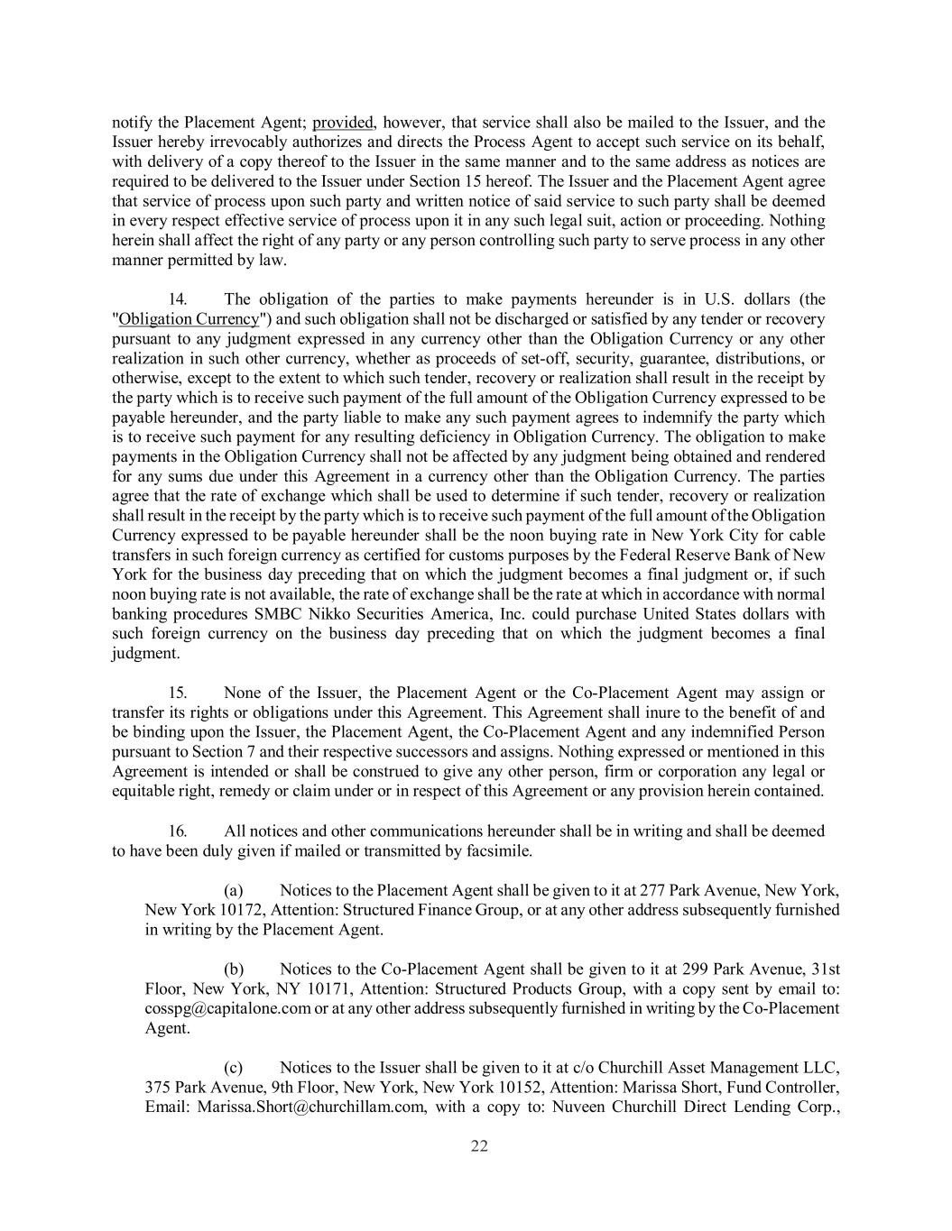 22 notify the Placement Agent; provided, however, that service shall also be mailed to the Issuer, and the Issuer hereby irrevocably authorizes and directs the Process Agent to accept such service on its behalf, with delivery of a copy thereof to the Issuer in the same manner and to the same address as notices are required to be delivered to the Issuer under Section 15 hereof. The Issuer and the Placement Agent agree that service of process upon such party and written notice of said service to such party shall be deemed in every respect effective service of process upon it in any such legal suit, action or proceeding. Nothing herein shall affect the right of any party or any person controlling such party to serve process in any other manner permitted by law. 14. The obligation of the parties to make payments hereunder is in U.S. dollars (the "Obligation Currency") and such obligation shall not be discharged or satisfied by any tender or recovery pursuant to any judgment expressed in any currency other than the Obligation Currency or any other realization in such other currency, whether as proceeds of set-off, security, guarantee, distributions, or otherwise, except to the extent to which such tender, recovery or realization shall result in the receipt by the party which is to receive such payment of the full amount of the Obligation Currency expressed to be payable hereunder, and the party liable to make any such payment agrees to indemnify the party which is to receive such payment for any resulting deficiency in Obligation Currency. The obligation to make payments in the Obligation Currency shall not be affected by any judgment being obtained and rendered for any sums due under this Agreement in a currency other than the Obligation Currency. The parties agree that the rate of exchange which shall be used to determine if such tender, recovery or realization shall result in the receipt by the party which is to receive such payment of the full amount of the Obligation Currency expressed to be payable hereunder shall be the noon buying rate in New York City for cable transfers in such foreign currency as certified for customs purposes by the Federal Reserve Bank of New York for the business day preceding that on which the judgment becomes a final judgment or, if such noon buying rate is not available, the rate of exchange shall be the rate at which in accordance with normal banking procedures SMBC Nikko Securities America, Inc. could purchase United States dollars with such foreign currency on the business day preceding that on which the judgment becomes a final judgment. 15. None of the Issuer, the Placement Agent or the Co-Placement Agent may assign or transfer its rights or obligations under this Agreement. This Agreement shall inure to the benefit of and be binding upon the Issuer, the Placement Agent, the Co-Placement Agent and any indemnified Person pursuant to Section 7 and their respective successors and assigns. Nothing expressed or mentioned in this Agreement is intended or shall be construed to give any other person, firm or corporation any legal or equitable right, remedy or claim under or in respect of this Agreement or any provision herein contained. 16. All notices and other communications hereunder shall be in writing and shall be deemed to have been duly given if mailed or transmitted by facsimile. (a) Notices to the Placement Agent shall be given to it at 277 Park Avenue, New York, New York 10172, Attention: Structured Finance Group, or at any other address subsequently furnished in writing by the Placement Agent. (b) Notices to the Co-Placement Agent shall be given to it at 299 Park Avenue, 31st Floor, New York, NY 10171, Attention: Structured Products Group, with a copy sent by email to: cosspg@capitalone.com or at any other address subsequently furnished in writing by the Co-Placement Agent. (c) Notices to the Issuer shall be given to it at c/o Churchill Asset Management LLC, 375 Park Avenue, 9th Floor, New York, New York 10152, Attention: Marissa Short, Fund Controller, Email: Marissa.Short@churchillam.com, with a copy to: Nuveen Churchill Direct Lending Corp.,