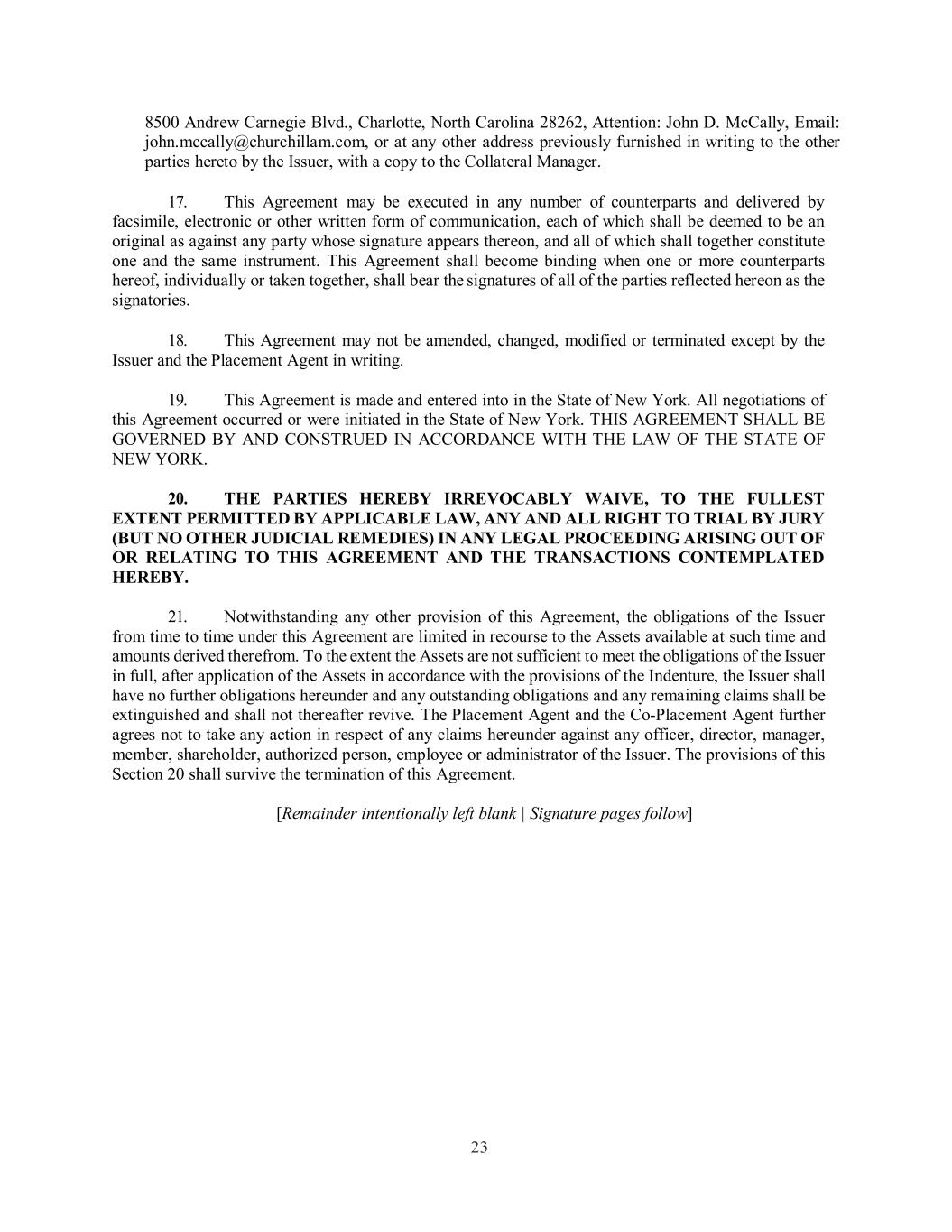 23 8500 Andrew Carnegie Blvd., Charlotte, North Carolina 28262, Attention: John D. McCally, Email: john.mccally@churchillam.com, or at any other address previously furnished in writing to the other parties hereto by the Issuer, with a copy to the Collateral Manager. 17. This Agreement may be executed in any number of counterparts and delivered by facsimile, electronic or other written form of communication, each of which shall be deemed to be an original as against any party whose signature appears thereon, and all of which shall together constitute one and the same instrument. This Agreement shall become binding when one or more counterparts hereof, individually or taken together, shall bear the signatures of all of the parties reflected hereon as the signatories. 18. This Agreement may not be amended, changed, modified or terminated except by the Issuer and the Placement Agent in writing. 19. This Agreement is made and entered into in the State of New York. All negotiations of this Agreement occurred or were initiated in the State of New York. THIS AGREEMENT SHALL BE GOVERNED BY AND CONSTRUED IN ACCORDANCE WITH THE LAW OF THE STATE OF NEW YORK. 20. THE PARTIES HEREBY IRREVOCABLY WAIVE, TO THE FULLEST EXTENT PERMITTED BY APPLICABLE LAW, ANY AND ALL RIGHT TO TRIAL BY JURY (BUT NO OTHER JUDICIAL REMEDIES) IN ANY LEGAL PROCEEDING ARISING OUT OF OR RELATING TO THIS AGREEMENT AND THE TRANSACTIONS CONTEMPLATED HEREBY. 21. Notwithstanding any other provision of this Agreement, the obligations of the Issuer from time to time under this Agreement are limited in recourse to the Assets available at such time and amounts derived therefrom. To the extent the Assets are not sufficient to meet the obligations of the Issuer in full, after application of the Assets in accordance with the provisions of the Indenture, the Issuer shall have no further obligations hereunder and any outstanding obligations and any remaining claims shall be extinguished and shall not thereafter revive. The Placement Agent and the Co-Placement Agent further agrees not to take any action in respect of any claims hereunder against any officer, director, manager, member, shareholder, authorized person, employee or administrator of the Issuer. The provisions of this Section 20 shall survive the termination of this Agreement. [Remainder intentionally left blank | Signature pages follow]