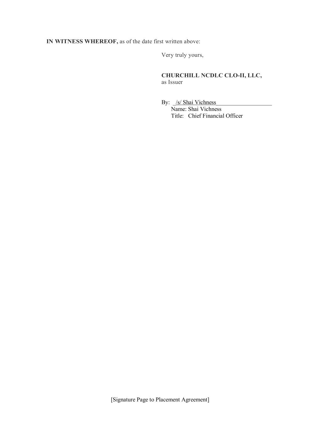 [Signature Page to Placement Agreement] IN WITNESS WHEREOF, as of the date first written above: Very truly yours, CHURCHILL NCDLC CLO-II, LLC, as Issuer By: _/s/ Shai Vichness___________________ Name: Shai Vichness Title: Chief Financial Officer