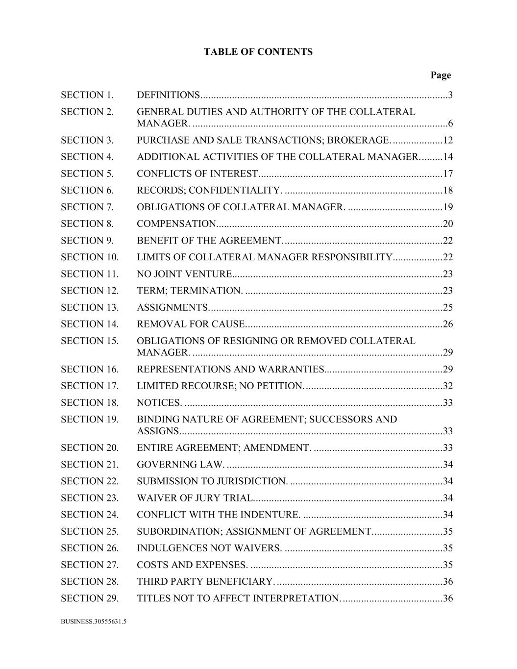 BUSINESS.30555631.5 TABLE OF CONTENTS Page SECTION 1. DEFINITIONS. .............................................................................................3 SECTION 2. GENERAL DUTIES AND AUTHORITY OF THE COLLATERAL MANAGER. .................................................................................................6 SECTION 3. PURCHASE AND SALE TRANSACTIONS; BROKERAGE. ................... 12 SECTION 4. ADDITIONAL ACTIVITIES OF THE COLLATERAL MANAGER. ........ 14 SECTION 5. CONFLICTS OF INTEREST. ..................................................................... 17 SECTION 6. RECORDS; CONFIDENTIALITY. ............................................................ 18 SECTION 7. OBLIGATIONS OF COLLATERAL MANAGER. .................................... 19 SECTION 8. COMPENSATION...................................................................................... 20 SECTION 9. BENEFIT OF THE AGREEMENT. ............................................................ 22 SECTION 10. LIMITS OF COLLATERAL MANAGER RESPONSIBILITY. .................. 22 SECTION 11. NO JOINT VENTURE................................................................................ 23 SECTION 12. TERM; TERMINATION. ........................................................................... 23 SECTION 13. ASSIGNMENTS. ........................................................................................ 25 SECTION 14. REMOVAL FOR CAUSE. .......................................................................... 26 SECTION 15. OBLIGATIONS OF RESIGNING OR REMOVED COLLATERAL MANAGER. ............................................................................................... 29 SECTION 16. REPRESENTATIONS AND WARRANTIES............................................. 29 SECTION 17. LIMITED RECOURSE; NO PETITION. .................................................... 32 SECTION 18. NOTICES. .................................................................................................. 33 SECTION 19. BINDING NATURE OF AGREEMENT; SUCCESSORS AND ASSIGNS. ................................................................................................... 33 SECTION 20. ENTIRE AGREEMENT; AMENDMENT. ................................................. 33 SECTION 21. GOVERNING LAW. .................................................................................. 34 SECTION 22. SUBMISSION TO JURISDICTION. .......................................................... 34 SECTION 23. WAIVER OF JURY TRIAL........................................................................ 34 SECTION 24. CONFLICT WITH THE INDENTURE. ..................................................... 34 SECTION 25. SUBORDINATION; ASSIGNMENT OF AGREEMENT. .......................... 35 SECTION 26. INDULGENCES NOT WAIVERS. ............................................................ 35 SECTION 27. COSTS AND EXPENSES. ......................................................................... 35 SECTION 28. THIRD PARTY BENEFICIARY. ............................................................... 36 SECTION 29. TITLES NOT TO AFFECT INTERPRETATION. ...................................... 36