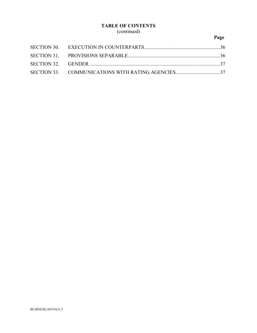 BUSINESS.30555631.5 TABLE OF CONTENTS (continued) Page SECTION 30. EXECUTION IN COUNTERPARTS.......................................................... 36 SECTION 31. PROVISIONS SEPARABLE. ..................................................................... 36 SECTION 32. GENDER. ................................................................................................... 37 SECTION 33. COMMUNICATIONS WITH RATING AGENCIES.................................. 37