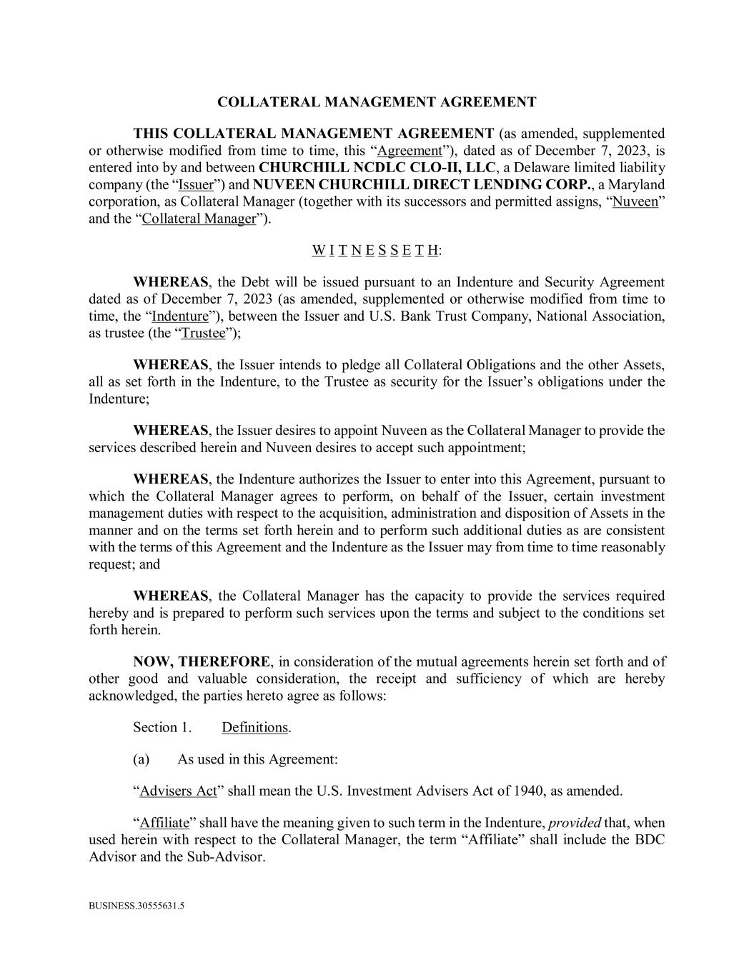 BUSINESS.30555631.5 COLLATERAL MANAGEMENT AGREEMENT THIS COLLATERAL MANAGEMENT AGREEMENT (as amended, supplemented or otherwise modified from time to time, this “Agreement”), dated as of December 7, 2023, is entered into by and between CHURCHILL NCDLC CLO-II, LLC, a Delaware limited liability company (the “Issuer”) and NUVEEN CHURCHILL DIRECT LENDING CORP., a Maryland corporation, as Collateral Manager (together with its successors and permitted assigns, “Nuveen” and the “Collateral Manager”). W I T N E S S E T H: WHEREAS, the Debt will be issued pursuant to an Indenture and Security Agreement dated as of December 7, 2023 (as amended, supplemented or otherwise modified from time to time, the “Indenture”), between the Issuer and U.S. Bank Trust Company, National Association, as trustee (the “Trustee”); WHEREAS, the Issuer intends to pledge all Collateral Obligations and the other Assets, all as set forth in the Indenture, to the Trustee as security for the Issuer’s obligations under the Indenture; WHEREAS, the Issuer desires to appoint Nuveen as the Collateral Manager to provide the services described herein and Nuveen desires to accept such appointment; WHEREAS, the Indenture authorizes the Issuer to enter into this Agreement, pursuant to which the Collateral Manager agrees to perform, on behalf of the Issuer, certain investment management duties with respect to the acquisition, administration and disposition of Assets in the manner and on the terms set forth herein and to perform such additional duties as are consistent with the terms of this Agreement and the Indenture as the Issuer may from time to time reasonably request; and WHEREAS, the Collateral Manager has the capacity to provide the services required hereby and is prepared to perform such services upon the terms and subject to the conditions set forth herein. NOW, THEREFORE, in consideration of the mutual agreements herein set forth and of other good and valuable consideration, the receipt and sufficiency of which are hereby acknowledged, the parties hereto agree as follows: Section 1. Definitions. (a) As used in this Agreement: “Advisers Act” shall mean the U.S. Investment Advisers Act of 1940, as amended. “Affiliate” shall have the meaning given to such term in the Indenture, provided that, when used herein with respect to the Collateral Manager, the term “Affiliate” shall include the BDC Advisor and the Sub-Advisor.