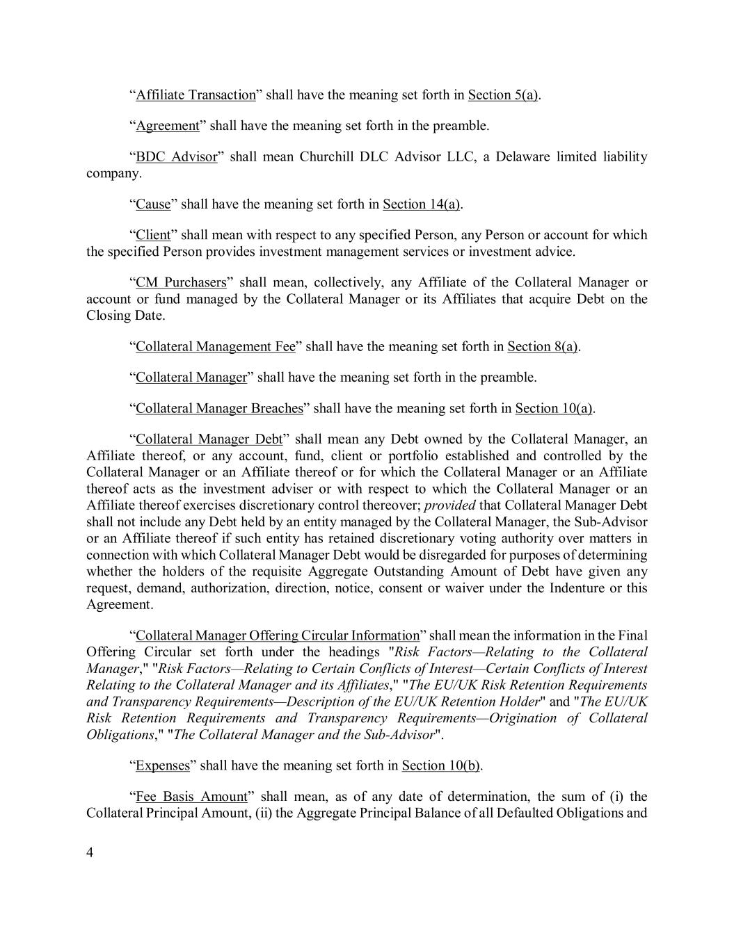 4 “Affiliate Transaction” shall have the meaning set forth in Section 5(a). “Agreement” shall have the meaning set forth in the preamble. “BDC Advisor” shall mean Churchill DLC Advisor LLC, a Delaware limited liability company. “Cause” shall have the meaning set forth in Section 14(a). “Client” shall mean with respect to any specified Person, any Person or account for which the specified Person provides investment management services or investment advice. “CM Purchasers” shall mean, collectively, any Affiliate of the Collateral Manager or account or fund managed by the Collateral Manager or its Affiliates that acquire Debt on the Closing Date. “Collateral Management Fee” shall have the meaning set forth in Section 8(a). “Collateral Manager” shall have the meaning set forth in the preamble. “Collateral Manager Breaches” shall have the meaning set forth in Section 10(a). “Collateral Manager Debt” shall mean any Debt owned by the Collateral Manager, an Affiliate thereof, or any account, fund, client or portfolio established and controlled by the Collateral Manager or an Affiliate thereof or for which the Collateral Manager or an Affiliate thereof acts as the investment adviser or with respect to which the Collateral Manager or an Affiliate thereof exercises discretionary control thereover; provided that Collateral Manager Debt shall not include any Debt held by an entity managed by the Collateral Manager, the Sub-Advisor or an Affiliate thereof if such entity has retained discretionary voting authority over matters in connection with which Collateral Manager Debt would be disregarded for purposes of determining whether the holders of the requisite Aggregate Outstanding Amount of Debt have given any request, demand, authorization, direction, notice, consent or waiver under the Indenture or this Agreement. “Collateral Manager Offering Circular Information” shall mean the information in the Final Offering Circular set forth under the headings "Risk Factors—Relating to the Collateral Manager," "Risk Factors—Relating to Certain Conflicts of Interest—Certain Conflicts of Interest Relating to the Collateral Manager and its Affiliates," "The EU/UK Risk Retention Requirements and Transparency Requirements—Description of the EU/UK Retention Holder" and "The EU/UK Risk Retention Requirements and Transparency Requirements—Origination of Collateral Obligations," "The Collateral Manager and the Sub-Advisor". “Expenses” shall have the meaning set forth in Section 10(b). “Fee Basis Amount” shall mean, as of any date of determination, the sum of (i) the Collateral Principal Amount, (ii) the Aggregate Principal Balance of all Defaulted Obligations and