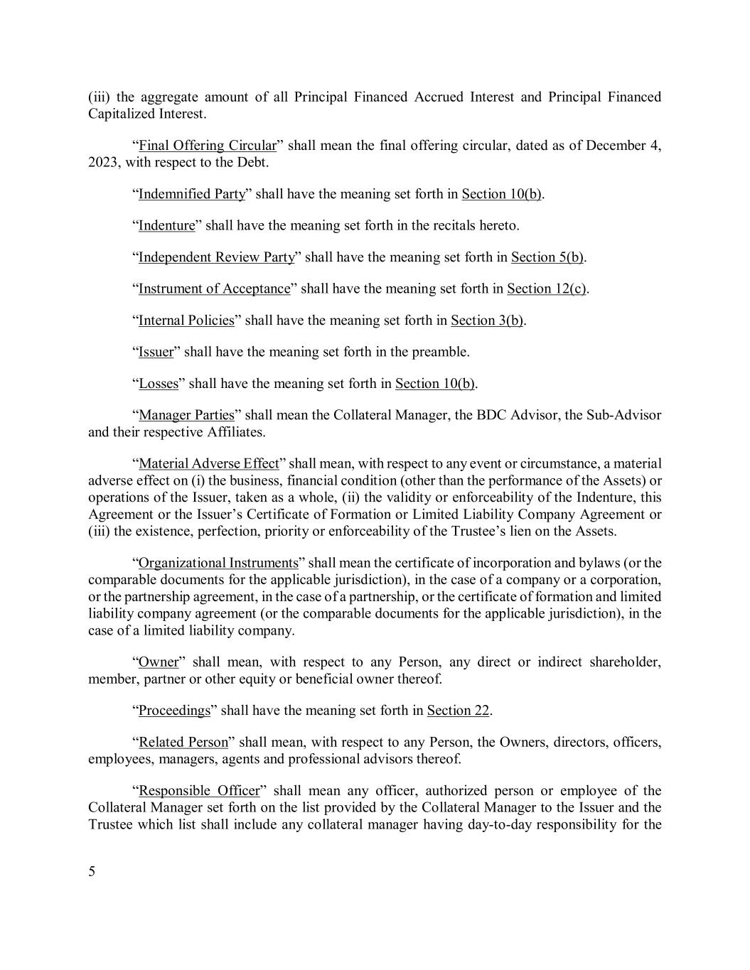 5 (iii) the aggregate amount of all Principal Financed Accrued Interest and Principal Financed Capitalized Interest. “Final Offering Circular” shall mean the final offering circular, dated as of December 4, 2023, with respect to the Debt. “Indemnified Party” shall have the meaning set forth in Section 10(b). “Indenture” shall have the meaning set forth in the recitals hereto. “Independent Review Party” shall have the meaning set forth in Section 5(b). “Instrument of Acceptance” shall have the meaning set forth in Section 12(c). “Internal Policies” shall have the meaning set forth in Section 3(b). “Issuer” shall have the meaning set forth in the preamble. “Losses” shall have the meaning set forth in Section 10(b). “Manager Parties” shall mean the Collateral Manager, the BDC Advisor, the Sub-Advisor and their respective Affiliates. “Material Adverse Effect” shall mean, with respect to any event or circumstance, a material adverse effect on (i) the business, financial condition (other than the performance of the Assets) or operations of the Issuer, taken as a whole, (ii) the validity or enforceability of the Indenture, this Agreement or the Issuer’s Certificate of Formation or Limited Liability Company Agreement or (iii) the existence, perfection, priority or enforceability of the Trustee’s lien on the Assets. “Organizational Instruments” shall mean the certificate of incorporation and bylaws (or the comparable documents for the applicable jurisdiction), in the case of a company or a corporation, or the partnership agreement, in the case of a partnership, or the certificate of formation and limited liability company agreement (or the comparable documents for the applicable jurisdiction), in the case of a limited liability company. “Owner” shall mean, with respect to any Person, any direct or indirect shareholder, member, partner or other equity or beneficial owner thereof. “Proceedings” shall have the meaning set forth in Section 22. “Related Person” shall mean, with respect to any Person, the Owners, directors, officers, employees, managers, agents and professional advisors thereof. “Responsible Officer” shall mean any officer, authorized person or employee of the Collateral Manager set forth on the list provided by the Collateral Manager to the Issuer and the Trustee which list shall include any collateral manager having day-to-day responsibility for the
