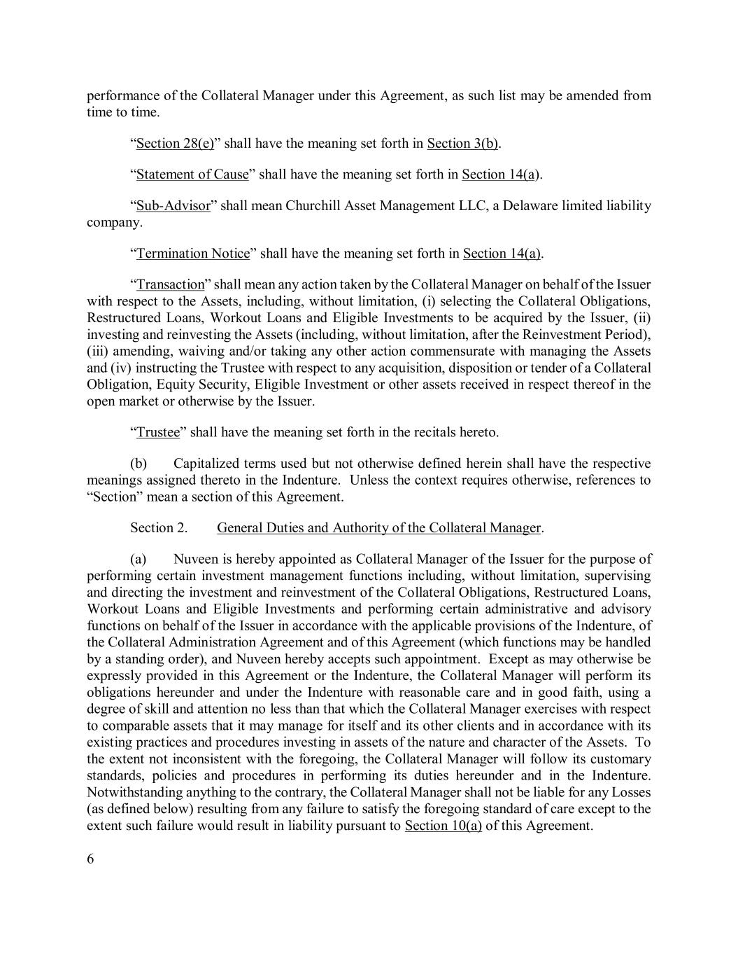 6 performance of the Collateral Manager under this Agreement, as such list may be amended from time to time. “Section 28(e)” shall have the meaning set forth in Section 3(b). “Statement of Cause” shall have the meaning set forth in Section 14(a). “Sub-Advisor” shall mean Churchill Asset Management LLC, a Delaware limited liability company. “Termination Notice” shall have the meaning set forth in Section 14(a). “Transaction” shall mean any action taken by the Collateral Manager on behalf of the Issuer with respect to the Assets, including, without limitation, (i) selecting the Collateral Obligations, Restructured Loans, Workout Loans and Eligible Investments to be acquired by the Issuer, (ii) investing and reinvesting the Assets (including, without limitation, after the Reinvestment Period), (iii) amending, waiving and/or taking any other action commensurate with managing the Assets and (iv) instructing the Trustee with respect to any acquisition, disposition or tender of a Collateral Obligation, Equity Security, Eligible Investment or other assets received in respect thereof in the open market or otherwise by the Issuer. “Trustee” shall have the meaning set forth in the recitals hereto. (b) Capitalized terms used but not otherwise defined herein shall have the respective meanings assigned thereto in the Indenture. Unless the context requires otherwise, references to “Section” mean a section of this Agreement. Section 2. General Duties and Authority of the Collateral Manager. (a) Nuveen is hereby appointed as Collateral Manager of the Issuer for the purpose of performing certain investment management functions including, without limitation, supervising and directing the investment and reinvestment of the Collateral Obligations, Restructured Loans, Workout Loans and Eligible Investments and performing certain administrative and advisory functions on behalf of the Issuer in accordance with the applicable provisions of the Indenture, of the Collateral Administration Agreement and of this Agreement (which functions may be handled by a standing order), and Nuveen hereby accepts such appointment. Except as may otherwise be expressly provided in this Agreement or the Indenture, the Collateral Manager will perform its obligations hereunder and under the Indenture with reasonable care and in good faith, using a degree of skill and attention no less than that which the Collateral Manager exercises with respect to comparable assets that it may manage for itself and its other clients and in accordance with its existing practices and procedures investing in assets of the nature and character of the Assets. To the extent not inconsistent with the foregoing, the Collateral Manager will follow its customary standards, policies and procedures in performing its duties hereunder and in the Indenture. Notwithstanding anything to the contrary, the Collateral Manager shall not be liable for any Losses (as defined below) resulting from any failure to satisfy the foregoing standard of care except to the extent such failure would result in liability pursuant to Section 10(a) of this Agreement.