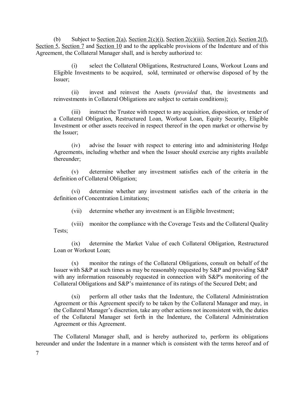 7 (b) Subject to Section 2(a), Section 2(c)(i), Section 2(c)(iii), Section 2(e), Section 2(f), Section 5, Section 7 and Section 10 and to the applicable provisions of the Indenture and of this Agreement, the Collateral Manager shall, and is hereby authorized to: (i) select the Collateral Obligations, Restructured Loans, Workout Loans and Eligible Investments to be acquired, sold, terminated or otherwise disposed of by the Issuer; (ii) invest and reinvest the Assets (provided that, the investments and reinvestments in Collateral Obligations are subject to certain conditions); (iii) instruct the Trustee with respect to any acquisition, disposition, or tender of a Collateral Obligation, Restructured Loan, Workout Loan, Equity Security, Eligible Investment or other assets received in respect thereof in the open market or otherwise by the Issuer; (iv) advise the Issuer with respect to entering into and administering Hedge Agreements, including whether and when the Issuer should exercise any rights available thereunder; (v) determine whether any investment satisfies each of the criteria in the definition of Collateral Obligation; (vi) determine whether any investment satisfies each of the criteria in the definition of Concentration Limitations; (vii) determine whether any investment is an Eligible Investment; (viii) monitor the compliance with the Coverage Tests and the Collateral Quality Tests; (ix) determine the Market Value of each Collateral Obligation, Restructured Loan or Workout Loan; (x) monitor the ratings of the Collateral Obligations, consult on behalf of the Issuer with S&P at such times as may be reasonably requested by S&P and providing S&P with any information reasonably requested in connection with S&P's monitoring of the Collateral Obligations and S&P’s maintenance of its ratings of the Secured Debt; and (xi) perform all other tasks that the Indenture, the Collateral Administration Agreement or this Agreement specify to be taken by the Collateral Manager and may, in the Collateral Manager’s discretion, take any other actions not inconsistent with, the duties of the Collateral Manager set forth in the Indenture, the Collateral Administration Agreement or this Agreement. The Collateral Manager shall, and is hereby authorized to, perform its obligations hereunder and under the Indenture in a manner which is consistent with the terms hereof and of