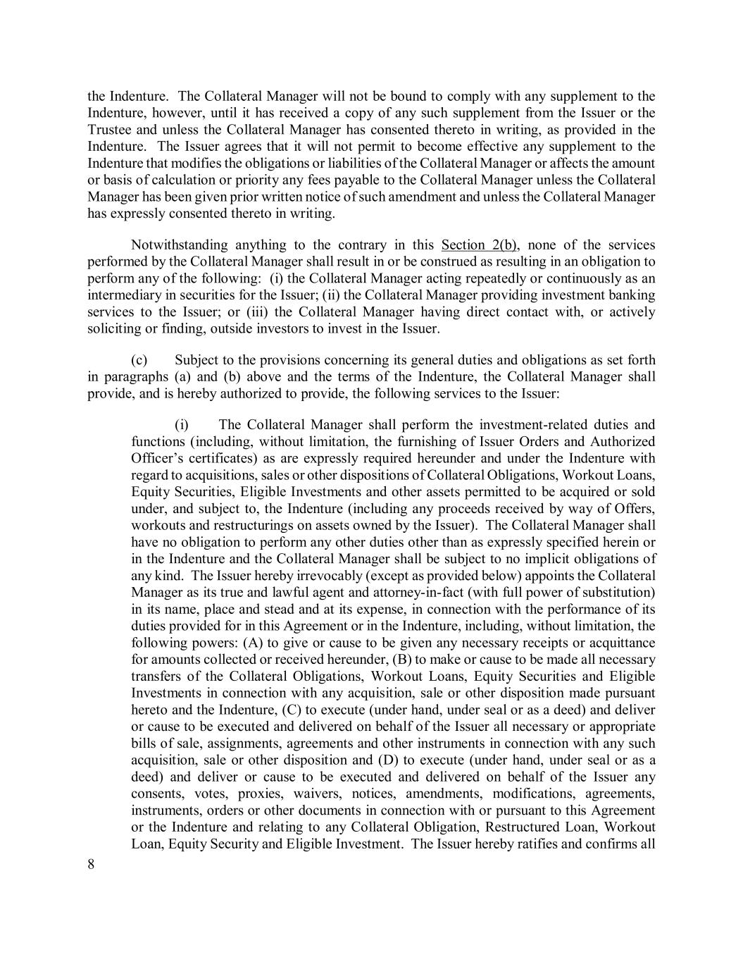8 the Indenture. The Collateral Manager will not be bound to comply with any supplement to the Indenture, however, until it has received a copy of any such supplement from the Issuer or the Trustee and unless the Collateral Manager has consented thereto in writing, as provided in the Indenture. The Issuer agrees that it will not permit to become effective any supplement to the Indenture that modifies the obligations or liabilities of the Collateral Manager or affects the amount or basis of calculation or priority any fees payable to the Collateral Manager unless the Collateral Manager has been given prior written notice of such amendment and unless the Collateral Manager has expressly consented thereto in writing. Notwithstanding anything to the contrary in this Section 2(b), none of the services performed by the Collateral Manager shall result in or be construed as resulting in an obligation to perform any of the following: (i) the Collateral Manager acting repeatedly or continuously as an intermediary in securities for the Issuer; (ii) the Collateral Manager providing investment banking services to the Issuer; or (iii) the Collateral Manager having direct contact with, or actively soliciting or finding, outside investors to invest in the Issuer. (c) Subject to the provisions concerning its general duties and obligations as set forth in paragraphs (a) and (b) above and the terms of the Indenture, the Collateral Manager shall provide, and is hereby authorized to provide, the following services to the Issuer: (i) The Collateral Manager shall perform the investment-related duties and functions (including, without limitation, the furnishing of Issuer Orders and Authorized Officer’s certificates) as are expressly required hereunder and under the Indenture with regard to acquisitions, sales or other dispositions of Collateral Obligations, Workout Loans, Equity Securities, Eligible Investments and other assets permitted to be acquired or sold under, and subject to, the Indenture (including any proceeds received by way of Offers, workouts and restructurings on assets owned by the Issuer). The Collateral Manager shall have no obligation to perform any other duties other than as expressly specified herein or in the Indenture and the Collateral Manager shall be subject to no implicit obligations of any kind. The Issuer hereby irrevocably (except as provided below) appoints the Collateral Manager as its true and lawful agent and attorney-in-fact (with full power of substitution) in its name, place and stead and at its expense, in connection with the performance of its duties provided for in this Agreement or in the Indenture, including, without limitation, the following powers: (A) to give or cause to be given any necessary receipts or acquittance for amounts collected or received hereunder, (B) to make or cause to be made all necessary transfers of the Collateral Obligations, Workout Loans, Equity Securities and Eligible Investments in connection with any acquisition, sale or other disposition made pursuant hereto and the Indenture, (C) to execute (under hand, under seal or as a deed) and deliver or cause to be executed and delivered on behalf of the Issuer all necessary or appropriate bills of sale, assignments, agreements and other instruments in connection with any such acquisition, sale or other disposition and (D) to execute (under hand, under seal or as a deed) and deliver or cause to be executed and delivered on behalf of the Issuer any consents, votes, proxies, waivers, notices, amendments, modifications, agreements, instruments, orders or other documents in connection with or pursuant to this Agreement or the Indenture and relating to any Collateral Obligation, Restructured Loan, Workout Loan, Equity Security and Eligible Investment. The Issuer hereby ratifies and confirms all