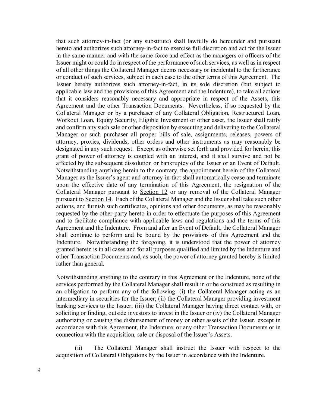 9 that such attorney-in-fact (or any substitute) shall lawfully do hereunder and pursuant hereto and authorizes such attorney-in-fact to exercise full discretion and act for the Issuer in the same manner and with the same force and effect as the managers or officers of the Issuer might or could do in respect of the performance of such services, as well as in respect of all other things the Collateral Manager deems necessary or incidental to the furtherance or conduct of such services, subject in each case to the other terms of this Agreement. The Issuer hereby authorizes such attorney-in-fact, in its sole discretion (but subject to applicable law and the provisions of this Agreement and the Indenture), to take all actions that it considers reasonably necessary and appropriate in respect of the Assets, this Agreement and the other Transaction Documents. Nevertheless, if so requested by the Collateral Manager or by a purchaser of any Collateral Obligation, Restructured Loan, Workout Loan, Equity Security, Eligible Investment or other asset, the Issuer shall ratify and confirm any such sale or other disposition by executing and delivering to the Collateral Manager or such purchaser all proper bills of sale, assignments, releases, powers of attorney, proxies, dividends, other orders and other instruments as may reasonably be designated in any such request. Except as otherwise set forth and provided for herein, this grant of power of attorney is coupled with an interest, and it shall survive and not be affected by the subsequent dissolution or bankruptcy of the Issuer or an Event of Default. Notwithstanding anything herein to the contrary, the appointment herein of the Collateral Manager as the Issuer’s agent and attorney-in-fact shall automatically cease and terminate upon the effective date of any termination of this Agreement, the resignation of the Collateral Manager pursuant to Section 12 or any removal of the Collateral Manager pursuant to Section 14. Each of the Collateral Manager and the Issuer shall take such other actions, and furnish such certificates, opinions and other documents, as may be reasonably requested by the other party hereto in order to effectuate the purposes of this Agreement and to facilitate compliance with applicable laws and regulations and the terms of this Agreement and the Indenture. From and after an Event of Default, the Collateral Manager shall continue to perform and be bound by the provisions of this Agreement and the Indenture. Notwithstanding the foregoing, it is understood that the power of attorney granted herein is in all cases and for all purposes qualified and limited by the Indenture and other Transaction Documents and, as such, the power of attorney granted hereby is limited rather than general. Notwithstanding anything to the contrary in this Agreement or the Indenture, none of the services performed by the Collateral Manager shall result in or be construed as resulting in an obligation to perform any of the following: (i) the Collateral Manager acting as an intermediary in securities for the Issuer; (ii) the Collateral Manager providing investment banking services to the Issuer; (iii) the Collateral Manager having direct contact with, or soliciting or finding, outside investors to invest in the Issuer or (iv) the Collateral Manager authorizing or causing the disbursement of money or other assets of the Issuer, except in accordance with this Agreement, the Indenture, or any other Transaction Documents or in connection with the acquisition, sale or disposal of the Issuer’s Assets. (ii) The Collateral Manager shall instruct the Issuer with respect to the acquisition of Collateral Obligations by the Issuer in accordance with the Indenture.