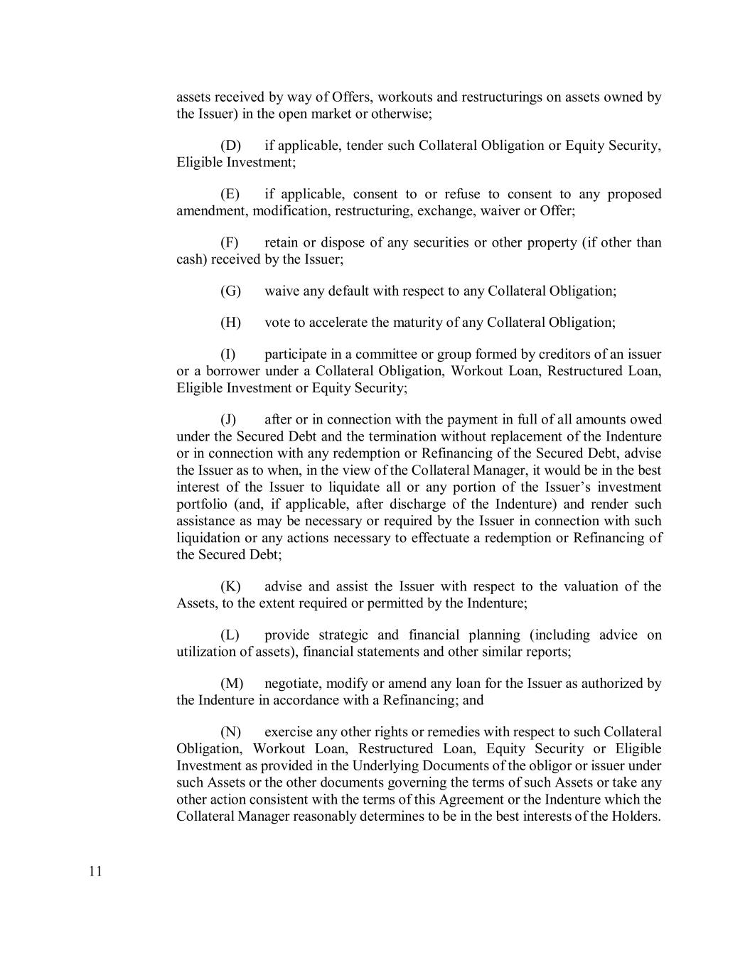 11 assets received by way of Offers, workouts and restructurings on assets owned by the Issuer) in the open market or otherwise; (D) if applicable, tender such Collateral Obligation or Equity Security, Eligible Investment; (E) if applicable, consent to or refuse to consent to any proposed amendment, modification, restructuring, exchange, waiver or Offer; (F) retain or dispose of any securities or other property (if other than cash) received by the Issuer; (G) waive any default with respect to any Collateral Obligation; (H) vote to accelerate the maturity of any Collateral Obligation; (I) participate in a committee or group formed by creditors of an issuer or a borrower under a Collateral Obligation, Workout Loan, Restructured Loan, Eligible Investment or Equity Security; (J) after or in connection with the payment in full of all amounts owed under the Secured Debt and the termination without replacement of the Indenture or in connection with any redemption or Refinancing of the Secured Debt, advise the Issuer as to when, in the view of the Collateral Manager, it would be in the best interest of the Issuer to liquidate all or any portion of the Issuer’s investment portfolio (and, if applicable, after discharge of the Indenture) and render such assistance as may be necessary or required by the Issuer in connection with such liquidation or any actions necessary to effectuate a redemption or Refinancing of the Secured Debt; (K) advise and assist the Issuer with respect to the valuation of the Assets, to the extent required or permitted by the Indenture; (L) provide strategic and financial planning (including advice on utilization of assets), financial statements and other similar reports; (M) negotiate, modify or amend any loan for the Issuer as authorized by the Indenture in accordance with a Refinancing; and (N) exercise any other rights or remedies with respect to such Collateral Obligation, Workout Loan, Restructured Loan, Equity Security or Eligible Investment as provided in the Underlying Documents of the obligor or issuer under such Assets or the other documents governing the terms of such Assets or take any other action consistent with the terms of this Agreement or the Indenture which the Collateral Manager reasonably determines to be in the best interests of the Holders.