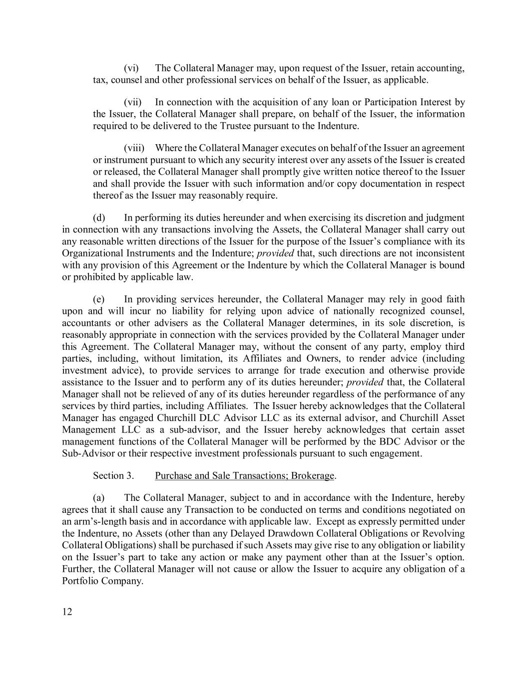 12 (vi) The Collateral Manager may, upon request of the Issuer, retain accounting, tax, counsel and other professional services on behalf of the Issuer, as applicable. (vii) In connection with the acquisition of any loan or Participation Interest by the Issuer, the Collateral Manager shall prepare, on behalf of the Issuer, the information required to be delivered to the Trustee pursuant to the Indenture. (viii) Where the Collateral Manager executes on behalf of the Issuer an agreement or instrument pursuant to which any security interest over any assets of the Issuer is created or released, the Collateral Manager shall promptly give written notice thereof to the Issuer and shall provide the Issuer with such information and/or copy documentation in respect thereof as the Issuer may reasonably require. (d) In performing its duties hereunder and when exercising its discretion and judgment in connection with any transactions involving the Assets, the Collateral Manager shall carry out any reasonable written directions of the Issuer for the purpose of the Issuer’s compliance with its Organizational Instruments and the Indenture; provided that, such directions are not inconsistent with any provision of this Agreement or the Indenture by which the Collateral Manager is bound or prohibited by applicable law. (e) In providing services hereunder, the Collateral Manager may rely in good faith upon and will incur no liability for relying upon advice of nationally recognized counsel, accountants or other advisers as the Collateral Manager determines, in its sole discretion, is reasonably appropriate in connection with the services provided by the Collateral Manager under this Agreement. The Collateral Manager may, without the consent of any party, employ third parties, including, without limitation, its Affiliates and Owners, to render advice (including investment advice), to provide services to arrange for trade execution and otherwise provide assistance to the Issuer and to perform any of its duties hereunder; provided that, the Collateral Manager shall not be relieved of any of its duties hereunder regardless of the performance of any services by third parties, including Affiliates. The Issuer hereby acknowledges that the Collateral Manager has engaged Churchill DLC Advisor LLC as its external advisor, and Churchill Asset Management LLC as a sub-advisor, and the Issuer hereby acknowledges that certain asset management functions of the Collateral Manager will be performed by the BDC Advisor or the Sub-Advisor or their respective investment professionals pursuant to such engagement. Section 3. Purchase and Sale Transactions; Brokerage. (a) The Collateral Manager, subject to and in accordance with the Indenture, hereby agrees that it shall cause any Transaction to be conducted on terms and conditions negotiated on an arm’s-length basis and in accordance with applicable law. Except as expressly permitted under the Indenture, no Assets (other than any Delayed Drawdown Collateral Obligations or Revolving Collateral Obligations) shall be purchased if such Assets may give rise to any obligation or liability on the Issuer’s part to take any action or make any payment other than at the Issuer’s option. Further, the Collateral Manager will not cause or allow the Issuer to acquire any obligation of a Portfolio Company.