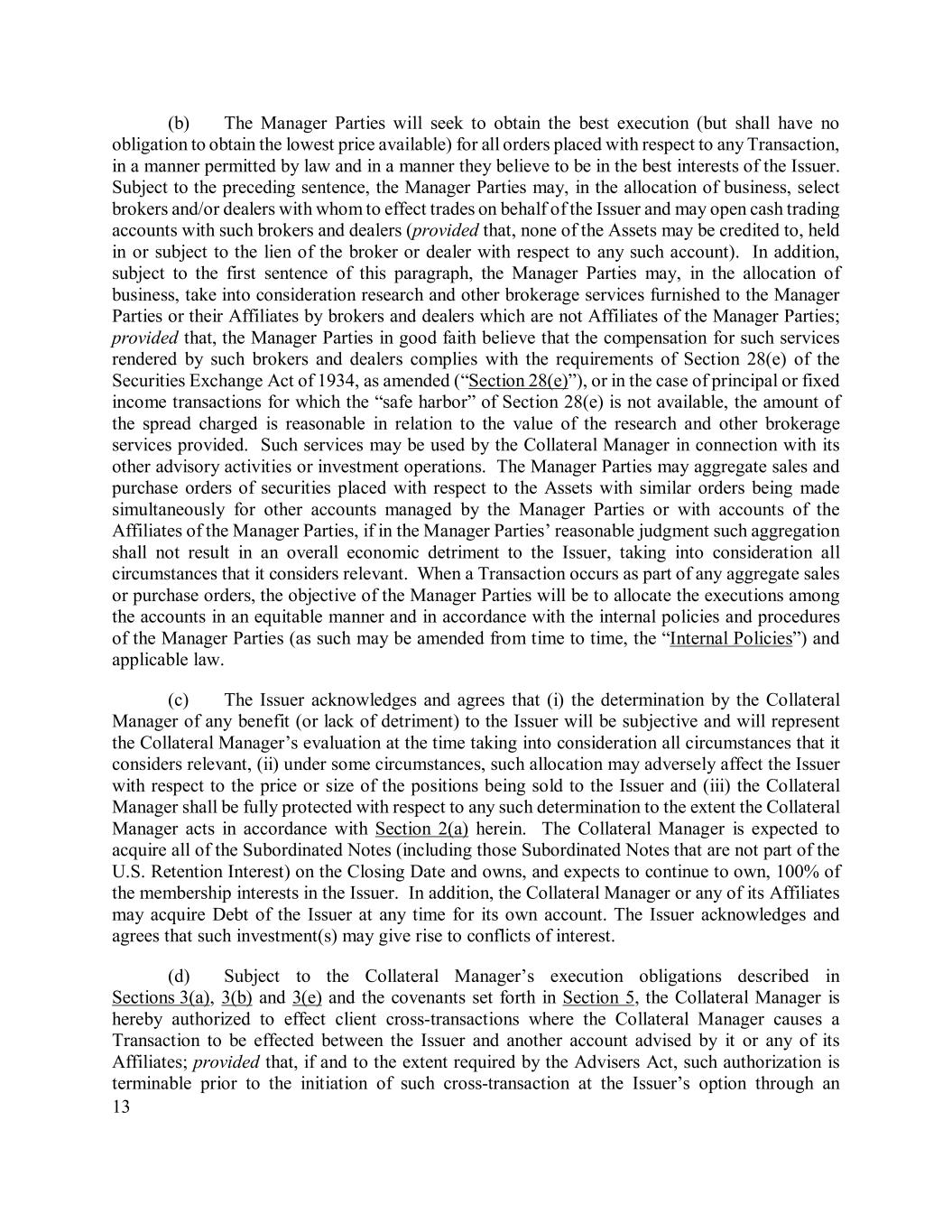 13 (b) The Manager Parties will seek to obtain the best execution (but shall have no obligation to obtain the lowest price available) for all orders placed with respect to any Transaction, in a manner permitted by law and in a manner they believe to be in the best interests of the Issuer. Subject to the preceding sentence, the Manager Parties may, in the allocation of business, select brokers and/or dealers with whom to effect trades on behalf of the Issuer and may open cash trading accounts with such brokers and dealers (provided that, none of the Assets may be credited to, held in or subject to the lien of the broker or dealer with respect to any such account). In addition, subject to the first sentence of this paragraph, the Manager Parties may, in the allocation of business, take into consideration research and other brokerage services furnished to the Manager Parties or their Affiliates by brokers and dealers which are not Affiliates of the Manager Parties; provided that, the Manager Parties in good faith believe that the compensation for such services rendered by such brokers and dealers complies with the requirements of Section 28(e) of the Securities Exchange Act of 1934, as amended (“Section 28(e)”), or in the case of principal or fixed income transactions for which the “safe harbor” of Section 28(e) is not available, the amount of the spread charged is reasonable in relation to the value of the research and other brokerage services provided. Such services may be used by the Collateral Manager in connection with its other advisory activities or investment operations. The Manager Parties may aggregate sales and purchase orders of securities placed with respect to the Assets with similar orders being made simultaneously for other accounts managed by the Manager Parties or with accounts of the Affiliates of the Manager Parties, if in the Manager Parties’ reasonable judgment such aggregation shall not result in an overall economic detriment to the Issuer, taking into consideration all circumstances that it considers relevant. When a Transaction occurs as part of any aggregate sales or purchase orders, the objective of the Manager Parties will be to allocate the executions among the accounts in an equitable manner and in accordance with the internal policies and procedures of the Manager Parties (as such may be amended from time to time, the “Internal Policies”) and applicable law. (c) The Issuer acknowledges and agrees that (i) the determination by the Collateral Manager of any benefit (or lack of detriment) to the Issuer will be subjective and will represent the Collateral Manager’s evaluation at the time taking into consideration all circumstances that it considers relevant, (ii) under some circumstances, such allocation may adversely affect the Issuer with respect to the price or size of the positions being sold to the Issuer and (iii) the Collateral Manager shall be fully protected with respect to any such determination to the extent the Collateral Manager acts in accordance with Section 2(a) herein. The Collateral Manager is expected to acquire all of the Subordinated Notes (including those Subordinated Notes that are not part of the U.S. Retention Interest) on the Closing Date and owns, and expects to continue to own, 100% of the membership interests in the Issuer. In addition, the Collateral Manager or any of its Affiliates may acquire Debt of the Issuer at any time for its own account. The Issuer acknowledges and agrees that such investment(s) may give rise to conflicts of interest. (d) Subject to the Collateral Manager’s execution obligations described in Sections 3(a), 3(b) and 3(e) and the covenants set forth in Section 5, the Collateral Manager is hereby authorized to effect client cross-transactions where the Collateral Manager causes a Transaction to be effected between the Issuer and another account advised by it or any of its Affiliates; provided that, if and to the extent required by the Advisers Act, such authorization is terminable prior to the initiation of such cross-transaction at the Issuer’s option through an