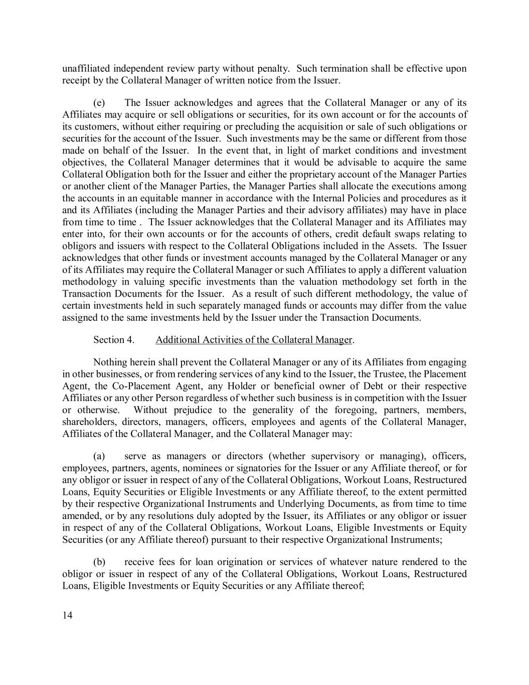 14 unaffiliated independent review party without penalty. Such termination shall be effective upon receipt by the Collateral Manager of written notice from the Issuer. (e) The Issuer acknowledges and agrees that the Collateral Manager or any of its Affiliates may acquire or sell obligations or securities, for its own account or for the accounts of its customers, without either requiring or precluding the acquisition or sale of such obligations or securities for the account of the Issuer. Such investments may be the same or different from those made on behalf of the Issuer. In the event that, in light of market conditions and investment objectives, the Collateral Manager determines that it would be advisable to acquire the same Collateral Obligation both for the Issuer and either the proprietary account of the Manager Parties or another client of the Manager Parties, the Manager Parties shall allocate the executions among the accounts in an equitable manner in accordance with the Internal Policies and procedures as it and its Affiliates (including the Manager Parties and their advisory affiliates) may have in place from time to time . The Issuer acknowledges that the Collateral Manager and its Affiliates may enter into, for their own accounts or for the accounts of others, credit default swaps relating to obligors and issuers with respect to the Collateral Obligations included in the Assets. The Issuer acknowledges that other funds or investment accounts managed by the Collateral Manager or any of its Affiliates may require the Collateral Manager or such Affiliates to apply a different valuation methodology in valuing specific investments than the valuation methodology set forth in the Transaction Documents for the Issuer. As a result of such different methodology, the value of certain investments held in such separately managed funds or accounts may differ from the value assigned to the same investments held by the Issuer under the Transaction Documents. Section 4. Additional Activities of the Collateral Manager. Nothing herein shall prevent the Collateral Manager or any of its Affiliates from engaging in other businesses, or from rendering services of any kind to the Issuer, the Trustee, the Placement Agent, the Co-Placement Agent, any Holder or beneficial owner of Debt or their respective Affiliates or any other Person regardless of whether such business is in competition with the Issuer or otherwise. Without prejudice to the generality of the foregoing, partners, members, shareholders, directors, managers, officers, employees and agents of the Collateral Manager, Affiliates of the Collateral Manager, and the Collateral Manager may: (a) serve as managers or directors (whether supervisory or managing), officers, employees, partners, agents, nominees or signatories for the Issuer or any Affiliate thereof, or for any obligor or issuer in respect of any of the Collateral Obligations, Workout Loans, Restructured Loans, Equity Securities or Eligible Investments or any Affiliate thereof, to the extent permitted by their respective Organizational Instruments and Underlying Documents, as from time to time amended, or by any resolutions duly adopted by the Issuer, its Affiliates or any obligor or issuer in respect of any of the Collateral Obligations, Workout Loans, Eligible Investments or Equity Securities (or any Affiliate thereof) pursuant to their respective Organizational Instruments; (b) receive fees for loan origination or services of whatever nature rendered to the obligor or issuer in respect of any of the Collateral Obligations, Workout Loans, Restructured Loans, Eligible Investments or Equity Securities or any Affiliate thereof;