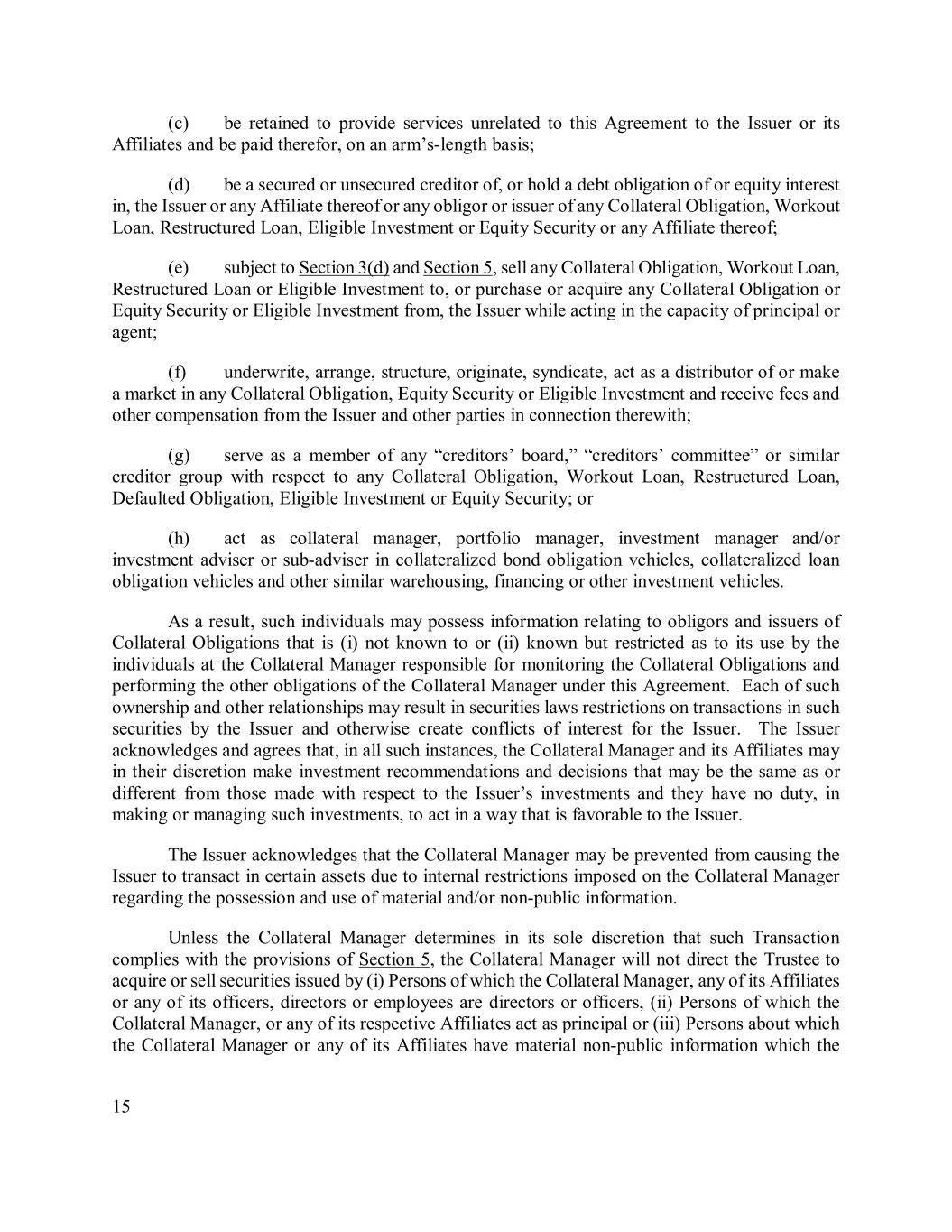 15 (c) be retained to provide services unrelated to this Agreement to the Issuer or its Affiliates and be paid therefor, on an arm’s-length basis; (d) be a secured or unsecured creditor of, or hold a debt obligation of or equity interest in, the Issuer or any Affiliate thereof or any obligor or issuer of any Collateral Obligation, Workout Loan, Restructured Loan, Eligible Investment or Equity Security or any Affiliate thereof; (e) subject to Section 3(d) and Section 5, sell any Collateral Obligation, Workout Loan, Restructured Loan or Eligible Investment to, or purchase or acquire any Collateral Obligation or Equity Security or Eligible Investment from, the Issuer while acting in the capacity of principal or agent; (f) underwrite, arrange, structure, originate, syndicate, act as a distributor of or make a market in any Collateral Obligation, Equity Security or Eligible Investment and receive fees and other compensation from the Issuer and other parties in connection therewith; (g) serve as a member of any “creditors’ board,” “creditors’ committee” or similar creditor group with respect to any Collateral Obligation, Workout Loan, Restructured Loan, Defaulted Obligation, Eligible Investment or Equity Security; or (h) act as collateral manager, portfolio manager, investment manager and/or investment adviser or sub-adviser in collateralized bond obligation vehicles, collateralized loan obligation vehicles and other similar warehousing, financing or other investment vehicles. As a result, such individuals may possess information relating to obligors and issuers of Collateral Obligations that is (i) not known to or (ii) known but restricted as to its use by the individuals at the Collateral Manager responsible for monitoring the Collateral Obligations and performing the other obligations of the Collateral Manager under this Agreement. Each of such ownership and other relationships may result in securities laws restrictions on transactions in such securities by the Issuer and otherwise create conflicts of interest for the Issuer. The Issuer acknowledges and agrees that, in all such instances, the Collateral Manager and its Affiliates may in their discretion make investment recommendations and decisions that may be the same as or different from those made with respect to the Issuer’s investments and they have no duty, in making or managing such investments, to act in a way that is favorable to the Issuer. The Issuer acknowledges that the Collateral Manager may be prevented from causing the Issuer to transact in certain assets due to internal restrictions imposed on the Collateral Manager regarding the possession and use of material and/or non-public information. Unless the Collateral Manager determines in its sole discretion that such Transaction complies with the provisions of Section 5, the Collateral Manager will not direct the Trustee to acquire or sell securities issued by (i) Persons of which the Collateral Manager, any of its Affiliates or any of its officers, directors or employees are directors or officers, (ii) Persons of which the Collateral Manager, or any of its respective Affiliates act as principal or (iii) Persons about which the Collateral Manager or any of its Affiliates have material non-public information which the