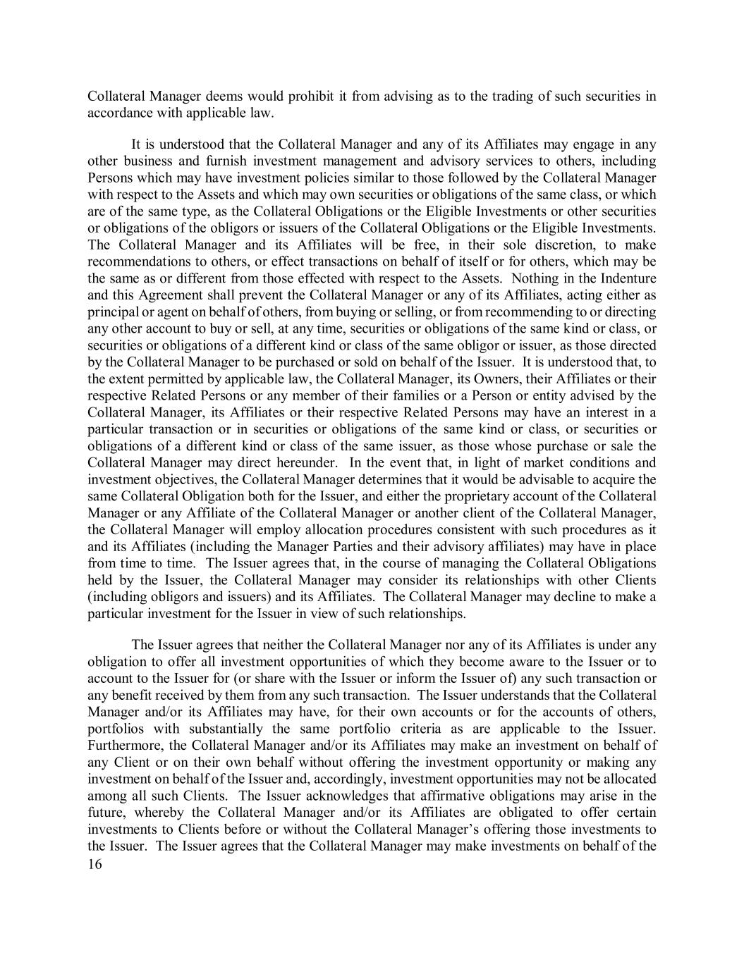 16 Collateral Manager deems would prohibit it from advising as to the trading of such securities in accordance with applicable law. It is understood that the Collateral Manager and any of its Affiliates may engage in any other business and furnish investment management and advisory services to others, including Persons which may have investment policies similar to those followed by the Collateral Manager with respect to the Assets and which may own securities or obligations of the same class, or which are of the same type, as the Collateral Obligations or the Eligible Investments or other securities or obligations of the obligors or issuers of the Collateral Obligations or the Eligible Investments. The Collateral Manager and its Affiliates will be free, in their sole discretion, to make recommendations to others, or effect transactions on behalf of itself or for others, which may be the same as or different from those effected with respect to the Assets. Nothing in the Indenture and this Agreement shall prevent the Collateral Manager or any of its Affiliates, acting either as principal or agent on behalf of others, from buying or selling, or from recommending to or directing any other account to buy or sell, at any time, securities or obligations of the same kind or class, or securities or obligations of a different kind or class of the same obligor or issuer, as those directed by the Collateral Manager to be purchased or sold on behalf of the Issuer. It is understood that, to the extent permitted by applicable law, the Collateral Manager, its Owners, their Affiliates or their respective Related Persons or any member of their families or a Person or entity advised by the Collateral Manager, its Affiliates or their respective Related Persons may have an interest in a particular transaction or in securities or obligations of the same kind or class, or securities or obligations of a different kind or class of the same issuer, as those whose purchase or sale the Collateral Manager may direct hereunder. In the event that, in light of market conditions and investment objectives, the Collateral Manager determines that it would be advisable to acquire the same Collateral Obligation both for the Issuer, and either the proprietary account of the Collateral Manager or any Affiliate of the Collateral Manager or another client of the Collateral Manager, the Collateral Manager will employ allocation procedures consistent with such procedures as it and its Affiliates (including the Manager Parties and their advisory affiliates) may have in place from time to time. The Issuer agrees that, in the course of managing the Collateral Obligations held by the Issuer, the Collateral Manager may consider its relationships with other Clients (including obligors and issuers) and its Affiliates. The Collateral Manager may decline to make a particular investment for the Issuer in view of such relationships. The Issuer agrees that neither the Collateral Manager nor any of its Affiliates is under any obligation to offer all investment opportunities of which they become aware to the Issuer or to account to the Issuer for (or share with the Issuer or inform the Issuer of) any such transaction or any benefit received by them from any such transaction. The Issuer understands that the Collateral Manager and/or its Affiliates may have, for their own accounts or for the accounts of others, portfolios with substantially the same portfolio criteria as are applicable to the Issuer. Furthermore, the Collateral Manager and/or its Affiliates may make an investment on behalf of any Client or on their own behalf without offering the investment opportunity or making any investment on behalf of the Issuer and, accordingly, investment opportunities may not be allocated among all such Clients. The Issuer acknowledges that affirmative obligations may arise in the future, whereby the Collateral Manager and/or its Affiliates are obligated to offer certain investments to Clients before or without the Collateral Manager’s offering those investments to the Issuer. The Issuer agrees that the Collateral Manager may make investments on behalf of the