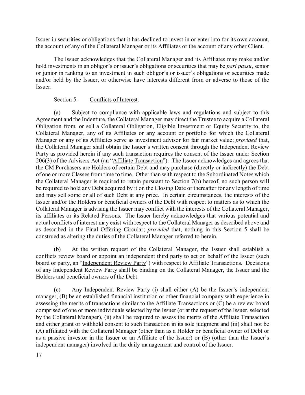 17 Issuer in securities or obligations that it has declined to invest in or enter into for its own account, the account of any of the Collateral Manager or its Affiliates or the account of any other Client. The Issuer acknowledges that the Collateral Manager and its Affiliates may make and/or hold investments in an obligor’s or issuer’s obligations or securities that may be pari passu, senior or junior in ranking to an investment in such obligor’s or issuer’s obligations or securities made and/or held by the Issuer, or otherwise have interests different from or adverse to those of the Issuer. Section 5. Conflicts of Interest. (a) Subject to compliance with applicable laws and regulations and subject to this Agreement and the Indenture, the Collateral Manager may direct the Trustee to acquire a Collateral Obligation from, or sell a Collateral Obligation, Eligible Investment or Equity Security to, the Collateral Manager, any of its Affiliates or any account or portfolio for which the Collateral Manager or any of its Affiliates serve as investment advisor for fair market value; provided that, the Collateral Manager shall obtain the Issuer’s written consent through the Independent Review Party as provided herein if any such transaction requires the consent of the Issuer under Section 206(3) of the Advisers Act (an “Affiliate Transaction”). The Issuer acknowledges and agrees that the CM Purchasers are Holders of certain Debt and may purchase (directly or indirectly) the Debt of one or more Classes from time to time. Other than with respect to the Subordinated Notes which the Collateral Manager is required to retain pursuant to Section 7(b) hereof, no such person will be required to hold any Debt acquired by it on the Closing Date or thereafter for any length of time and may sell some or all of such Debt at any price. In certain circumstances, the interests of the Issuer and/or the Holders or beneficial owners of the Debt with respect to matters as to which the Collateral Manager is advising the Issuer may conflict with the interests of the Collateral Manager, its affiliates or its Related Persons. The Issuer hereby acknowledges that various potential and actual conflicts of interest may exist with respect to the Collateral Manager as described above and as described in the Final Offering Circular; provided that, nothing in this Section 5 shall be construed as altering the duties of the Collateral Manager referred to herein. (b) At the written request of the Collateral Manager, the Issuer shall establish a conflicts review board or appoint an independent third party to act on behalf of the Issuer (such board or party, an “Independent Review Party”) with respect to Affiliate Transactions. Decisions of any Independent Review Party shall be binding on the Collateral Manager, the Issuer and the Holders and beneficial owners of the Debt. (c) Any Independent Review Party (i) shall either (A) be the Issuer’s independent manager, (B) be an established financial institution or other financial company with experience in assessing the merits of transactions similar to the Affiliate Transactions or (C) be a review board comprised of one or more individuals selected by the Issuer (or at the request of the Issuer, selected by the Collateral Manager), (ii) shall be required to assess the merits of the Affiliate Transaction and either grant or withhold consent to such transaction in its sole judgment and (iii) shall not be (A) affiliated with the Collateral Manager (other than as a Holder or beneficial owner of Debt or as a passive investor in the Issuer or an Affiliate of the Issuer) or (B) (other than the Issuer’s independent manager) involved in the daily management and control of the Issuer.