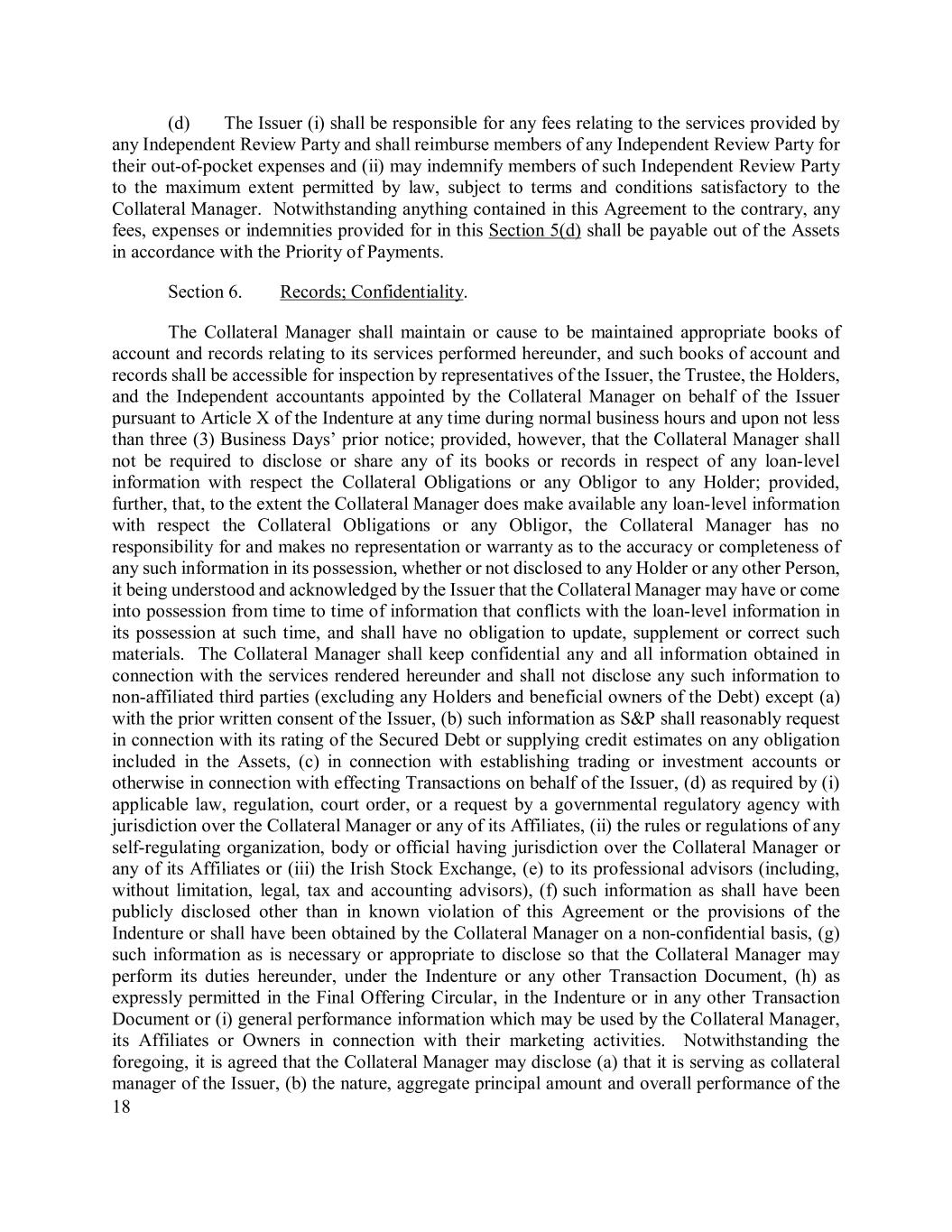 18 (d) The Issuer (i) shall be responsible for any fees relating to the services provided by any Independent Review Party and shall reimburse members of any Independent Review Party for their out-of-pocket expenses and (ii) may indemnify members of such Independent Review Party to the maximum extent permitted by law, subject to terms and conditions satisfactory to the Collateral Manager. Notwithstanding anything contained in this Agreement to the contrary, any fees, expenses or indemnities provided for in this Section 5(d) shall be payable out of the Assets in accordance with the Priority of Payments. Section 6. Records; Confidentiality. The Collateral Manager shall maintain or cause to be maintained appropriate books of account and records relating to its services performed hereunder, and such books of account and records shall be accessible for inspection by representatives of the Issuer, the Trustee, the Holders, and the Independent accountants appointed by the Collateral Manager on behalf of the Issuer pursuant to Article X of the Indenture at any time during normal business hours and upon not less than three (3) Business Days’ prior notice; provided, however, that the Collateral Manager shall not be required to disclose or share any of its books or records in respect of any loan-level information with respect the Collateral Obligations or any Obligor to any Holder; provided, further, that, to the extent the Collateral Manager does make available any loan-level information with respect the Collateral Obligations or any Obligor, the Collateral Manager has no responsibility for and makes no representation or warranty as to the accuracy or completeness of any such information in its possession, whether or not disclosed to any Holder or any other Person, it being understood and acknowledged by the Issuer that the Collateral Manager may have or come into possession from time to time of information that conflicts with the loan-level information in its possession at such time, and shall have no obligation to update, supplement or correct such materials. The Collateral Manager shall keep confidential any and all information obtained in connection with the services rendered hereunder and shall not disclose any such information to non-affiliated third parties (excluding any Holders and beneficial owners of the Debt) except (a) with the prior written consent of the Issuer, (b) such information as S&P shall reasonably request in connection with its rating of the Secured Debt or supplying credit estimates on any obligation included in the Assets, (c) in connection with establishing trading or investment accounts or otherwise in connection with effecting Transactions on behalf of the Issuer, (d) as required by (i) applicable law, regulation, court order, or a request by a governmental regulatory agency with jurisdiction over the Collateral Manager or any of its Affiliates, (ii) the rules or regulations of any self-regulating organization, body or official having jurisdiction over the Collateral Manager or any of its Affiliates or (iii) the Irish Stock Exchange, (e) to its professional advisors (including, without limitation, legal, tax and accounting advisors), (f) such information as shall have been publicly disclosed other than in known violation of this Agreement or the provisions of the Indenture or shall have been obtained by the Collateral Manager on a non-confidential basis, (g) such information as is necessary or appropriate to disclose so that the Collateral Manager may perform its duties hereunder, under the Indenture or any other Transaction Document, (h) as expressly permitted in the Final Offering Circular, in the Indenture or in any other Transaction Document or (i) general performance information which may be used by the Collateral Manager, its Affiliates or Owners in connection with their marketing activities. Notwithstanding the foregoing, it is agreed that the Collateral Manager may disclose (a) that it is serving as collateral manager of the Issuer, (b) the nature, aggregate principal amount and overall performance of the