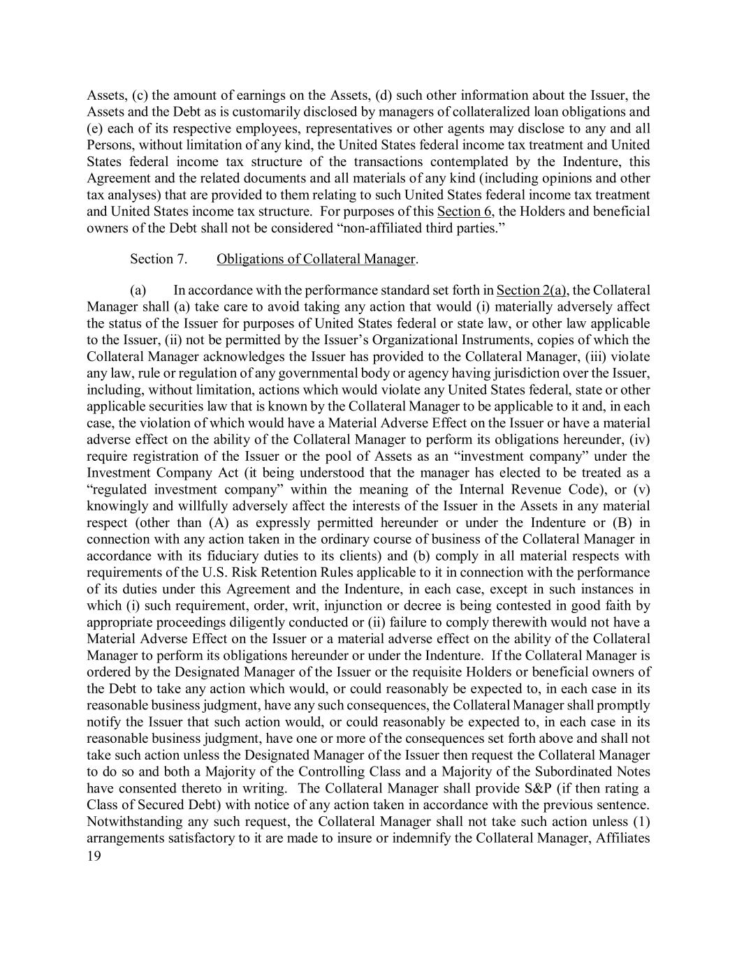 19 Assets, (c) the amount of earnings on the Assets, (d) such other information about the Issuer, the Assets and the Debt as is customarily disclosed by managers of collateralized loan obligations and (e) each of its respective employees, representatives or other agents may disclose to any and all Persons, without limitation of any kind, the United States federal income tax treatment and United States federal income tax structure of the transactions contemplated by the Indenture, this Agreement and the related documents and all materials of any kind (including opinions and other tax analyses) that are provided to them relating to such United States federal income tax treatment and United States income tax structure. For purposes of this Section 6, the Holders and beneficial owners of the Debt shall not be considered “non-affiliated third parties.” Section 7. Obligations of Collateral Manager. (a) In accordance with the performance standard set forth in Section 2(a), the Collateral Manager shall (a) take care to avoid taking any action that would (i) materially adversely affect the status of the Issuer for purposes of United States federal or state law, or other law applicable to the Issuer, (ii) not be permitted by the Issuer’s Organizational Instruments, copies of which the Collateral Manager acknowledges the Issuer has provided to the Collateral Manager, (iii) violate any law, rule or regulation of any governmental body or agency having jurisdiction over the Issuer, including, without limitation, actions which would violate any United States federal, state or other applicable securities law that is known by the Collateral Manager to be applicable to it and, in each case, the violation of which would have a Material Adverse Effect on the Issuer or have a material adverse effect on the ability of the Collateral Manager to perform its obligations hereunder, (iv) require registration of the Issuer or the pool of Assets as an “investment company” under the Investment Company Act (it being understood that the manager has elected to be treated as a “regulated investment company” within the meaning of the Internal Revenue Code), or (v) knowingly and willfully adversely affect the interests of the Issuer in the Assets in any material respect (other than (A) as expressly permitted hereunder or under the Indenture or (B) in connection with any action taken in the ordinary course of business of the Collateral Manager in accordance with its fiduciary duties to its clients) and (b) comply in all material respects with requirements of the U.S. Risk Retention Rules applicable to it in connection with the performance of its duties under this Agreement and the Indenture, in each case, except in such instances in which (i) such requirement, order, writ, injunction or decree is being contested in good faith by appropriate proceedings diligently conducted or (ii) failure to comply therewith would not have a Material Adverse Effect on the Issuer or a material adverse effect on the ability of the Collateral Manager to perform its obligations hereunder or under the Indenture. If the Collateral Manager is ordered by the Designated Manager of the Issuer or the requisite Holders or beneficial owners of the Debt to take any action which would, or could reasonably be expected to, in each case in its reasonable business judgment, have any such consequences, the Collateral Manager shall promptly notify the Issuer that such action would, or could reasonably be expected to, in each case in its reasonable business judgment, have one or more of the consequences set forth above and shall not take such action unless the Designated Manager of the Issuer then request the Collateral Manager to do so and both a Majority of the Controlling Class and a Majority of the Subordinated Notes have consented thereto in writing. The Collateral Manager shall provide S&P (if then rating a Class of Secured Debt) with notice of any action taken in accordance with the previous sentence. Notwithstanding any such request, the Collateral Manager shall not take such action unless (1) arrangements satisfactory to it are made to insure or indemnify the Collateral Manager, Affiliates