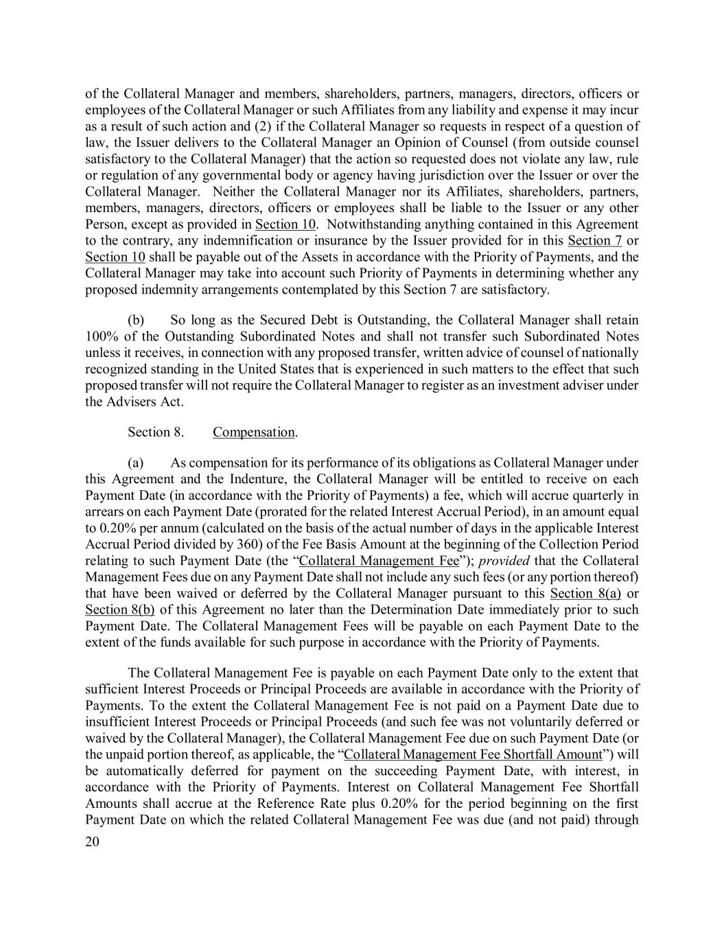 20 of the Collateral Manager and members, shareholders, partners, managers, directors, officers or employees of the Collateral Manager or such Affiliates from any liability and expense it may incur as a result of such action and (2) if the Collateral Manager so requests in respect of a question of law, the Issuer delivers to the Collateral Manager an Opinion of Counsel (from outside counsel satisfactory to the Collateral Manager) that the action so requested does not violate any law, rule or regulation of any governmental body or agency having jurisdiction over the Issuer or over the Collateral Manager. Neither the Collateral Manager nor its Affiliates, shareholders, partners, members, managers, directors, officers or employees shall be liable to the Issuer or any other Person, except as provided in Section 10. Notwithstanding anything contained in this Agreement to the contrary, any indemnification or insurance by the Issuer provided for in this Section 7 or Section 10 shall be payable out of the Assets in accordance with the Priority of Payments, and the Collateral Manager may take into account such Priority of Payments in determining whether any proposed indemnity arrangements contemplated by this Section 7 are satisfactory. (b) So long as the Secured Debt is Outstanding, the Collateral Manager shall retain 100% of the Outstanding Subordinated Notes and shall not transfer such Subordinated Notes unless it receives, in connection with any proposed transfer, written advice of counsel of nationally recognized standing in the United States that is experienced in such matters to the effect that such proposed transfer will not require the Collateral Manager to register as an investment adviser under the Advisers Act. Section 8. Compensation. (a) As compensation for its performance of its obligations as Collateral Manager under this Agreement and the Indenture, the Collateral Manager will be entitled to receive on each Payment Date (in accordance with the Priority of Payments) a fee, which will accrue quarterly in arrears on each Payment Date (prorated for the related Interest Accrual Period), in an amount equal to 0.20% per annum (calculated on the basis of the actual number of days in the applicable Interest Accrual Period divided by 360) of the Fee Basis Amount at the beginning of the Collection Period relating to such Payment Date (the “Collateral Management Fee”); provided that the Collateral Management Fees due on any Payment Date shall not include any such fees (or any portion thereof) that have been waived or deferred by the Collateral Manager pursuant to this Section 8(a) or Section 8(b) of this Agreement no later than the Determination Date immediately prior to such Payment Date. The Collateral Management Fees will be payable on each Payment Date to the extent of the funds available for such purpose in accordance with the Priority of Payments. The Collateral Management Fee is payable on each Payment Date only to the extent that sufficient Interest Proceeds or Principal Proceeds are available in accordance with the Priority of Payments. To the extent the Collateral Management Fee is not paid on a Payment Date due to insufficient Interest Proceeds or Principal Proceeds (and such fee was not voluntarily deferred or waived by the Collateral Manager), the Collateral Management Fee due on such Payment Date (or the unpaid portion thereof, as applicable, the “Collateral Management Fee Shortfall Amount”) will be automatically deferred for payment on the succeeding Payment Date, with interest, in accordance with the Priority of Payments. Interest on Collateral Management Fee Shortfall Amounts shall accrue at the Reference Rate plus 0.20% for the period beginning on the first Payment Date on which the related Collateral Management Fee was due (and not paid) through