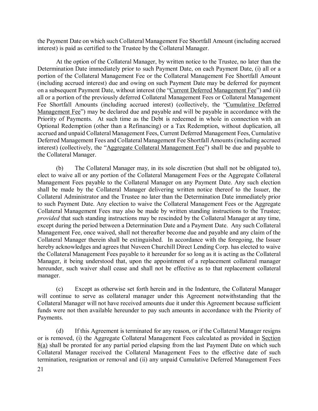 21 the Payment Date on which such Collateral Management Fee Shortfall Amount (including accrued interest) is paid as certified to the Trustee by the Collateral Manager. At the option of the Collateral Manager, by written notice to the Trustee, no later than the Determination Date immediately prior to such Payment Date, on each Payment Date, (i) all or a portion of the Collateral Management Fee or the Collateral Management Fee Shortfall Amount (including accrued interest) due and owing on such Payment Date may be deferred for payment on a subsequent Payment Date, without interest (the “Current Deferred Management Fee”) and (ii) all or a portion of the previously deferred Collateral Management Fees or Collateral Management Fee Shortfall Amounts (including accrued interest) (collectively, the “Cumulative Deferred Management Fee”) may be declared due and payable and will be payable in accordance with the Priority of Payments. At such time as the Debt is redeemed in whole in connection with an Optional Redemption (other than a Refinancing) or a Tax Redemption, without duplication, all accrued and unpaid Collateral Management Fees, Current Deferred Management Fees, Cumulative Deferred Management Fees and Collateral Management Fee Shortfall Amounts (including accrued interest) (collectively, the “Aggregate Collateral Management Fee”) shall be due and payable to the Collateral Manager. (b) The Collateral Manager may, in its sole discretion (but shall not be obligated to), elect to waive all or any portion of the Collateral Management Fees or the Aggregate Collateral Management Fees payable to the Collateral Manager on any Payment Date. Any such election shall be made by the Collateral Manager delivering written notice thereof to the Issuer, the Collateral Administrator and the Trustee no later than the Determination Date immediately prior to such Payment Date. Any election to waive the Collateral Management Fees or the Aggregate Collateral Management Fees may also be made by written standing instructions to the Trustee; provided that such standing instructions may be rescinded by the Collateral Manager at any time, except during the period between a Determination Date and a Payment Date. Any such Collateral Management Fee, once waived, shall not thereafter become due and payable and any claim of the Collateral Manager therein shall be extinguished. In accordance with the foregoing, the Issuer hereby acknowledges and agrees that Nuveen Churchill Direct Lending Corp. has elected to waive the Collateral Management Fees payable to it hereunder for so long as it is acting as the Collateral Manager, it being understood that, upon the appointment of a replacement collateral manager hereunder, such waiver shall cease and shall not be effective as to that replacement collateral manager. (c) Except as otherwise set forth herein and in the Indenture, the Collateral Manager will continue to serve as collateral manager under this Agreement notwithstanding that the Collateral Manager will not have received amounts due it under this Agreement because sufficient funds were not then available hereunder to pay such amounts in accordance with the Priority of Payments. (d) If this Agreement is terminated for any reason, or if the Collateral Manager resigns or is removed, (i) the Aggregate Collateral Management Fees calculated as provided in Section 8(a) shall be prorated for any partial period elapsing from the last Payment Date on which such Collateral Manager received the Collateral Management Fees to the effective date of such termination, resignation or removal and (ii) any unpaid Cumulative Deferred Management Fees