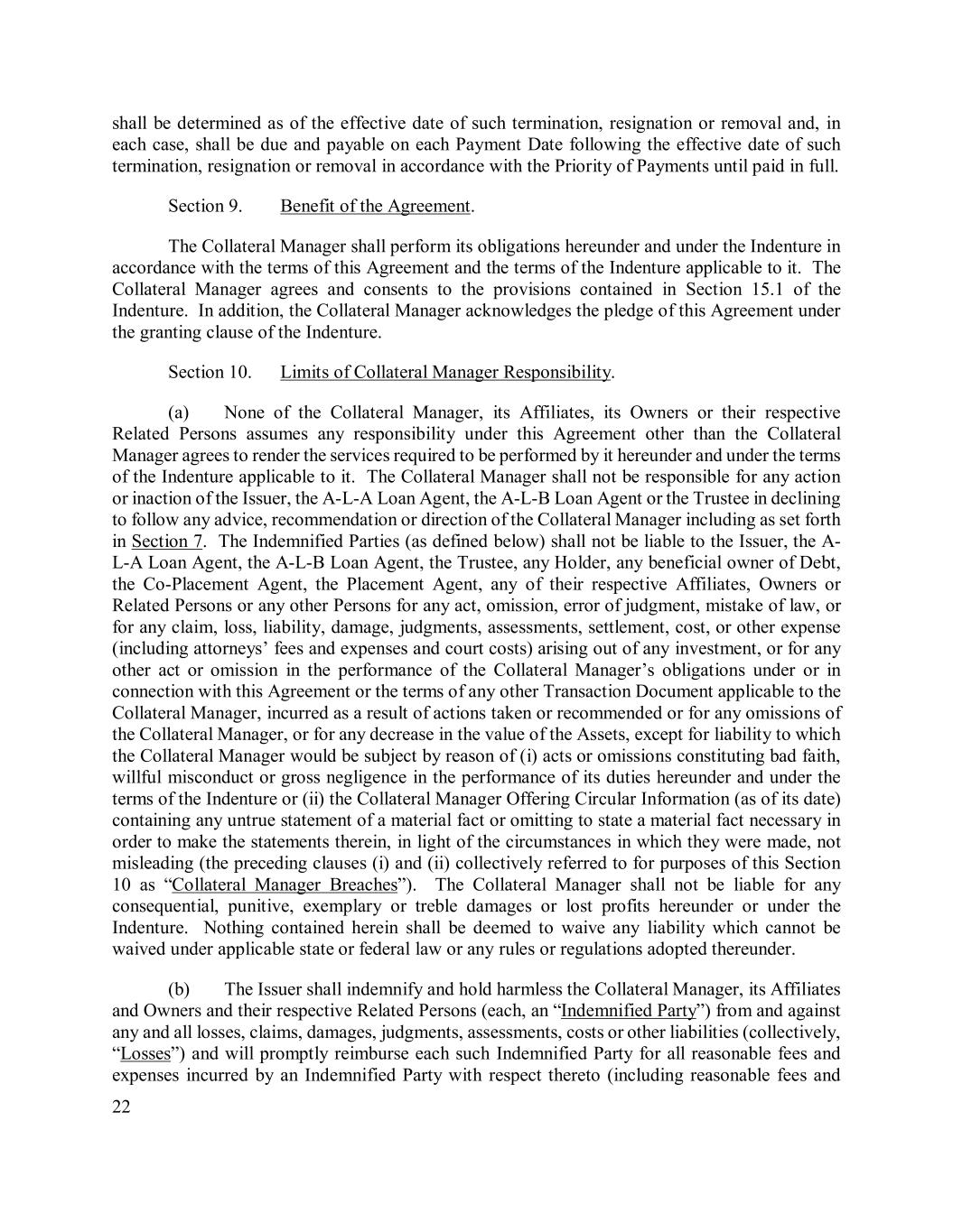 22 shall be determined as of the effective date of such termination, resignation or removal and, in each case, shall be due and payable on each Payment Date following the effective date of such termination, resignation or removal in accordance with the Priority of Payments until paid in full. Section 9. Benefit of the Agreement. The Collateral Manager shall perform its obligations hereunder and under the Indenture in accordance with the terms of this Agreement and the terms of the Indenture applicable to it. The Collateral Manager agrees and consents to the provisions contained in Section 15.1 of the Indenture. In addition, the Collateral Manager acknowledges the pledge of this Agreement under the granting clause of the Indenture. Section 10. Limits of Collateral Manager Responsibility. (a) None of the Collateral Manager, its Affiliates, its Owners or their respective Related Persons assumes any responsibility under this Agreement other than the Collateral Manager agrees to render the services required to be performed by it hereunder and under the terms of the Indenture applicable to it. The Collateral Manager shall not be responsible for any action or inaction of the Issuer, the A-L-A Loan Agent, the A-L-B Loan Agent or the Trustee in declining to follow any advice, recommendation or direction of the Collateral Manager including as set forth in Section 7. The Indemnified Parties (as defined below) shall not be liable to the Issuer, the A- L-A Loan Agent, the A-L-B Loan Agent, the Trustee, any Holder, any beneficial owner of Debt, the Co-Placement Agent, the Placement Agent, any of their respective Affiliates, Owners or Related Persons or any other Persons for any act, omission, error of judgment, mistake of law, or for any claim, loss, liability, damage, judgments, assessments, settlement, cost, or other expense (including attorneys’ fees and expenses and court costs) arising out of any investment, or for any other act or omission in the performance of the Collateral Manager’s obligations under or in connection with this Agreement or the terms of any other Transaction Document applicable to the Collateral Manager, incurred as a result of actions taken or recommended or for any omissions of the Collateral Manager, or for any decrease in the value of the Assets, except for liability to which the Collateral Manager would be subject by reason of (i) acts or omissions constituting bad faith, willful misconduct or gross negligence in the performance of its duties hereunder and under the terms of the Indenture or (ii) the Collateral Manager Offering Circular Information (as of its date) containing any untrue statement of a material fact or omitting to state a material fact necessary in order to make the statements therein, in light of the circumstances in which they were made, not misleading (the preceding clauses (i) and (ii) collectively referred to for purposes of this Section 10 as “Collateral Manager Breaches”). The Collateral Manager shall not be liable for any consequential, punitive, exemplary or treble damages or lost profits hereunder or under the Indenture. Nothing contained herein shall be deemed to waive any liability which cannot be waived under applicable state or federal law or any rules or regulations adopted thereunder. (b) The Issuer shall indemnify and hold harmless the Collateral Manager, its Affiliates and Owners and their respective Related Persons (each, an “Indemnified Party”) from and against any and all losses, claims, damages, judgments, assessments, costs or other liabilities (collectively, “Losses”) and will promptly reimburse each such Indemnified Party for all reasonable fees and expenses incurred by an Indemnified Party with respect thereto (including reasonable fees and