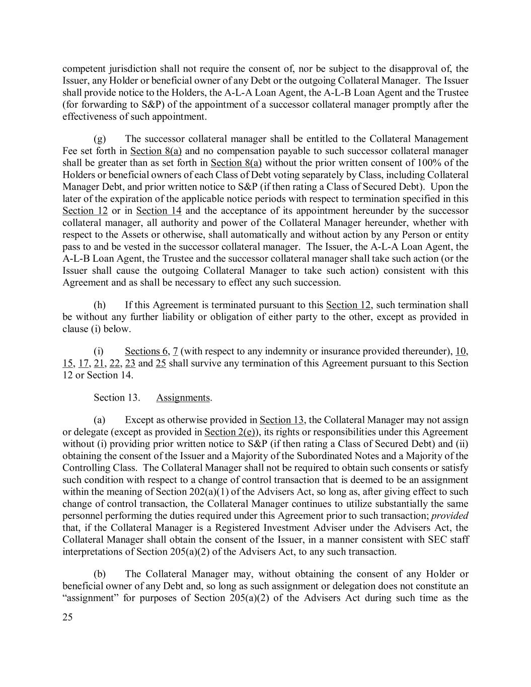 25 competent jurisdiction shall not require the consent of, nor be subject to the disapproval of, the Issuer, any Holder or beneficial owner of any Debt or the outgoing Collateral Manager. The Issuer shall provide notice to the Holders, the A-L-A Loan Agent, the A-L-B Loan Agent and the Trustee (for forwarding to S&P) of the appointment of a successor collateral manager promptly after the effectiveness of such appointment. (g) The successor collateral manager shall be entitled to the Collateral Management Fee set forth in Section 8(a) and no compensation payable to such successor collateral manager shall be greater than as set forth in Section 8(a) without the prior written consent of 100% of the Holders or beneficial owners of each Class of Debt voting separately by Class, including Collateral Manager Debt, and prior written notice to S&P (if then rating a Class of Secured Debt). Upon the later of the expiration of the applicable notice periods with respect to termination specified in this Section 12 or in Section 14 and the acceptance of its appointment hereunder by the successor collateral manager, all authority and power of the Collateral Manager hereunder, whether with respect to the Assets or otherwise, shall automatically and without action by any Person or entity pass to and be vested in the successor collateral manager. The Issuer, the A-L-A Loan Agent, the A-L-B Loan Agent, the Trustee and the successor collateral manager shall take such action (or the Issuer shall cause the outgoing Collateral Manager to take such action) consistent with this Agreement and as shall be necessary to effect any such succession. (h) If this Agreement is terminated pursuant to this Section 12, such termination shall be without any further liability or obligation of either party to the other, except as provided in clause (i) below. (i) Sections 6, 7 (with respect to any indemnity or insurance provided thereunder), 10, 15, 17, 21, 22, 23 and 25 shall survive any termination of this Agreement pursuant to this Section 12 or Section 14. Section 13. Assignments. (a) Except as otherwise provided in Section 13, the Collateral Manager may not assign or delegate (except as provided in Section 2(e)), its rights or responsibilities under this Agreement without (i) providing prior written notice to S&P (if then rating a Class of Secured Debt) and (ii) obtaining the consent of the Issuer and a Majority of the Subordinated Notes and a Majority of the Controlling Class. The Collateral Manager shall not be required to obtain such consents or satisfy such condition with respect to a change of control transaction that is deemed to be an assignment within the meaning of Section 202(a)(1) of the Advisers Act, so long as, after giving effect to such change of control transaction, the Collateral Manager continues to utilize substantially the same personnel performing the duties required under this Agreement prior to such transaction; provided that, if the Collateral Manager is a Registered Investment Adviser under the Advisers Act, the Collateral Manager shall obtain the consent of the Issuer, in a manner consistent with SEC staff interpretations of Section 205(a)(2) of the Advisers Act, to any such transaction. (b) The Collateral Manager may, without obtaining the consent of any Holder or beneficial owner of any Debt and, so long as such assignment or delegation does not constitute an “assignment” for purposes of Section 205(a)(2) of the Advisers Act during such time as the