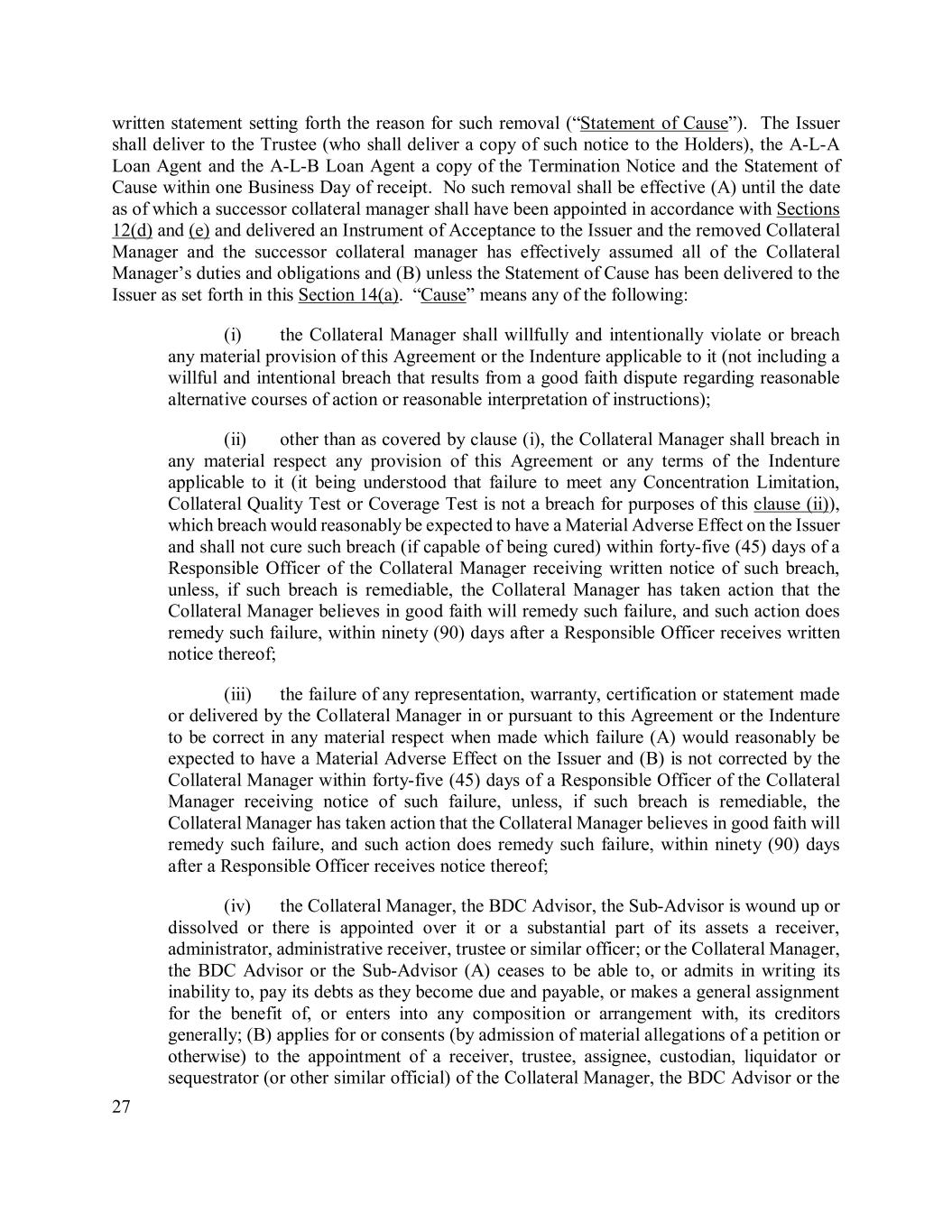 27 written statement setting forth the reason for such removal (“Statement of Cause”). The Issuer shall deliver to the Trustee (who shall deliver a copy of such notice to the Holders), the A-L-A Loan Agent and the A-L-B Loan Agent a copy of the Termination Notice and the Statement of Cause within one Business Day of receipt. No such removal shall be effective (A) until the date as of which a successor collateral manager shall have been appointed in accordance with Sections 12(d) and (e) and delivered an Instrument of Acceptance to the Issuer and the removed Collateral Manager and the successor collateral manager has effectively assumed all of the Collateral Manager’s duties and obligations and (B) unless the Statement of Cause has been delivered to the Issuer as set forth in this Section 14(a). “Cause” means any of the following: (i) the Collateral Manager shall willfully and intentionally violate or breach any material provision of this Agreement or the Indenture applicable to it (not including a willful and intentional breach that results from a good faith dispute regarding reasonable alternative courses of action or reasonable interpretation of instructions); (ii) other than as covered by clause (i), the Collateral Manager shall breach in any material respect any provision of this Agreement or any terms of the Indenture applicable to it (it being understood that failure to meet any Concentration Limitation, Collateral Quality Test or Coverage Test is not a breach for purposes of this clause (ii)), which breach would reasonably be expected to have a Material Adverse Effect on the Issuer and shall not cure such breach (if capable of being cured) within forty-five (45) days of a Responsible Officer of the Collateral Manager receiving written notice of such breach, unless, if such breach is remediable, the Collateral Manager has taken action that the Collateral Manager believes in good faith will remedy such failure, and such action does remedy such failure, within ninety (90) days after a Responsible Officer receives written notice thereof; (iii) the failure of any representation, warranty, certification or statement made or delivered by the Collateral Manager in or pursuant to this Agreement or the Indenture to be correct in any material respect when made which failure (A) would reasonably be expected to have a Material Adverse Effect on the Issuer and (B) is not corrected by the Collateral Manager within forty-five (45) days of a Responsible Officer of the Collateral Manager receiving notice of such failure, unless, if such breach is remediable, the Collateral Manager has taken action that the Collateral Manager believes in good faith will remedy such failure, and such action does remedy such failure, within ninety (90) days after a Responsible Officer receives notice thereof; (iv) the Collateral Manager, the BDC Advisor, the Sub-Advisor is wound up or dissolved or there is appointed over it or a substantial part of its assets a receiver, administrator, administrative receiver, trustee or similar officer; or the Collateral Manager, the BDC Advisor or the Sub-Advisor (A) ceases to be able to, or admits in writing its inability to, pay its debts as they become due and payable, or makes a general assignment for the benefit of, or enters into any composition or arrangement with, its creditors generally; (B) applies for or consents (by admission of material allegations of a petition or otherwise) to the appointment of a receiver, trustee, assignee, custodian, liquidator or sequestrator (or other similar official) of the Collateral Manager, the BDC Advisor or the