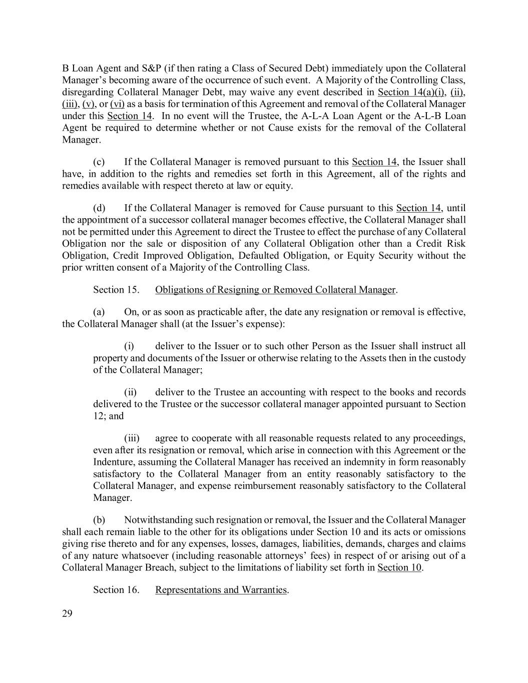 29 B Loan Agent and S&P (if then rating a Class of Secured Debt) immediately upon the Collateral Manager’s becoming aware of the occurrence of such event. A Majority of the Controlling Class, disregarding Collateral Manager Debt, may waive any event described in Section 14(a)(i), (ii), (iii), (v), or (vi) as a basis for termination of this Agreement and removal of the Collateral Manager under this Section 14. In no event will the Trustee, the A-L-A Loan Agent or the A-L-B Loan Agent be required to determine whether or not Cause exists for the removal of the Collateral Manager. (c) If the Collateral Manager is removed pursuant to this Section 14, the Issuer shall have, in addition to the rights and remedies set forth in this Agreement, all of the rights and remedies available with respect thereto at law or equity. (d) If the Collateral Manager is removed for Cause pursuant to this Section 14, until the appointment of a successor collateral manager becomes effective, the Collateral Manager shall not be permitted under this Agreement to direct the Trustee to effect the purchase of any Collateral Obligation nor the sale or disposition of any Collateral Obligation other than a Credit Risk Obligation, Credit Improved Obligation, Defaulted Obligation, or Equity Security without the prior written consent of a Majority of the Controlling Class. Section 15. Obligations of Resigning or Removed Collateral Manager. (a) On, or as soon as practicable after, the date any resignation or removal is effective, the Collateral Manager shall (at the Issuer’s expense): (i) deliver to the Issuer or to such other Person as the Issuer shall instruct all property and documents of the Issuer or otherwise relating to the Assets then in the custody of the Collateral Manager; (ii) deliver to the Trustee an accounting with respect to the books and records delivered to the Trustee or the successor collateral manager appointed pursuant to Section 12; and (iii) agree to cooperate with all reasonable requests related to any proceedings, even after its resignation or removal, which arise in connection with this Agreement or the Indenture, assuming the Collateral Manager has received an indemnity in form reasonably satisfactory to the Collateral Manager from an entity reasonably satisfactory to the Collateral Manager, and expense reimbursement reasonably satisfactory to the Collateral Manager. (b) Notwithstanding such resignation or removal, the Issuer and the Collateral Manager shall each remain liable to the other for its obligations under Section 10 and its acts or omissions giving rise thereto and for any expenses, losses, damages, liabilities, demands, charges and claims of any nature whatsoever (including reasonable attorneys’ fees) in respect of or arising out of a Collateral Manager Breach, subject to the limitations of liability set forth in Section 10. Section 16. Representations and Warranties.
