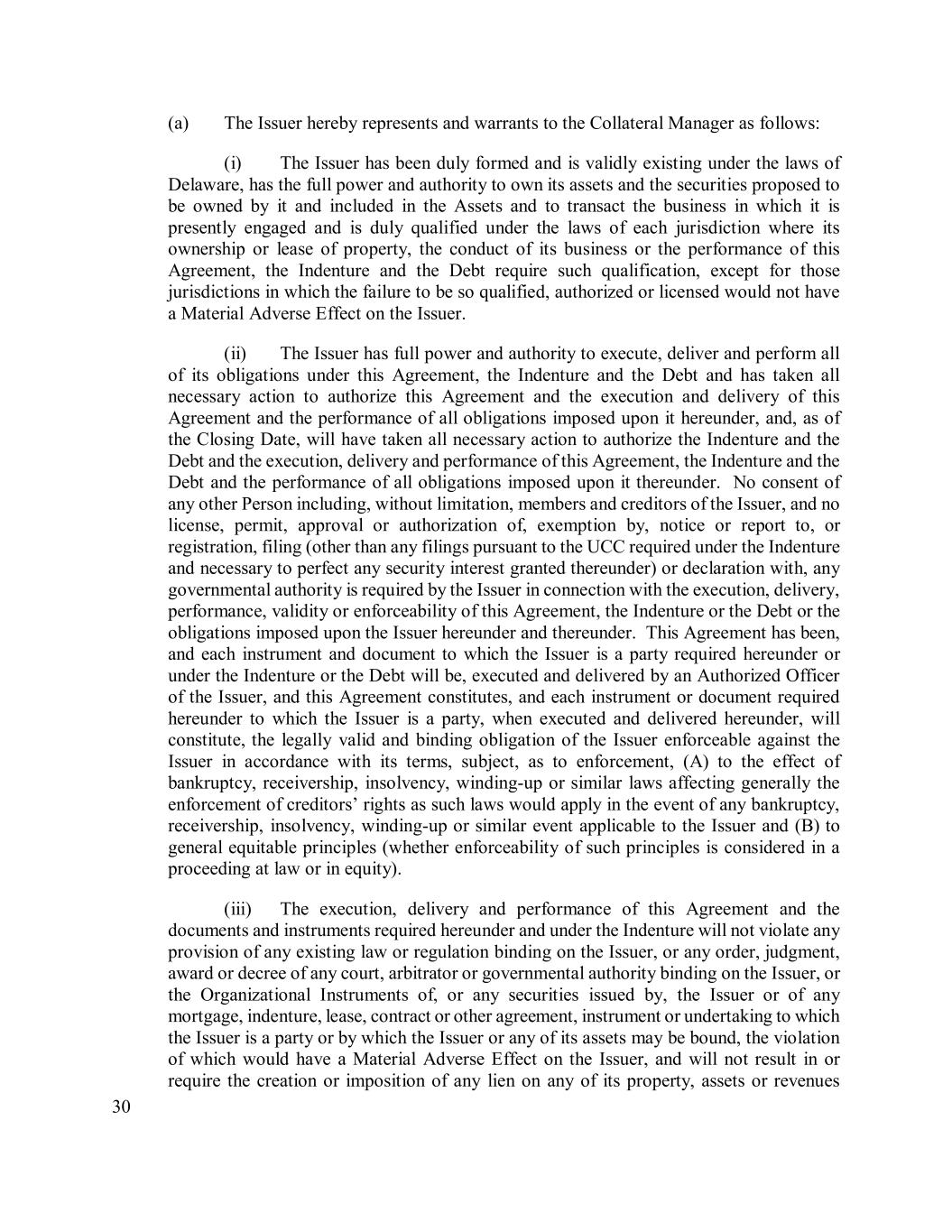 30 (a) The Issuer hereby represents and warrants to the Collateral Manager as follows: (i) The Issuer has been duly formed and is validly existing under the laws of Delaware, has the full power and authority to own its assets and the securities proposed to be owned by it and included in the Assets and to transact the business in which it is presently engaged and is duly qualified under the laws of each jurisdiction where its ownership or lease of property, the conduct of its business or the performance of this Agreement, the Indenture and the Debt require such qualification, except for those jurisdictions in which the failure to be so qualified, authorized or licensed would not have a Material Adverse Effect on the Issuer. (ii) The Issuer has full power and authority to execute, deliver and perform all of its obligations under this Agreement, the Indenture and the Debt and has taken all necessary action to authorize this Agreement and the execution and delivery of this Agreement and the performance of all obligations imposed upon it hereunder, and, as of the Closing Date, will have taken all necessary action to authorize the Indenture and the Debt and the execution, delivery and performance of this Agreement, the Indenture and the Debt and the performance of all obligations imposed upon it thereunder. No consent of any other Person including, without limitation, members and creditors of the Issuer, and no license, permit, approval or authorization of, exemption by, notice or report to, or registration, filing (other than any filings pursuant to the UCC required under the Indenture and necessary to perfect any security interest granted thereunder) or declaration with, any governmental authority is required by the Issuer in connection with the execution, delivery, performance, validity or enforceability of this Agreement, the Indenture or the Debt or the obligations imposed upon the Issuer hereunder and thereunder. This Agreement has been, and each instrument and document to which the Issuer is a party required hereunder or under the Indenture or the Debt will be, executed and delivered by an Authorized Officer of the Issuer, and this Agreement constitutes, and each instrument or document required hereunder to which the Issuer is a party, when executed and delivered hereunder, will constitute, the legally valid and binding obligation of the Issuer enforceable against the Issuer in accordance with its terms, subject, as to enforcement, (A) to the effect of bankruptcy, receivership, insolvency, winding-up or similar laws affecting generally the enforcement of creditors’ rights as such laws would apply in the event of any bankruptcy, receivership, insolvency, winding-up or similar event applicable to the Issuer and (B) to general equitable principles (whether enforceability of such principles is considered in a proceeding at law or in equity). (iii) The execution, delivery and performance of this Agreement and the documents and instruments required hereunder and under the Indenture will not violate any provision of any existing law or regulation binding on the Issuer, or any order, judgment, award or decree of any court, arbitrator or governmental authority binding on the Issuer, or the Organizational Instruments of, or any securities issued by, the Issuer or of any mortgage, indenture, lease, contract or other agreement, instrument or undertaking to which the Issuer is a party or by which the Issuer or any of its assets may be bound, the violation of which would have a Material Adverse Effect on the Issuer, and will not result in or require the creation or imposition of any lien on any of its property, assets or revenues