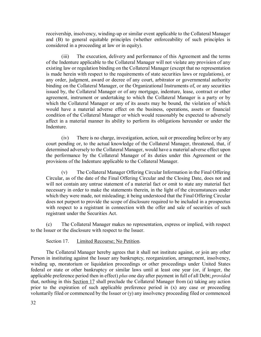 32 receivership, insolvency, winding-up or similar event applicable to the Collateral Manager and (B) to general equitable principles (whether enforceability of such principles is considered in a proceeding at law or in equity). (iii) The execution, delivery and performance of this Agreement and the terms of the Indenture applicable to the Collateral Manager will not violate any provision of any existing law or regulation binding on the Collateral Manager (except that no representation is made herein with respect to the requirements of state securities laws or regulations), or any order, judgment, award or decree of any court, arbitrator or governmental authority binding on the Collateral Manager, or the Organizational Instruments of, or any securities issued by, the Collateral Manager or of any mortgage, indenture, lease, contract or other agreement, instrument or undertaking to which the Collateral Manager is a party or by which the Collateral Manager or any of its assets may be bound, the violation of which would have a material adverse effect on the business, operations, assets or financial condition of the Collateral Manager or which would reasonably be expected to adversely affect in a material manner its ability to perform its obligations hereunder or under the Indenture. (iv) There is no charge, investigation, action, suit or proceeding before or by any court pending or, to the actual knowledge of the Collateral Manager, threatened, that, if determined adversely to the Collateral Manager, would have a material adverse effect upon the performance by the Collateral Manager of its duties under this Agreement or the provisions of the Indenture applicable to the Collateral Manager. (v) The Collateral Manager Offering Circular Information in the Final Offering Circular, as of the date of the Final Offering Circular and the Closing Date, does not and will not contain any untrue statement of a material fact or omit to state any material fact necessary in order to make the statements therein, in the light of the circumstances under which they were made, not misleading; it being understood that the Final Offering Circular does not purport to provide the scope of disclosure required to be included in a prospectus with respect to a registrant in connection with the offer and sale of securities of such registrant under the Securities Act. (c) The Collateral Manager makes no representation, express or implied, with respect to the Issuer or the disclosure with respect to the Issuer. Section 17. Limited Recourse; No Petition. The Collateral Manager hereby agrees that it shall not institute against, or join any other Person in instituting against the Issuer any bankruptcy, reorganization, arrangement, insolvency, winding up, moratorium or liquidation proceedings or other proceedings under United States federal or state or other bankruptcy or similar laws until at least one year (or, if longer, the applicable preference period then in effect) plus one day after payment in full of all Debt; provided that, nothing in this Section 17 shall preclude the Collateral Manager from (a) taking any action prior to the expiration of such applicable preference period in (x) any case or proceeding voluntarily filed or commenced by the Issuer or (y) any insolvency proceeding filed or commenced