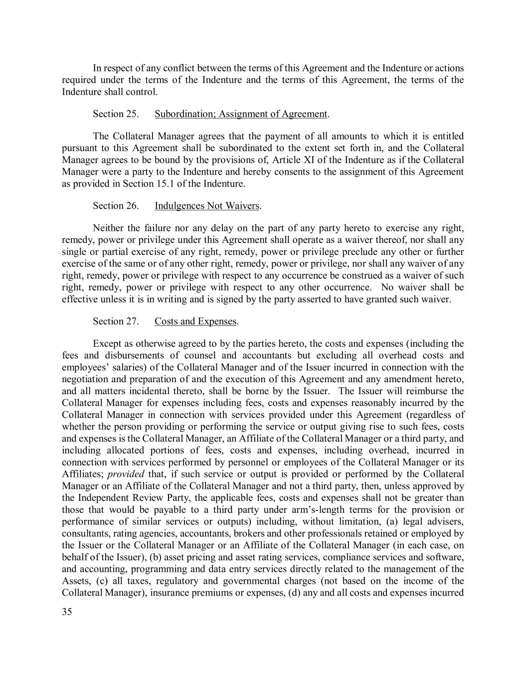 35 In respect of any conflict between the terms of this Agreement and the Indenture or actions required under the terms of the Indenture and the terms of this Agreement, the terms of the Indenture shall control. Section 25. Subordination; Assignment of Agreement. The Collateral Manager agrees that the payment of all amounts to which it is entitled pursuant to this Agreement shall be subordinated to the extent set forth in, and the Collateral Manager agrees to be bound by the provisions of, Article XI of the Indenture as if the Collateral Manager were a party to the Indenture and hereby consents to the assignment of this Agreement as provided in Section 15.1 of the Indenture. Section 26. Indulgences Not Waivers. Neither the failure nor any delay on the part of any party hereto to exercise any right, remedy, power or privilege under this Agreement shall operate as a waiver thereof, nor shall any single or partial exercise of any right, remedy, power or privilege preclude any other or further exercise of the same or of any other right, remedy, power or privilege, nor shall any waiver of any right, remedy, power or privilege with respect to any occurrence be construed as a waiver of such right, remedy, power or privilege with respect to any other occurrence. No waiver shall be effective unless it is in writing and is signed by the party asserted to have granted such waiver. Section 27. Costs and Expenses. Except as otherwise agreed to by the parties hereto, the costs and expenses (including the fees and disbursements of counsel and accountants but excluding all overhead costs and employees’ salaries) of the Collateral Manager and of the Issuer incurred in connection with the negotiation and preparation of and the execution of this Agreement and any amendment hereto, and all matters incidental thereto, shall be borne by the Issuer. The Issuer will reimburse the Collateral Manager for expenses including fees, costs and expenses reasonably incurred by the Collateral Manager in connection with services provided under this Agreement (regardless of whether the person providing or performing the service or output giving rise to such fees, costs and expenses is the Collateral Manager, an Affiliate of the Collateral Manager or a third party, and including allocated portions of fees, costs and expenses, including overhead, incurred in connection with services performed by personnel or employees of the Collateral Manager or its Affiliates; provided that, if such service or output is provided or performed by the Collateral Manager or an Affiliate of the Collateral Manager and not a third party, then, unless approved by the Independent Review Party, the applicable fees, costs and expenses shall not be greater than those that would be payable to a third party under arm’s-length terms for the provision or performance of similar services or outputs) including, without limitation, (a) legal advisers, consultants, rating agencies, accountants, brokers and other professionals retained or employed by the Issuer or the Collateral Manager or an Affiliate of the Collateral Manager (in each case, on behalf of the Issuer), (b) asset pricing and asset rating services, compliance services and software, and accounting, programming and data entry services directly related to the management of the Assets, (c) all taxes, regulatory and governmental charges (not based on the income of the Collateral Manager), insurance premiums or expenses, (d) any and all costs and expenses incurred