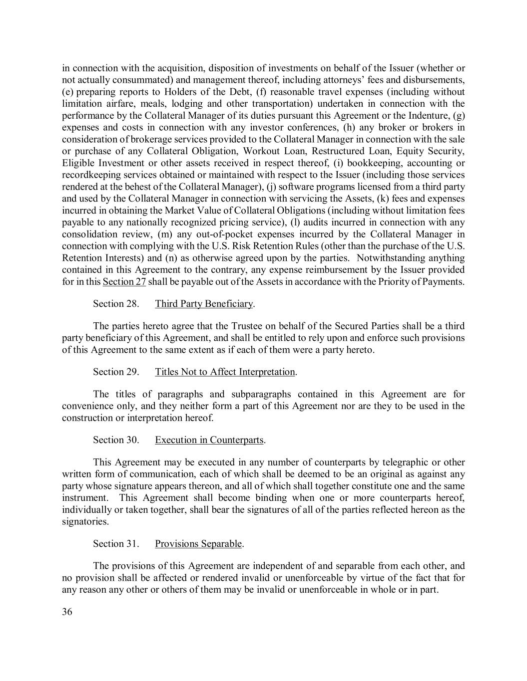 36 in connection with the acquisition, disposition of investments on behalf of the Issuer (whether or not actually consummated) and management thereof, including attorneys’ fees and disbursements, (e) preparing reports to Holders of the Debt, (f) reasonable travel expenses (including without limitation airfare, meals, lodging and other transportation) undertaken in connection with the performance by the Collateral Manager of its duties pursuant this Agreement or the Indenture, (g) expenses and costs in connection with any investor conferences, (h) any broker or brokers in consideration of brokerage services provided to the Collateral Manager in connection with the sale or purchase of any Collateral Obligation, Workout Loan, Restructured Loan, Equity Security, Eligible Investment or other assets received in respect thereof, (i) bookkeeping, accounting or recordkeeping services obtained or maintained with respect to the Issuer (including those services rendered at the behest of the Collateral Manager), (j) software programs licensed from a third party and used by the Collateral Manager in connection with servicing the Assets, (k) fees and expenses incurred in obtaining the Market Value of Collateral Obligations (including without limitation fees payable to any nationally recognized pricing service), (l) audits incurred in connection with any consolidation review, (m) any out-of-pocket expenses incurred by the Collateral Manager in connection with complying with the U.S. Risk Retention Rules (other than the purchase of the U.S. Retention Interests) and (n) as otherwise agreed upon by the parties. Notwithstanding anything contained in this Agreement to the contrary, any expense reimbursement by the Issuer provided for in this Section 27 shall be payable out of the Assets in accordance with the Priority of Payments. Section 28. Third Party Beneficiary. The parties hereto agree that the Trustee on behalf of the Secured Parties shall be a third party beneficiary of this Agreement, and shall be entitled to rely upon and enforce such provisions of this Agreement to the same extent as if each of them were a party hereto. Section 29. Titles Not to Affect Interpretation. The titles of paragraphs and subparagraphs contained in this Agreement are for convenience only, and they neither form a part of this Agreement nor are they to be used in the construction or interpretation hereof. Section 30. Execution in Counterparts. This Agreement may be executed in any number of counterparts by telegraphic or other written form of communication, each of which shall be deemed to be an original as against any party whose signature appears thereon, and all of which shall together constitute one and the same instrument. This Agreement shall become binding when one or more counterparts hereof, individually or taken together, shall bear the signatures of all of the parties reflected hereon as the signatories. Section 31. Provisions Separable. The provisions of this Agreement are independent of and separable from each other, and no provision shall be affected or rendered invalid or unenforceable by virtue of the fact that for any reason any other or others of them may be invalid or unenforceable in whole or in part.