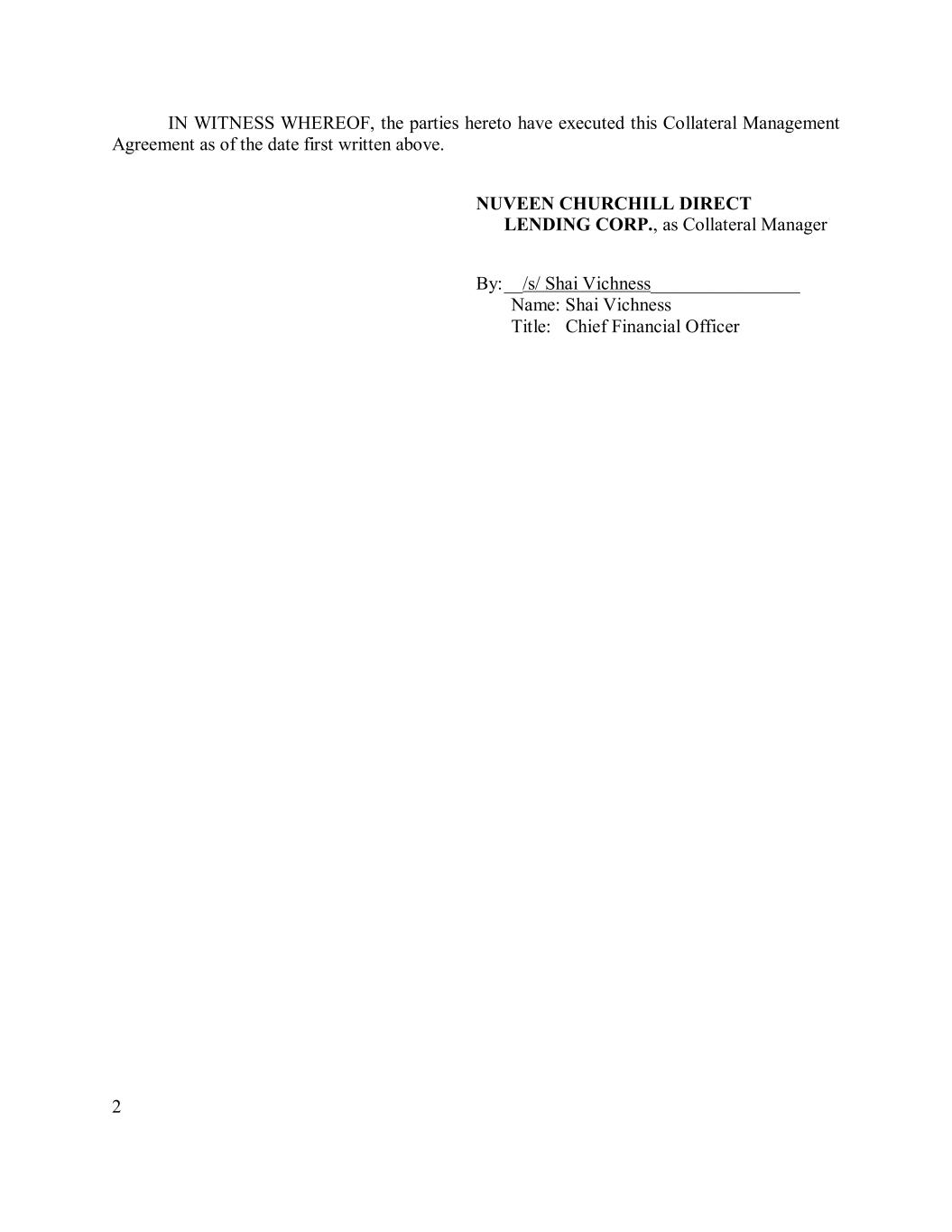 2 IN WITNESS WHEREOF, the parties hereto have executed this Collateral Management Agreement as of the date first written above. NUVEEN CHURCHILL DIRECT LENDING CORP., as Collateral Manager By: __/s/ Shai Vichness________________ Name: Shai Vichness Title: Chief Financial Officer