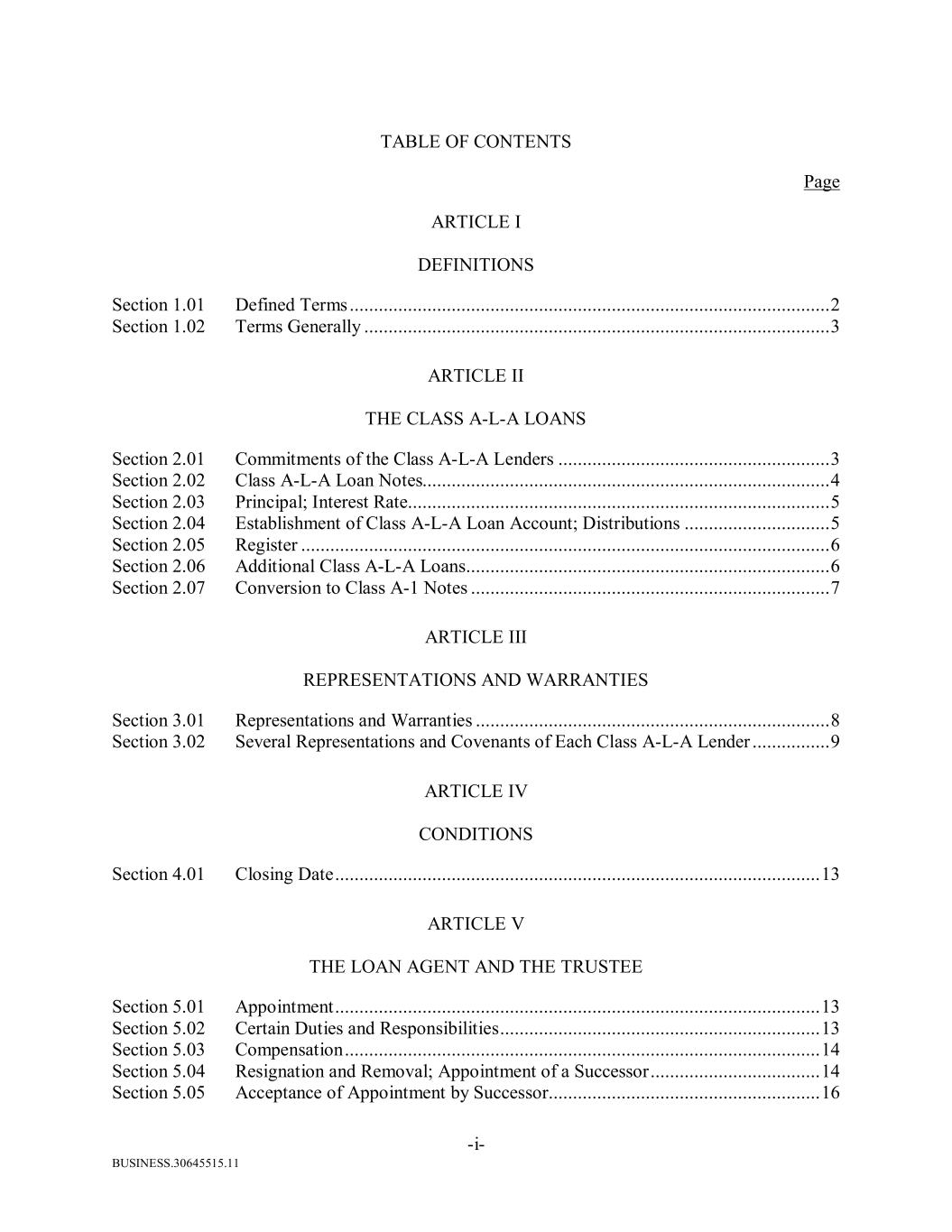 BUSINESS.30645515.11 -i- TABLE OF CONTENTS Page ARTICLE I DEFINITIONS Section 1.01 Defined Terms ................................................................................................... 2 Section 1.02 Terms Generally ................................................................................................ 3 ARTICLE II THE CLASS A-L-A LOANS Section 2.01 Commitments of the Class A-L-A Lenders ........................................................ 3 Section 2.02 Class A-L-A Loan Notes.................................................................................... 4 Section 2.03 Principal; Interest Rate ....................................................................................... 5 Section 2.04 Establishment of Class A-L-A Loan Account; Distributions .............................. 5 Section 2.05 Register ............................................................................................................. 6 Section 2.06 Additional Class A-L-A Loans........................................................................... 6 Section 2.07 Conversion to Class A-1 Notes .......................................................................... 7 ARTICLE III REPRESENTATIONS AND WARRANTIES Section 3.01 Representations and Warranties ......................................................................... 8 Section 3.02 Several Representations and Covenants of Each Class A-L-A Lender ................ 9 ARTICLE IV CONDITIONS Section 4.01 Closing Date .................................................................................................... 13 ARTICLE V THE LOAN AGENT AND THE TRUSTEE Section 5.01 Appointment .................................................................................................... 13 Section 5.02 Certain Duties and Responsibilities .................................................................. 13 Section 5.03 Compensation .................................................................................................. 14 Section 5.04 Resignation and Removal; Appointment of a Successor ................................... 14 Section 5.05 Acceptance of Appointment by Successor ........................................................ 16