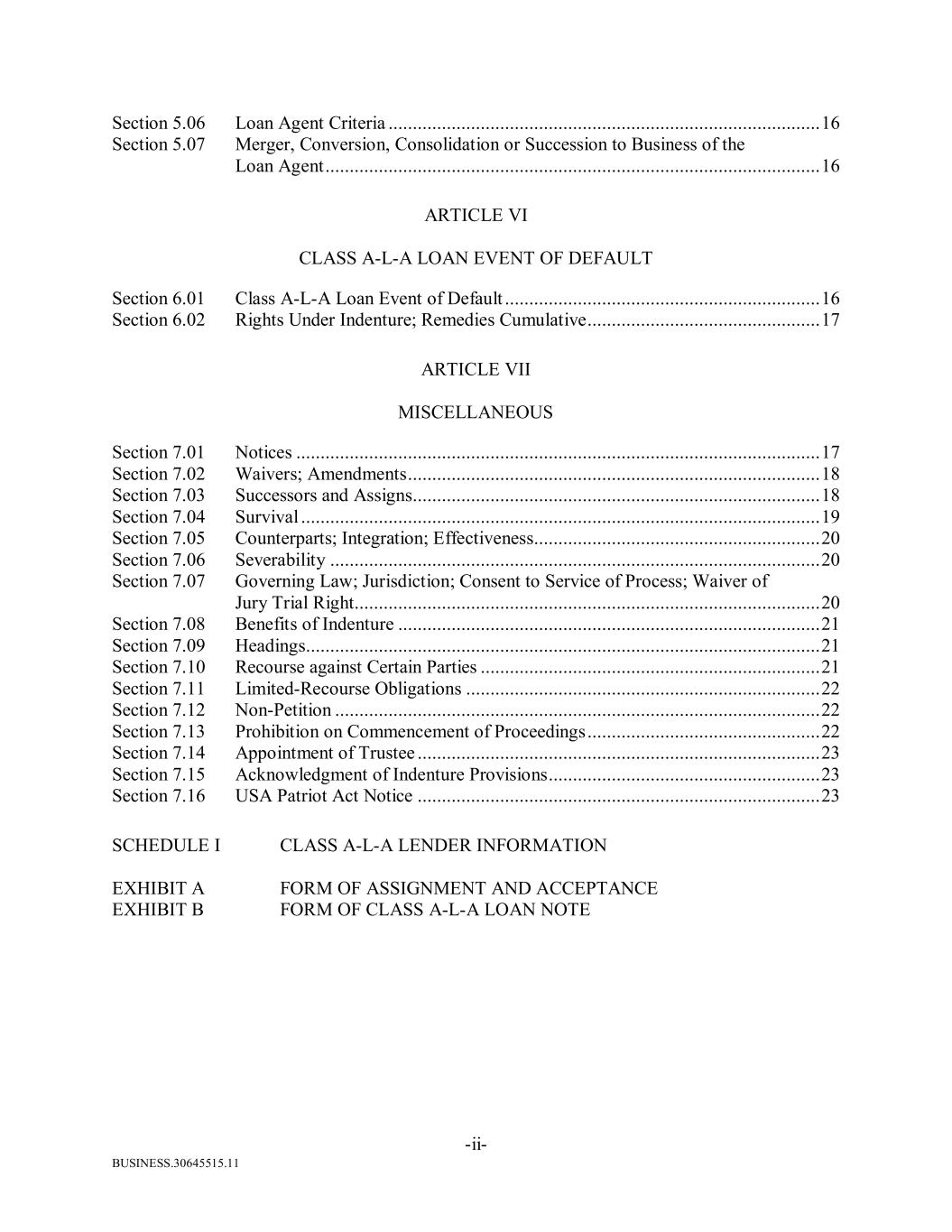 BUSINESS.30645515.11 -ii- Section 5.06 Loan Agent Criteria ......................................................................................... 16 Section 5.07 Merger, Conversion, Consolidation or Succession to Business of the Loan Agent ...................................................................................................... 16 ARTICLE VI CLASS A-L-A LOAN EVENT OF DEFAULT Section 6.01 Class A-L-A Loan Event of Default ................................................................. 16 Section 6.02 Rights Under Indenture; Remedies Cumulative ................................................ 17 ARTICLE VII MISCELLANEOUS Section 7.01 Notices ............................................................................................................ 17 Section 7.02 Waivers; Amendments ..................................................................................... 18 Section 7.03 Successors and Assigns.................................................................................... 18 Section 7.04 Survival ........................................................................................................... 19 Section 7.05 Counterparts; Integration; Effectiveness........................................................... 20 Section 7.06 Severability ..................................................................................................... 20 Section 7.07 Governing Law; Jurisdiction; Consent to Service of Process; Waiver of Jury Trial Right................................................................................................ 20 Section 7.08 Benefits of Indenture ....................................................................................... 21 Section 7.09 Headings.......................................................................................................... 21 Section 7.10 Recourse against Certain Parties ...................................................................... 21 Section 7.11 Limited-Recourse Obligations ......................................................................... 22 Section 7.12 Non-Petition .................................................................................................... 22 Section 7.13 Prohibition on Commencement of Proceedings ................................................ 22 Section 7.14 Appointment of Trustee ................................................................................... 23 Section 7.15 Acknowledgment of Indenture Provisions ........................................................ 23 Section 7.16 USA Patriot Act Notice ................................................................................... 23 SCHEDULE I CLASS A-L-A LENDER INFORMATION EXHIBIT A FORM OF ASSIGNMENT AND ACCEPTANCE EXHIBIT B FORM OF CLASS A-L-A LOAN NOTE