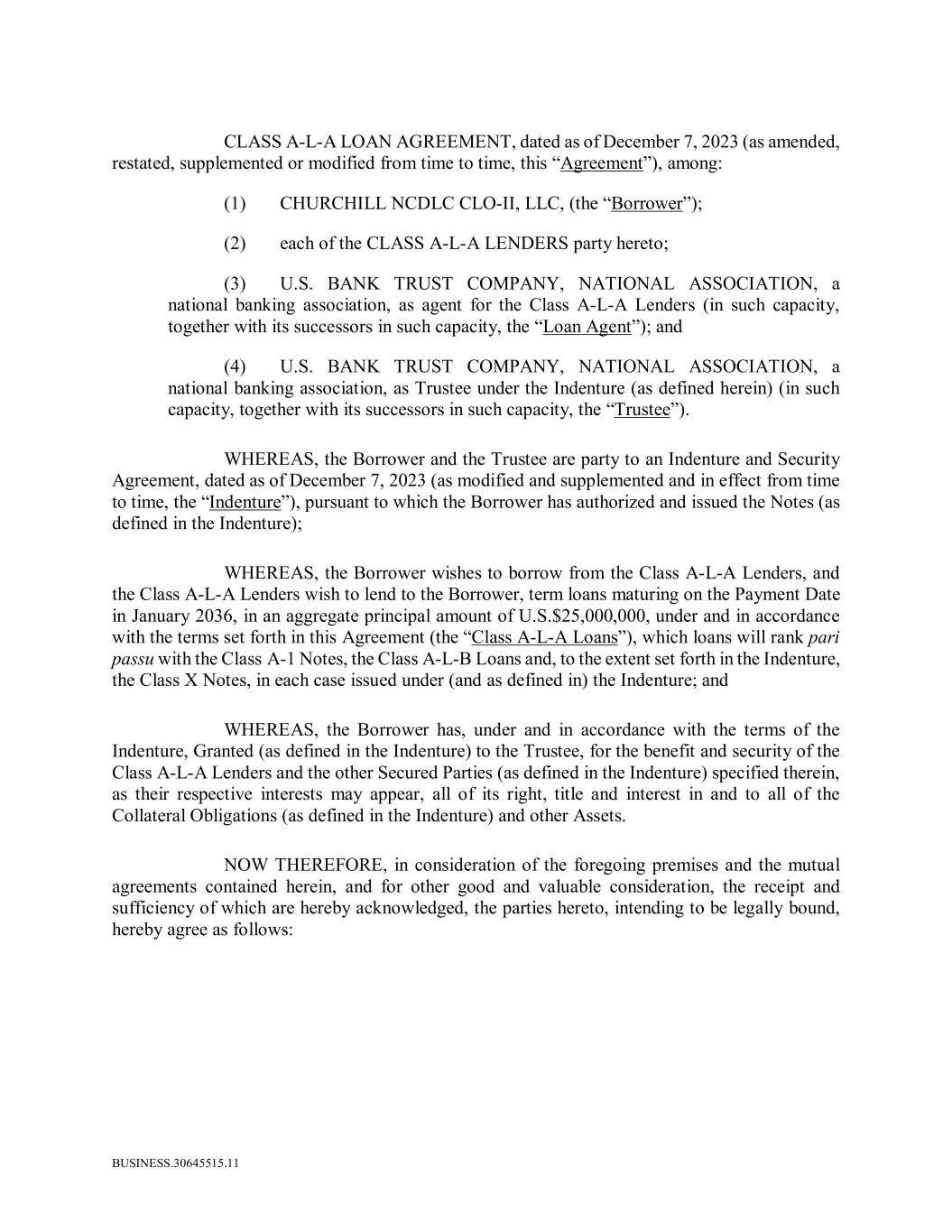 BUSINESS.30645515.11 CLASS A-L-A LOAN AGREEMENT, dated as of December 7, 2023 (as amended, restated, supplemented or modified from time to time, this “Agreement”), among: (1) CHURCHILL NCDLC CLO-II, LLC, (the “Borrower”); (2) each of the CLASS A-L-A LENDERS party hereto; (3) U.S. BANK TRUST COMPANY, NATIONAL ASSOCIATION, a national banking association, as agent for the Class A-L-A Lenders (in such capacity, together with its successors in such capacity, the “Loan Agent”); and (4) U.S. BANK TRUST COMPANY, NATIONAL ASSOCIATION, a national banking association, as Trustee under the Indenture (as defined herein) (in such capacity, together with its successors in such capacity, the “Trustee”). WHEREAS, the Borrower and the Trustee are party to an Indenture and Security Agreement, dated as of December 7, 2023 (as modified and supplemented and in effect from time to time, the “Indenture”), pursuant to which the Borrower has authorized and issued the Notes (as defined in the Indenture); WHEREAS, the Borrower wishes to borrow from the Class A-L-A Lenders, and the Class A-L-A Lenders wish to lend to the Borrower, term loans maturing on the Payment Date in January 2036, in an aggregate principal amount of U.S.$25,000,000, under and in accordance with the terms set forth in this Agreement (the “Class A-L-A Loans”), which loans will rank pari passu with the Class A-1 Notes, the Class A-L-B Loans and, to the extent set forth in the Indenture, the Class X Notes, in each case issued under (and as defined in) the Indenture; and WHEREAS, the Borrower has, under and in accordance with the terms of the Indenture, Granted (as defined in the Indenture) to the Trustee, for the benefit and security of the Class A-L-A Lenders and the other Secured Parties (as defined in the Indenture) specified therein, as their respective interests may appear, all of its right, title and interest in and to all of the Collateral Obligations (as defined in the Indenture) and other Assets. NOW THEREFORE, in consideration of the foregoing premises and the mutual agreements contained herein, and for other good and valuable consideration, the receipt and sufficiency of which are hereby acknowledged, the parties hereto, intending to be legally bound, hereby agree as follows: