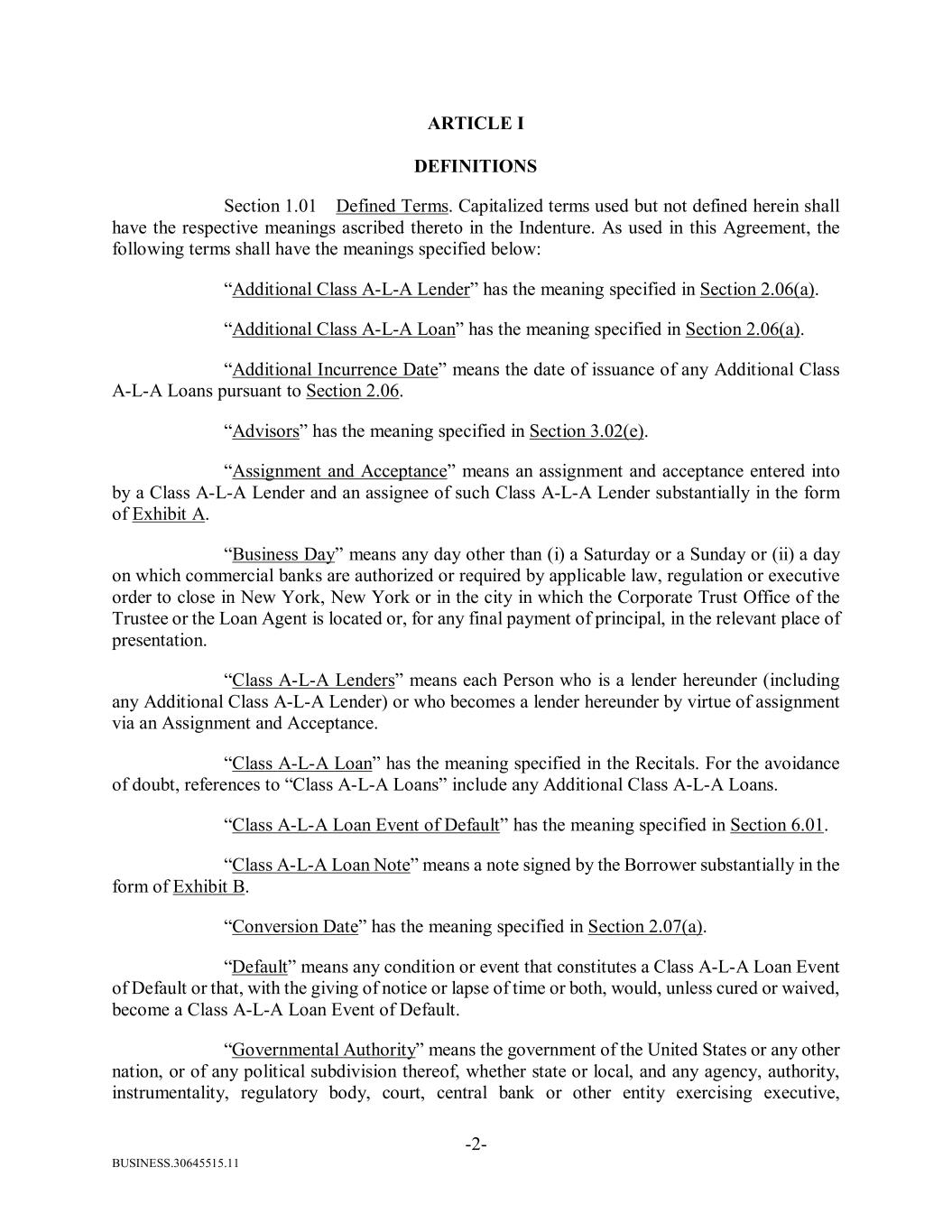 BUSINESS.30645515.11 -2- ARTICLE I DEFINITIONS Section 1.01 Defined Terms. Capitalized terms used but not defined herein shall have the respective meanings ascribed thereto in the Indenture. As used in this Agreement, the following terms shall have the meanings specified below: “Additional Class A-L-A Lender” has the meaning specified in Section 2.06(a). “Additional Class A-L-A Loan” has the meaning specified in Section 2.06(a). “Additional Incurrence Date” means the date of issuance of any Additional Class A-L-A Loans pursuant to Section 2.06. “Advisors” has the meaning specified in Section 3.02(e). “Assignment and Acceptance” means an assignment and acceptance entered into by a Class A-L-A Lender and an assignee of such Class A-L-A Lender substantially in the form of Exhibit A. “Business Day” means any day other than (i) a Saturday or a Sunday or (ii) a day on which commercial banks are authorized or required by applicable law, regulation or executive order to close in New York, New York or in the city in which the Corporate Trust Office of the Trustee or the Loan Agent is located or, for any final payment of principal, in the relevant place of presentation. “Class A-L-A Lenders” means each Person who is a lender hereunder (including any Additional Class A-L-A Lender) or who becomes a lender hereunder by virtue of assignment via an Assignment and Acceptance. “Class A-L-A Loan” has the meaning specified in the Recitals. For the avoidance of doubt, references to “Class A-L-A Loans” include any Additional Class A-L-A Loans. “Class A-L-A Loan Event of Default” has the meaning specified in Section 6.01. “Class A-L-A Loan Note” means a note signed by the Borrower substantially in the form of Exhibit B. “Conversion Date” has the meaning specified in Section 2.07(a). “Default” means any condition or event that constitutes a Class A-L-A Loan Event of Default or that, with the giving of notice or lapse of time or both, would, unless cured or waived, become a Class A-L-A Loan Event of Default. “Governmental Authority” means the government of the United States or any other nation, or of any political subdivision thereof, whether state or local, and any agency, authority, instrumentality, regulatory body, court, central bank or other entity exercising executive,