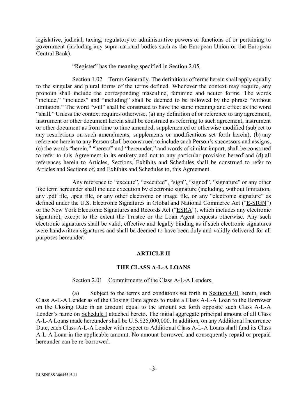 BUSINESS.30645515.11 -3- legislative, judicial, taxing, regulatory or administrative powers or functions of or pertaining to government (including any supra-national bodies such as the European Union or the European Central Bank). “Register” has the meaning specified in Section 2.05. Section 1.02 Terms Generally. The definitions of terms herein shall apply equally to the singular and plural forms of the terms defined. Whenever the context may require, any pronoun shall include the corresponding masculine, feminine and neuter forms. The words “include,” “includes” and “including” shall be deemed to be followed by the phrase “without limitation.” The word “will” shall be construed to have the same meaning and effect as the word “shall.” Unless the context requires otherwise, (a) any definition of or reference to any agreement, instrument or other document herein shall be construed as referring to such agreement, instrument or other document as from time to time amended, supplemented or otherwise modified (subject to any restrictions on such amendments, supplements or modifications set forth herein), (b) any reference herein to any Person shall be construed to include such Person’s successors and assigns, (c) the words “herein,” “hereof” and “hereunder,” and words of similar import, shall be construed to refer to this Agreement in its entirety and not to any particular provision hereof and (d) all references herein to Articles, Sections, Exhibits and Schedules shall be construed to refer to Articles and Sections of, and Exhibits and Schedules to, this Agreement. Any reference to “execute”, “executed”, “sign”, “signed”, “signature” or any other like term hereunder shall include execution by electronic signature (including, without limitation, any .pdf file, .jpeg file, or any other electronic or image file, or any “electronic signature” as defined under the U.S. Electronic Signatures in Global and National Commerce Act (“E-SIGN”) or the New York Electronic Signatures and Records Act (“ESRA”), which includes any electronic signature), except to the extent the Trustee or the Loan Agent requests otherwise. Any such electronic signatures shall be valid, effective and legally binding as if such electronic signatures were handwritten signatures and shall be deemed to have been duly and validly delivered for all purposes hereunder. ARTICLE II THE CLASS A-L-A LOANS Section 2.01 Commitments of the Class A-L-A Lenders. (a) Subject to the terms and conditions set forth in Section 4.01 herein, each Class A-L-A Lender as of the Closing Date agrees to make a Class A-L-A Loan to the Borrower on the Closing Date in an amount equal to the amount set forth opposite such Class A-L-A Lender’s name on Schedule I attached hereto. The initial aggregate principal amount of all Class A-L-A Loans made hereunder shall be U.S.$25,000,000. In addition, on any Additional Incurrence Date, each Class A-L-A Lender with respect to Additional Class A-L-A Loans shall fund its Class A-L-A Loan in the applicable amount. No amount borrowed and consequently repaid or prepaid hereunder can be re-borrowed.