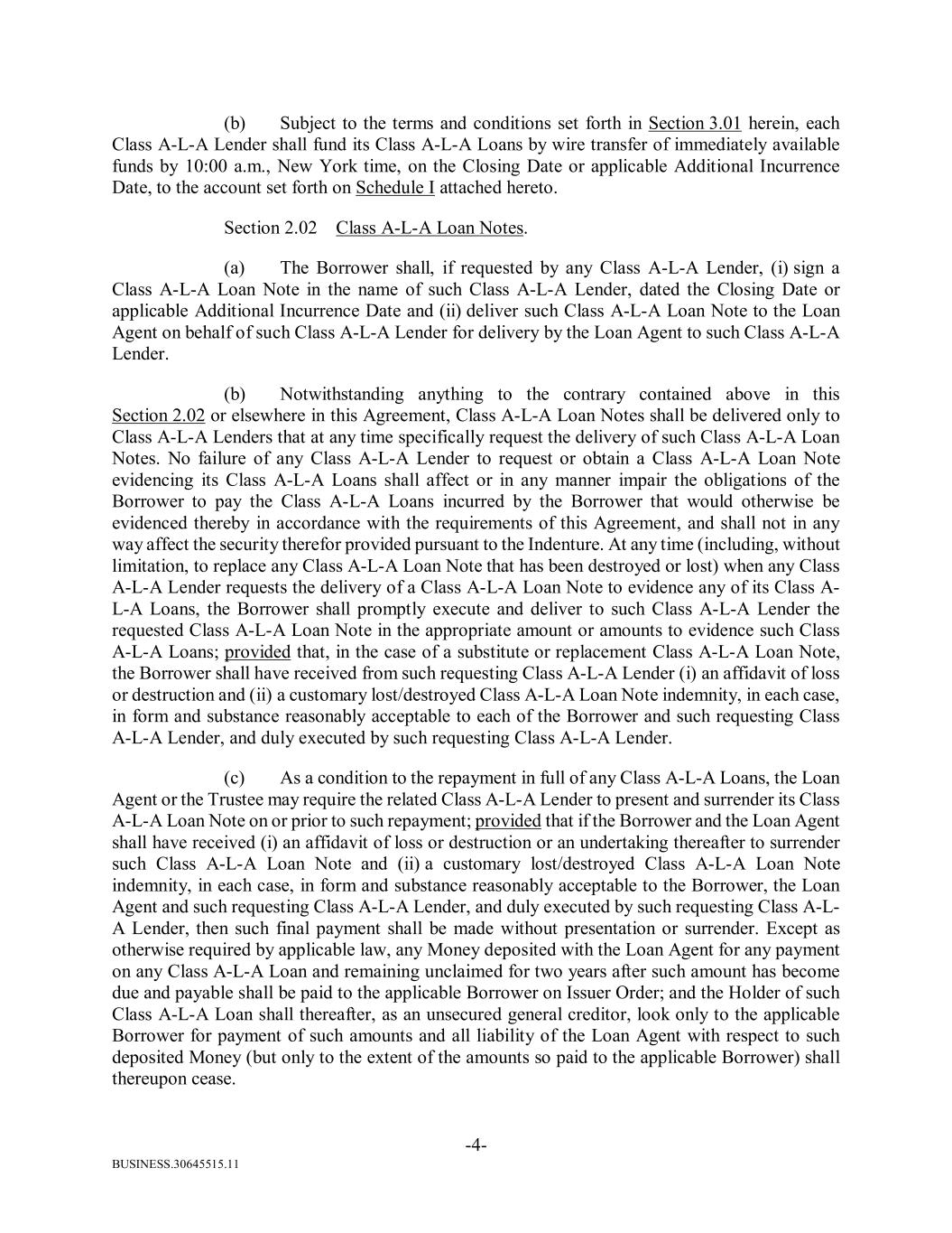 BUSINESS.30645515.11 -4- (b) Subject to the terms and conditions set forth in Section 3.01 herein, each Class A-L-A Lender shall fund its Class A-L-A Loans by wire transfer of immediately available funds by 10:00 a.m., New York time, on the Closing Date or applicable Additional Incurrence Date, to the account set forth on Schedule I attached hereto. Section 2.02 Class A-L-A Loan Notes. (a) The Borrower shall, if requested by any Class A-L-A Lender, (i) sign a Class A-L-A Loan Note in the name of such Class A-L-A Lender, dated the Closing Date or applicable Additional Incurrence Date and (ii) deliver such Class A-L-A Loan Note to the Loan Agent on behalf of such Class A-L-A Lender for delivery by the Loan Agent to such Class A-L-A Lender. (b) Notwithstanding anything to the contrary contained above in this Section 2.02 or elsewhere in this Agreement, Class A-L-A Loan Notes shall be delivered only to Class A-L-A Lenders that at any time specifically request the delivery of such Class A-L-A Loan Notes. No failure of any Class A-L-A Lender to request or obtain a Class A-L-A Loan Note evidencing its Class A-L-A Loans shall affect or in any manner impair the obligations of the Borrower to pay the Class A-L-A Loans incurred by the Borrower that would otherwise be evidenced thereby in accordance with the requirements of this Agreement, and shall not in any way affect the security therefor provided pursuant to the Indenture. At any time (including, without limitation, to replace any Class A-L-A Loan Note that has been destroyed or lost) when any Class A-L-A Lender requests the delivery of a Class A-L-A Loan Note to evidence any of its Class A- L-A Loans, the Borrower shall promptly execute and deliver to such Class A-L-A Lender the requested Class A-L-A Loan Note in the appropriate amount or amounts to evidence such Class A-L-A Loans; provided that, in the case of a substitute or replacement Class A-L-A Loan Note, the Borrower shall have received from such requesting Class A-L-A Lender (i) an affidavit of loss or destruction and (ii) a customary lost/destroyed Class A-L-A Loan Note indemnity, in each case, in form and substance reasonably acceptable to each of the Borrower and such requesting Class A-L-A Lender, and duly executed by such requesting Class A-L-A Lender. (c) As a condition to the repayment in full of any Class A-L-A Loans, the Loan Agent or the Trustee may require the related Class A-L-A Lender to present and surrender its Class A-L-A Loan Note on or prior to such repayment; provided that if the Borrower and the Loan Agent shall have received (i) an affidavit of loss or destruction or an undertaking thereafter to surrender such Class A-L-A Loan Note and (ii) a customary lost/destroyed Class A-L-A Loan Note indemnity, in each case, in form and substance reasonably acceptable to the Borrower, the Loan Agent and such requesting Class A-L-A Lender, and duly executed by such requesting Class A-L- A Lender, then such final payment shall be made without presentation or surrender. Except as otherwise required by applicable law, any Money deposited with the Loan Agent for any payment on any Class A-L-A Loan and remaining unclaimed for two years after such amount has become due and payable shall be paid to the applicable Borrower on Issuer Order; and the Holder of such Class A-L-A Loan shall thereafter, as an unsecured general creditor, look only to the applicable Borrower for payment of such amounts and all liability of the Loan Agent with respect to such deposited Money (but only to the extent of the amounts so paid to the applicable Borrower) shall thereupon cease.