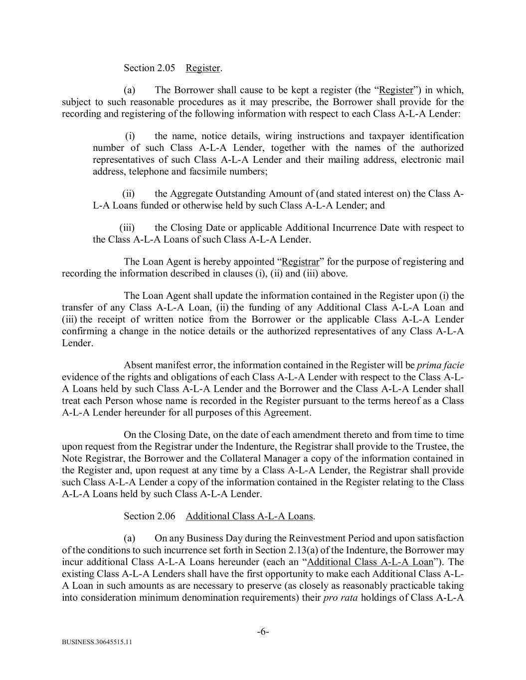 BUSINESS.30645515.11 -6- Section 2.05 Register. (a) The Borrower shall cause to be kept a register (the “Register”) in which, subject to such reasonable procedures as it may prescribe, the Borrower shall provide for the recording and registering of the following information with respect to each Class A-L-A Lender: (i) the name, notice details, wiring instructions and taxpayer identification number of such Class A-L-A Lender, together with the names of the authorized representatives of such Class A-L-A Lender and their mailing address, electronic mail address, telephone and facsimile numbers; (ii) the Aggregate Outstanding Amount of (and stated interest on) the Class A- L-A Loans funded or otherwise held by such Class A-L-A Lender; and (iii) the Closing Date or applicable Additional Incurrence Date with respect to the Class A-L-A Loans of such Class A-L-A Lender. The Loan Agent is hereby appointed “Registrar” for the purpose of registering and recording the information described in clauses (i), (ii) and (iii) above. The Loan Agent shall update the information contained in the Register upon (i) the transfer of any Class A-L-A Loan, (ii) the funding of any Additional Class A-L-A Loan and (iii) the receipt of written notice from the Borrower or the applicable Class A-L-A Lender confirming a change in the notice details or the authorized representatives of any Class A-L-A Lender. Absent manifest error, the information contained in the Register will be prima facie evidence of the rights and obligations of each Class A-L-A Lender with respect to the Class A-L- A Loans held by such Class A-L-A Lender and the Borrower and the Class A-L-A Lender shall treat each Person whose name is recorded in the Register pursuant to the terms hereof as a Class A-L-A Lender hereunder for all purposes of this Agreement. On the Closing Date, on the date of each amendment thereto and from time to time upon request from the Registrar under the Indenture, the Registrar shall provide to the Trustee, the Note Registrar, the Borrower and the Collateral Manager a copy of the information contained in the Register and, upon request at any time by a Class A-L-A Lender, the Registrar shall provide such Class A-L-A Lender a copy of the information contained in the Register relating to the Class A-L-A Loans held by such Class A-L-A Lender. Section 2.06 Additional Class A-L-A Loans. (a) On any Business Day during the Reinvestment Period and upon satisfaction of the conditions to such incurrence set forth in Section 2.13(a) of the Indenture, the Borrower may incur additional Class A-L-A Loans hereunder (each an “Additional Class A-L-A Loan”). The existing Class A-L-A Lenders shall have the first opportunity to make each Additional Class A-L- A Loan in such amounts as are necessary to preserve (as closely as reasonably practicable taking into consideration minimum denomination requirements) their pro rata holdings of Class A-L-A